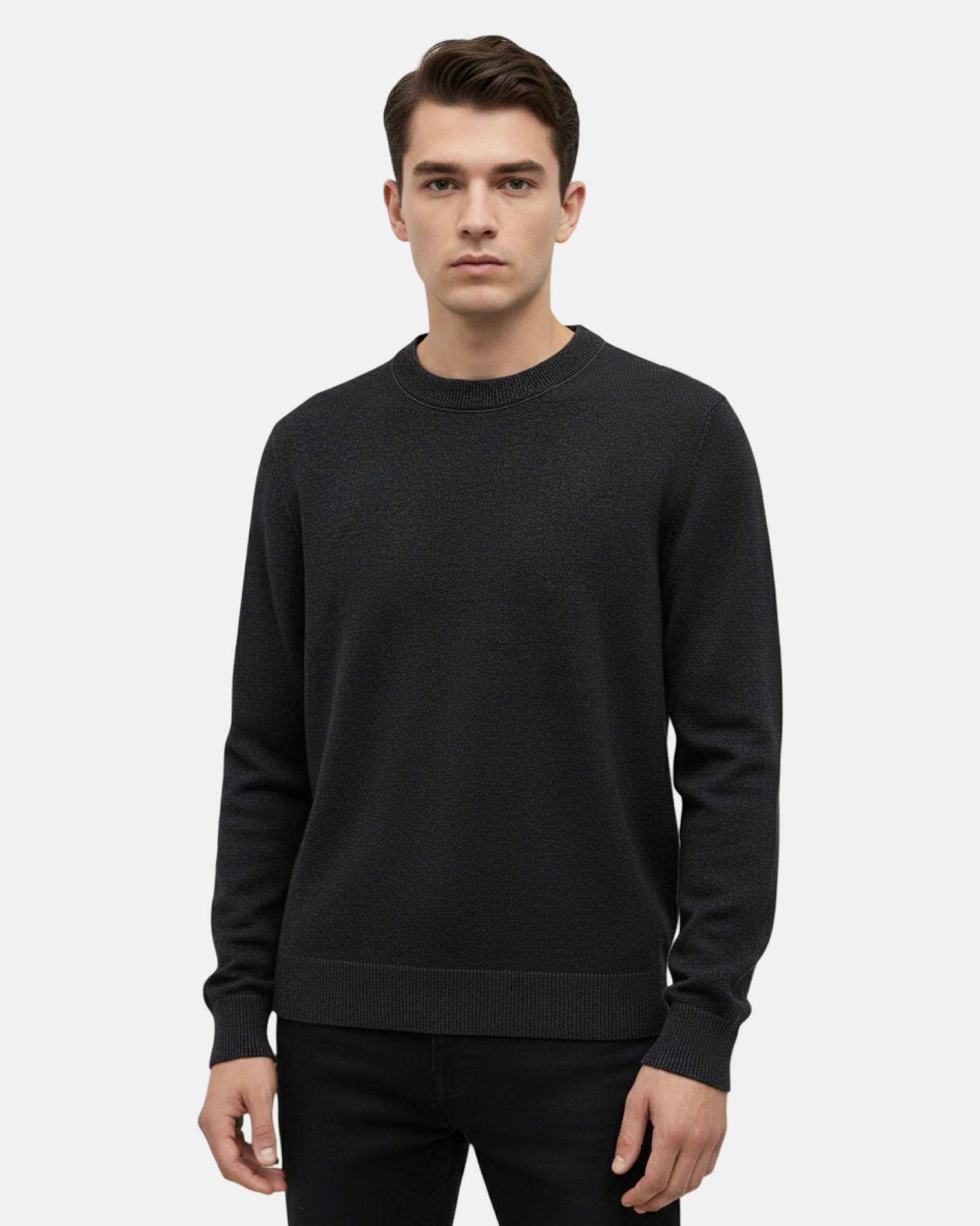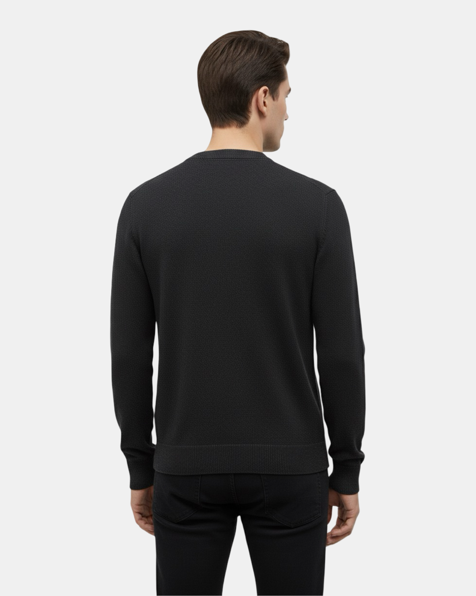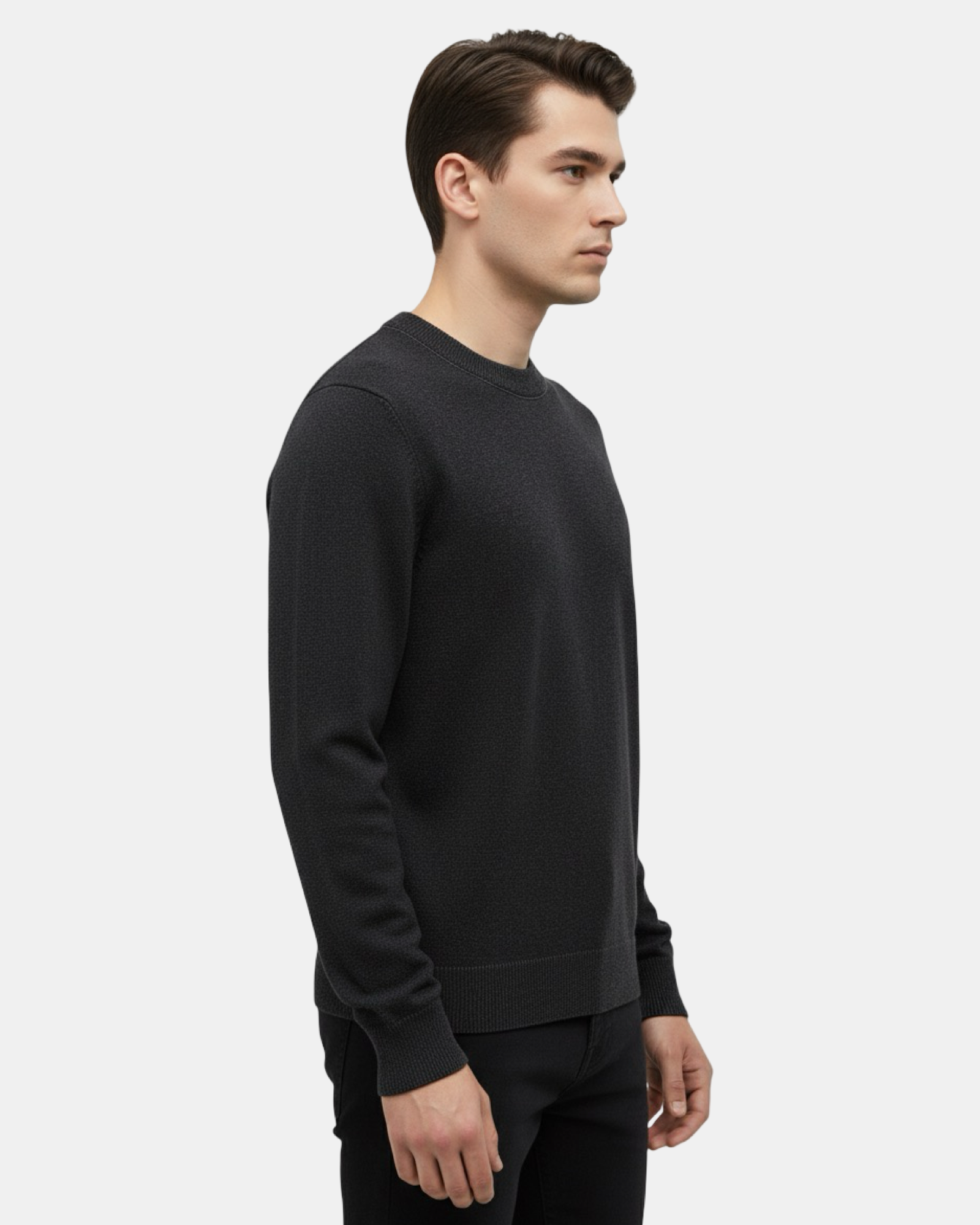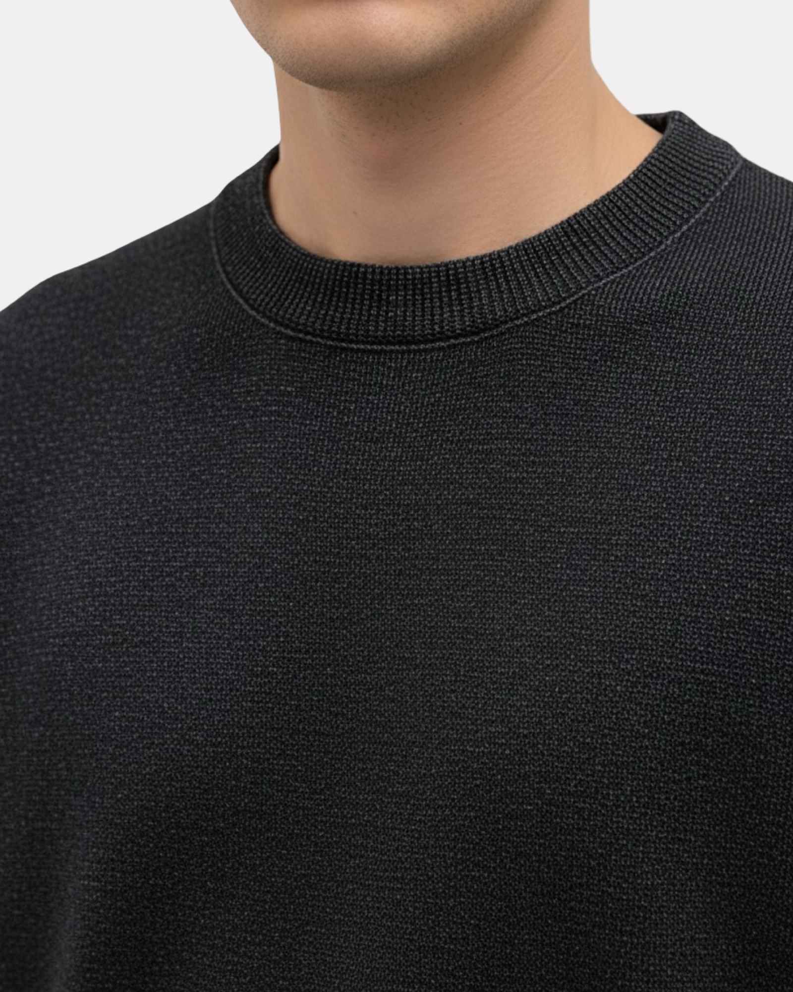 This micro-knit crewneck delivers a smooth, compact texture with a subtle two-tone grain, giving the piece a premium minimal look while maintaining everyday comfort.