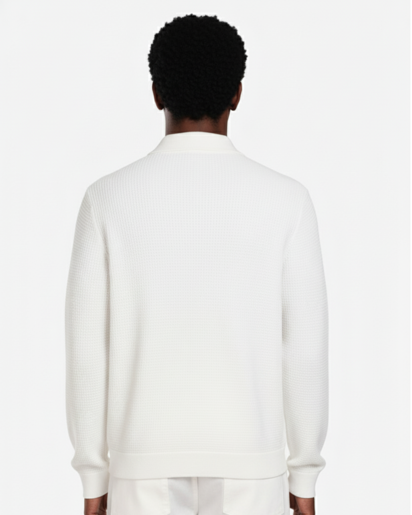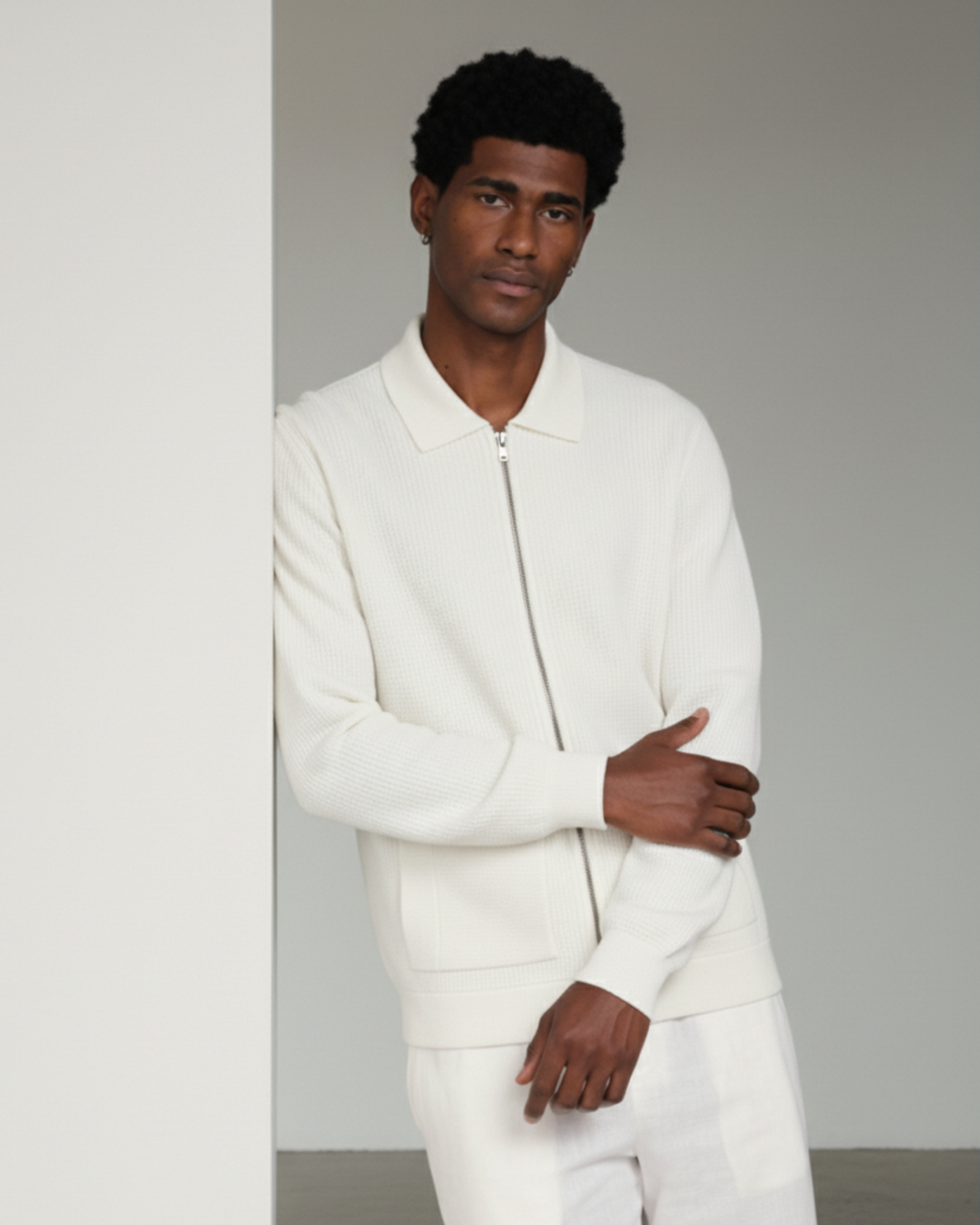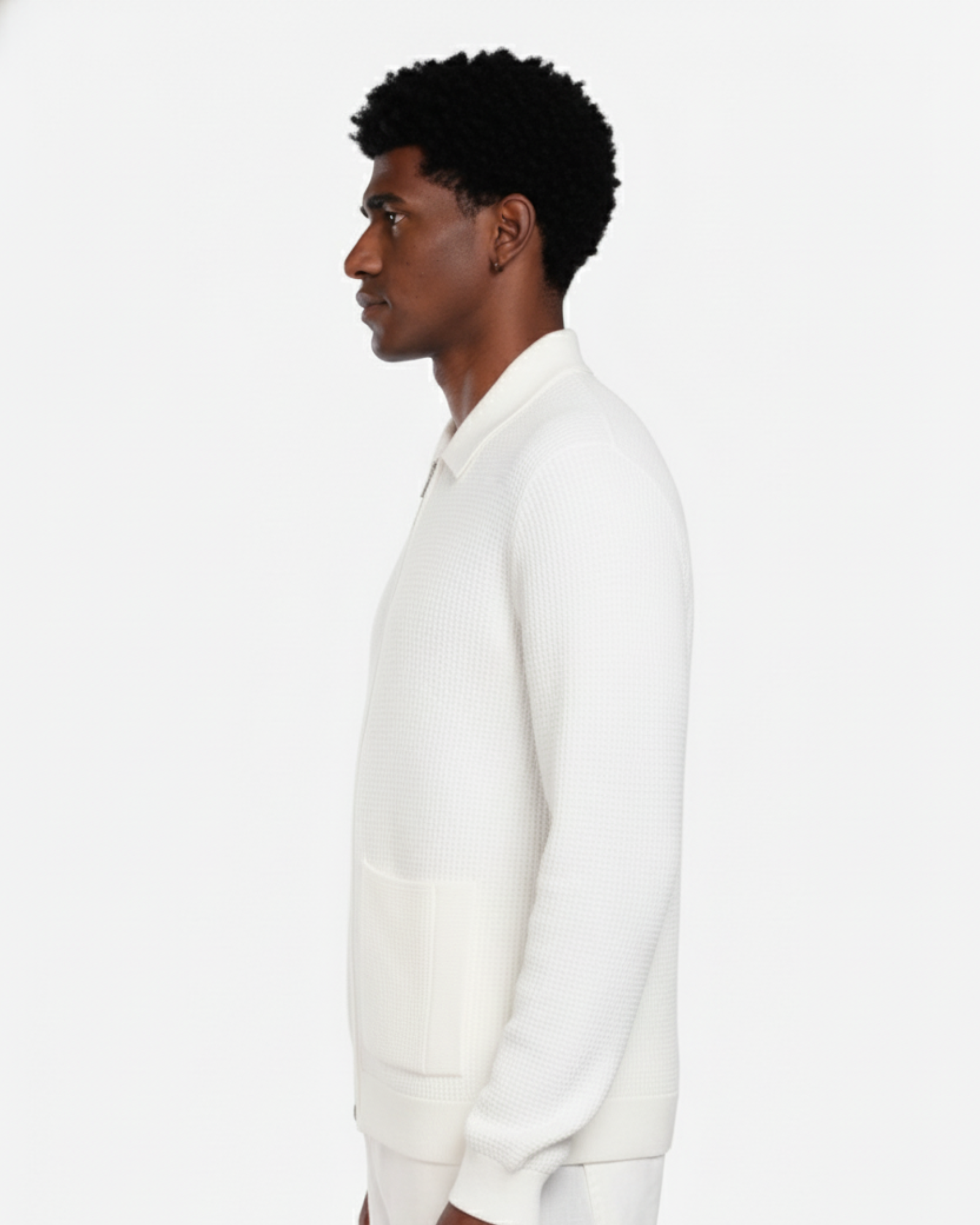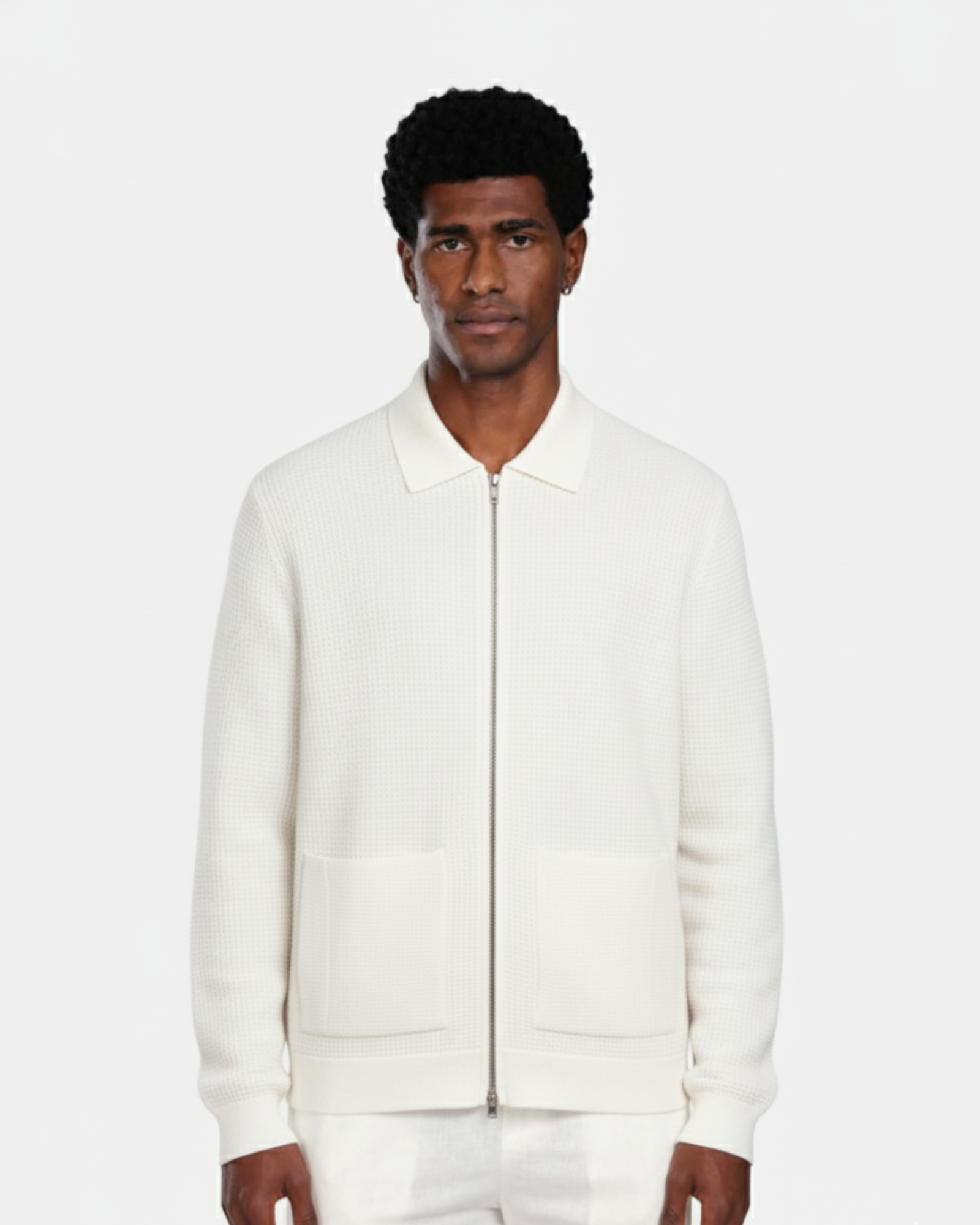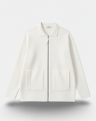 The WHITE FINE-WAFFLE ZIP KNITWEAR W25N embodies refined minimalism through its elevated knit texture and clean construction.