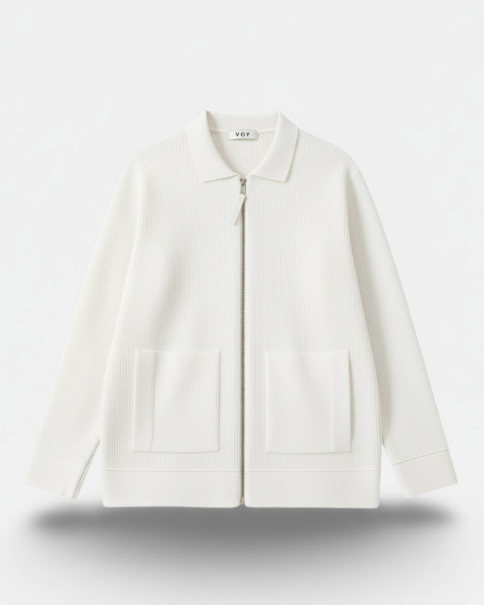 It features a VOY-branded metal zipper, collared neckline, and dual front patch pockets, combining sophistication and functionality in equal measure.