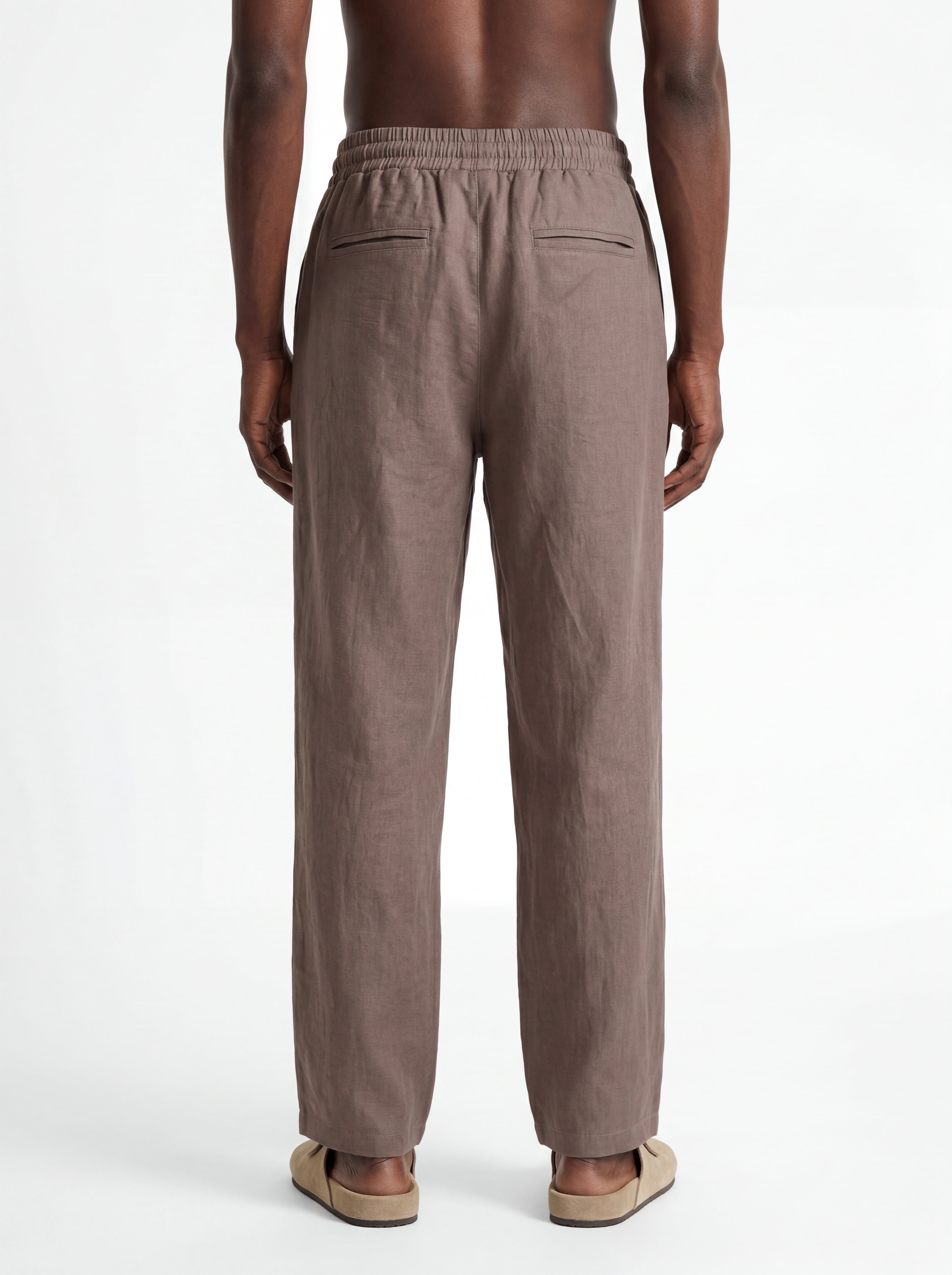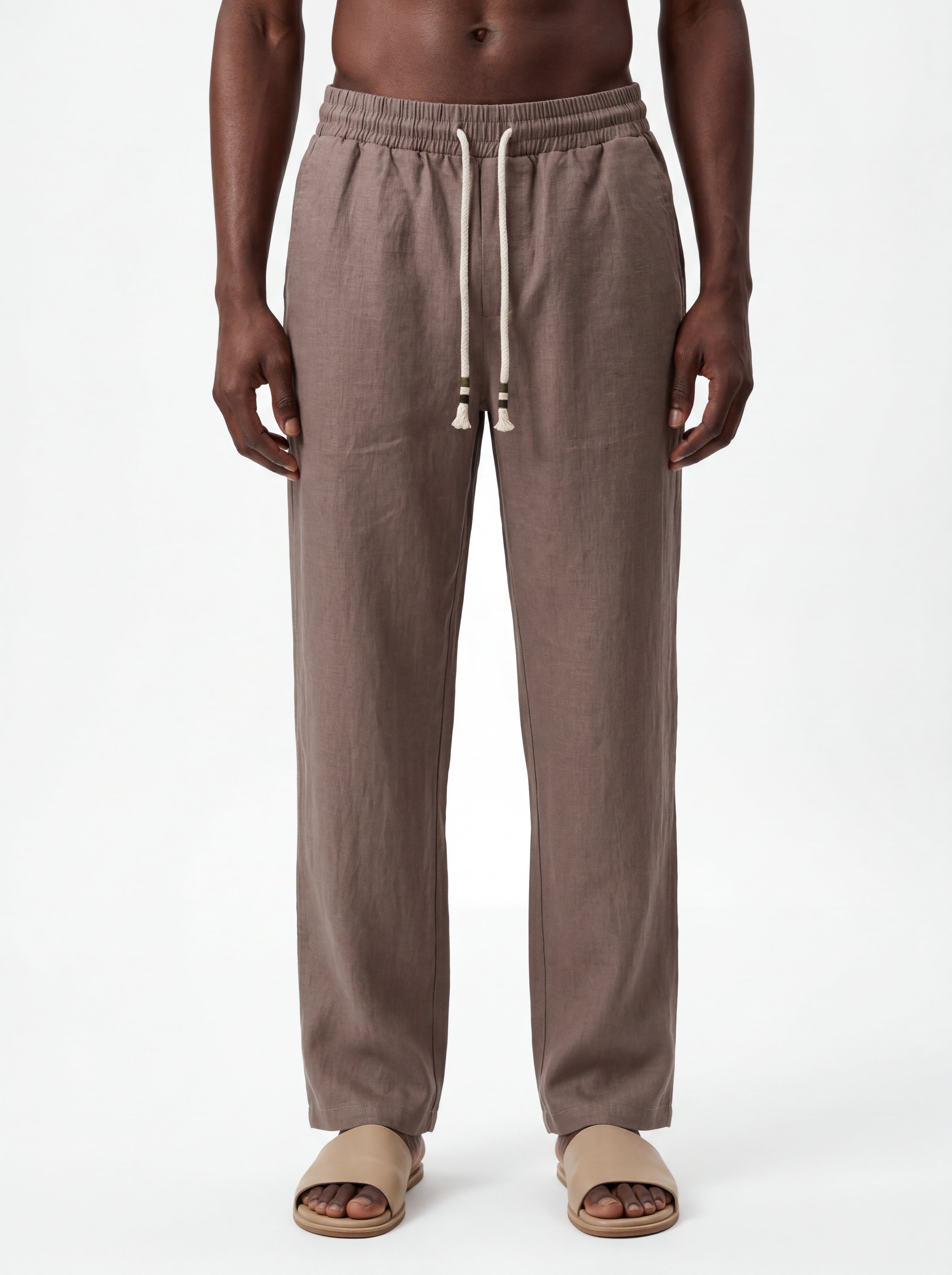 The Taupe Straight-Leg Pure Linen Drawstring Pants S26N are crafted from premium breathable linen designed for lightweight comfort and natural airflow in warm climates. The fabric reveals the authentic character of pure linen with subtle organic wrinkles and a softly textured surface that enhances the relaxed aesthetic of the garment.