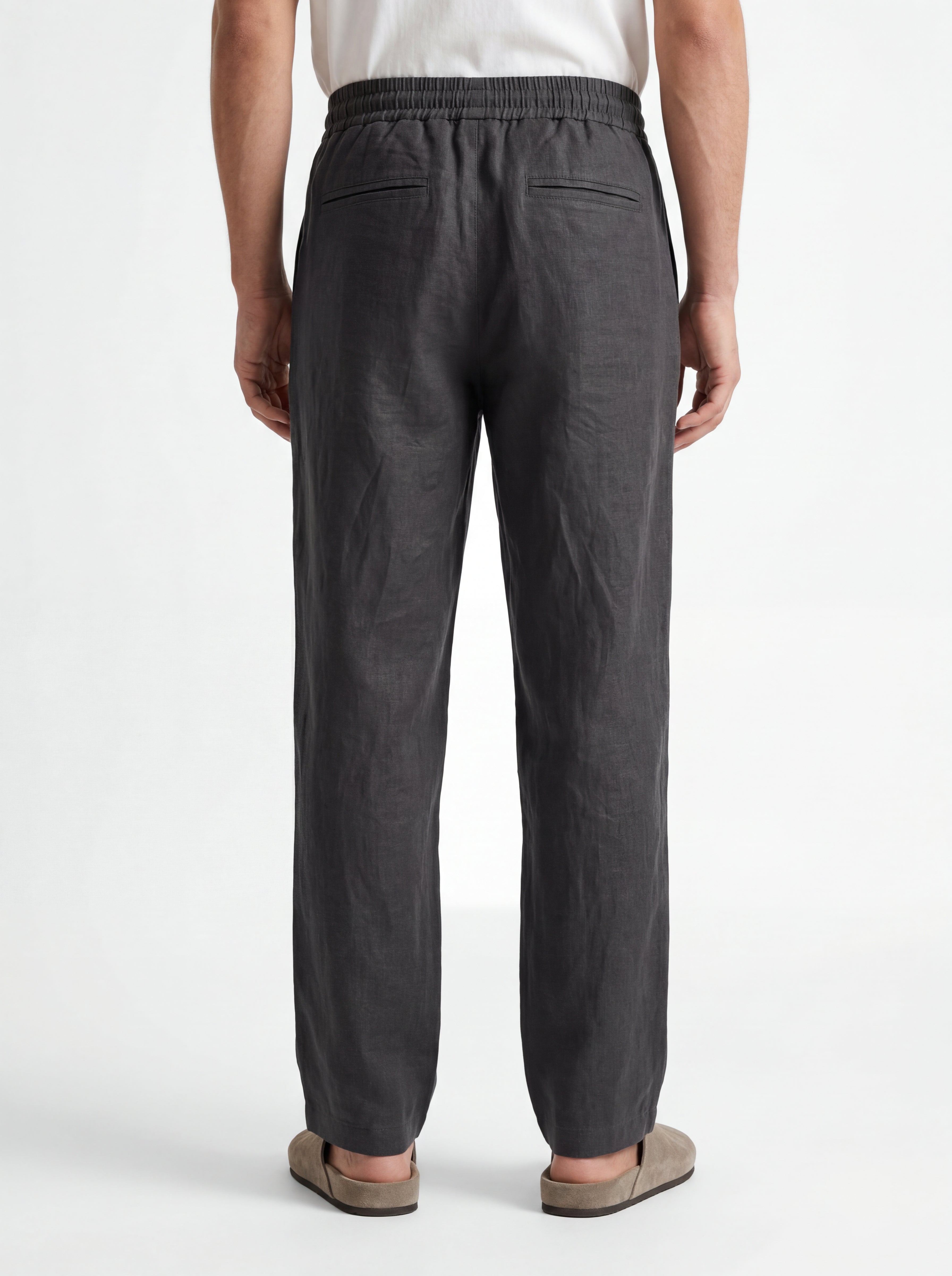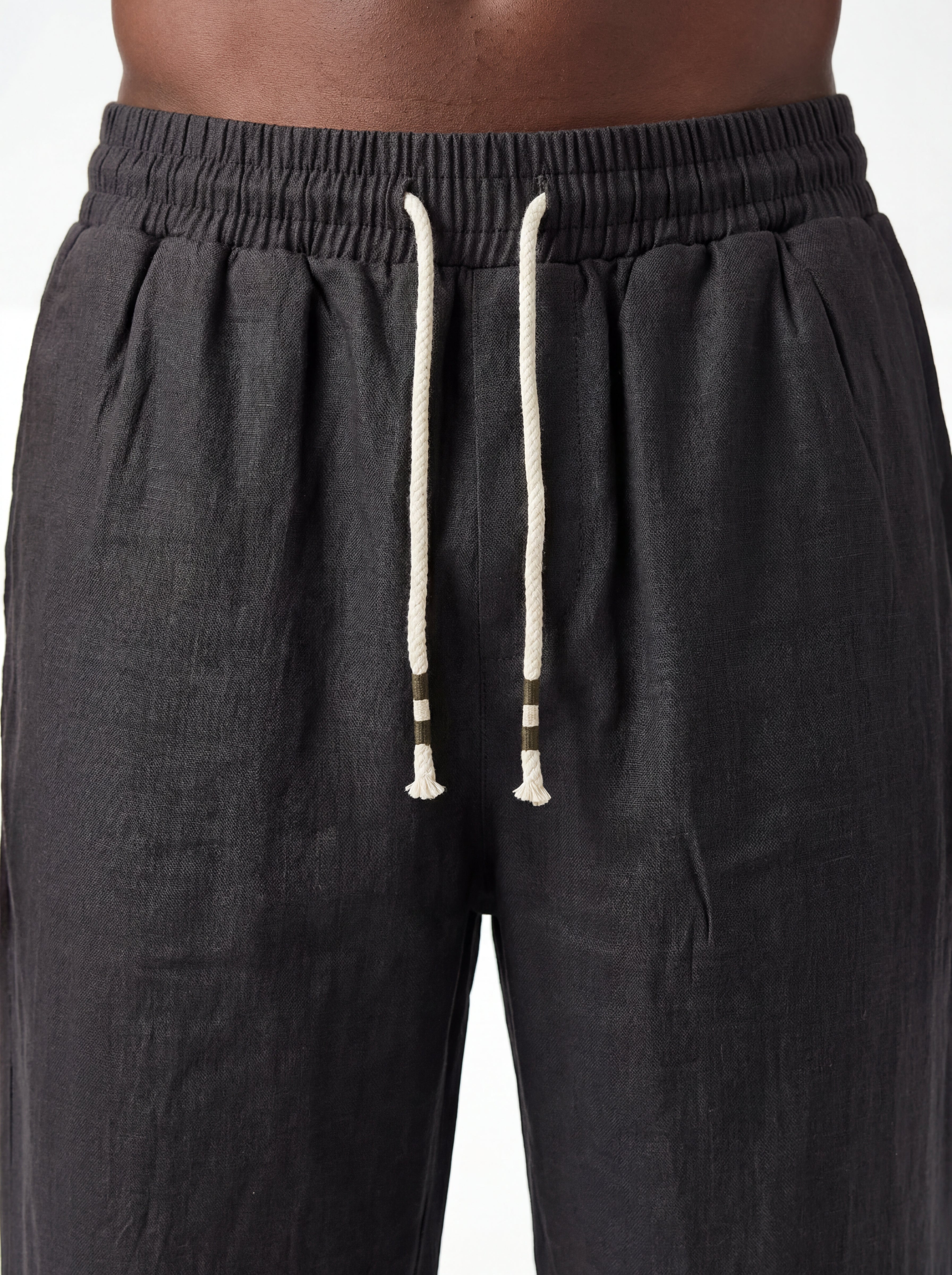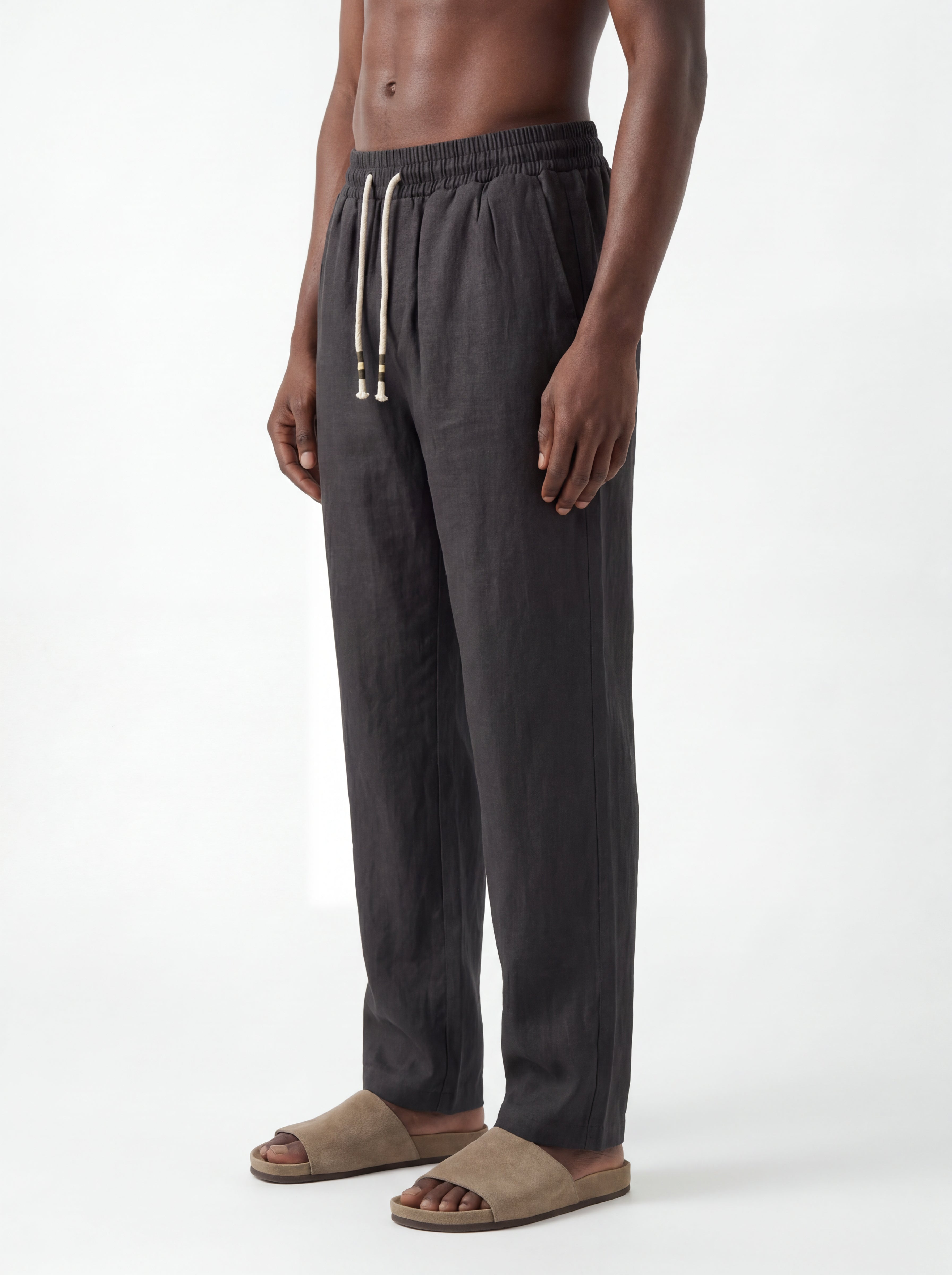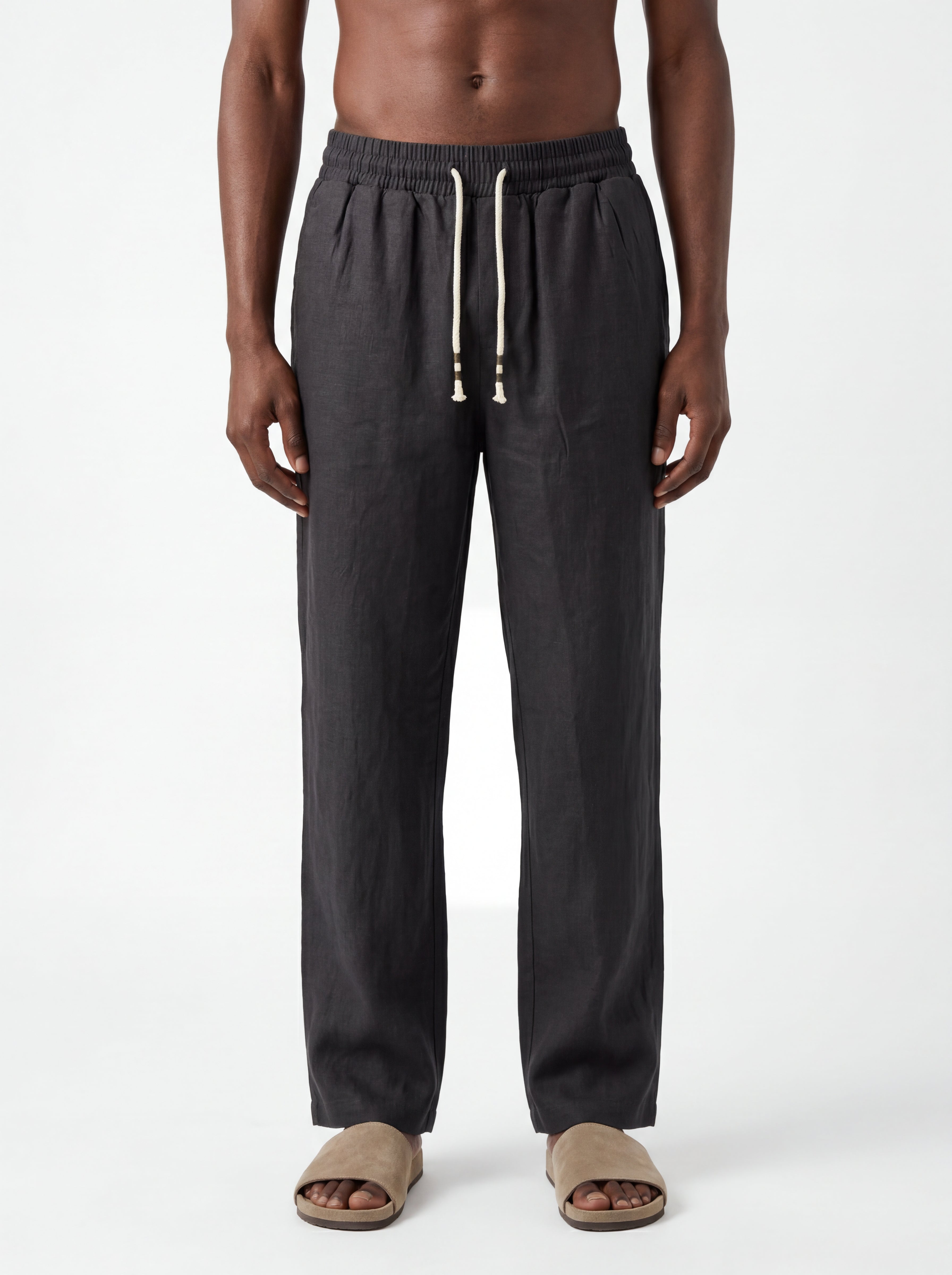 The CHARCOAL Straight-Leg Pure Linen Drawstring Pants S26N are crafted from premium breathable linen, designed for lightweight comfort and natural movement in warm climates. The fabric showcases the authentic character of pure linen with subtle organic wrinkles and a softly textured surface that enhances its relaxed aesthetic.