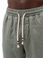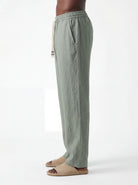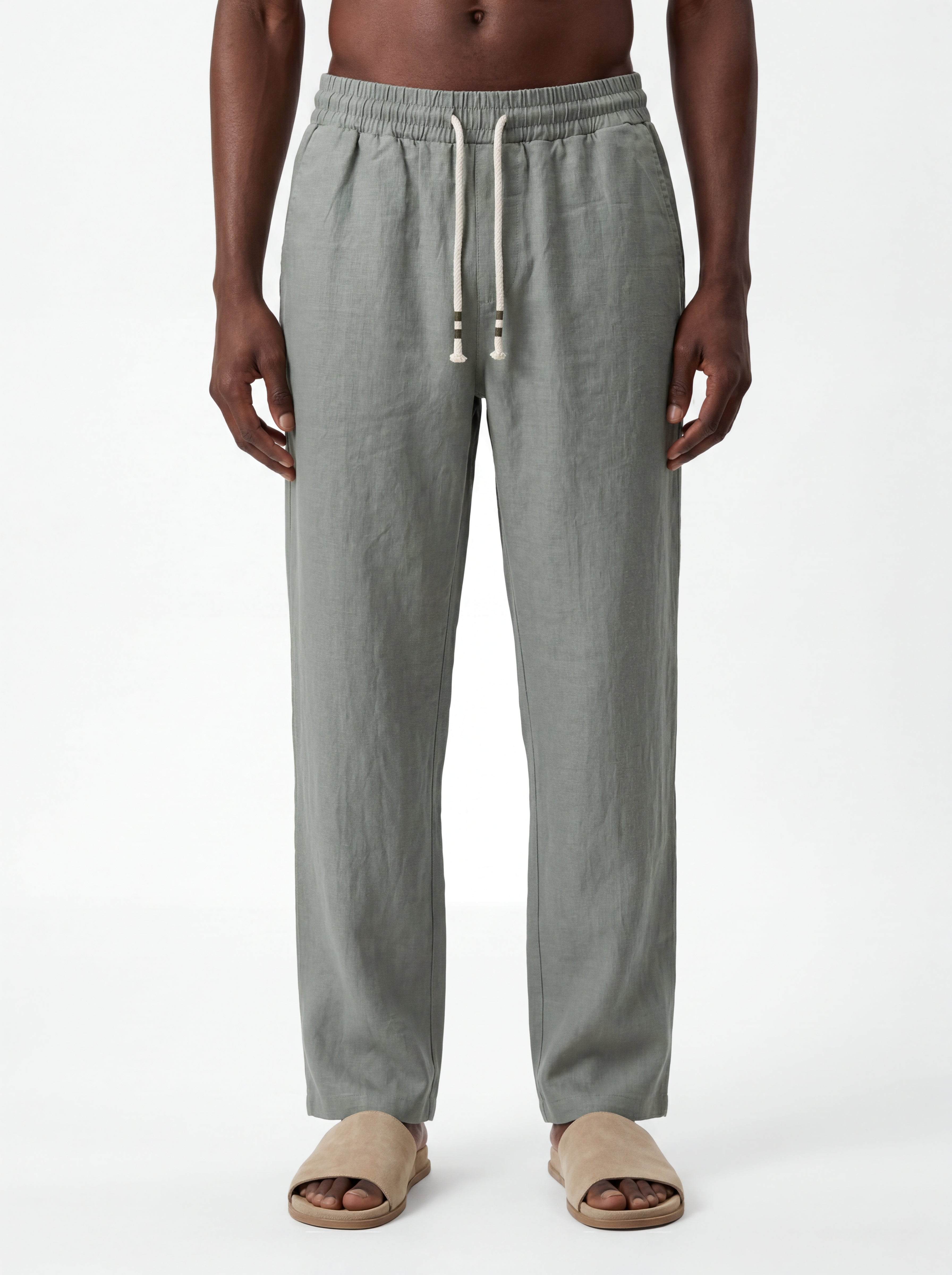 The Sage Straight-Leg Pure Linen Drawstring Pants S26N are crafted from premium breathable linen designed for lightweight comfort and natural airflow in warm climates. The fabric reveals the authentic character of pure linen with subtle organic wrinkles and a softly textured surface that highlights the garment’s relaxed aesthetic.