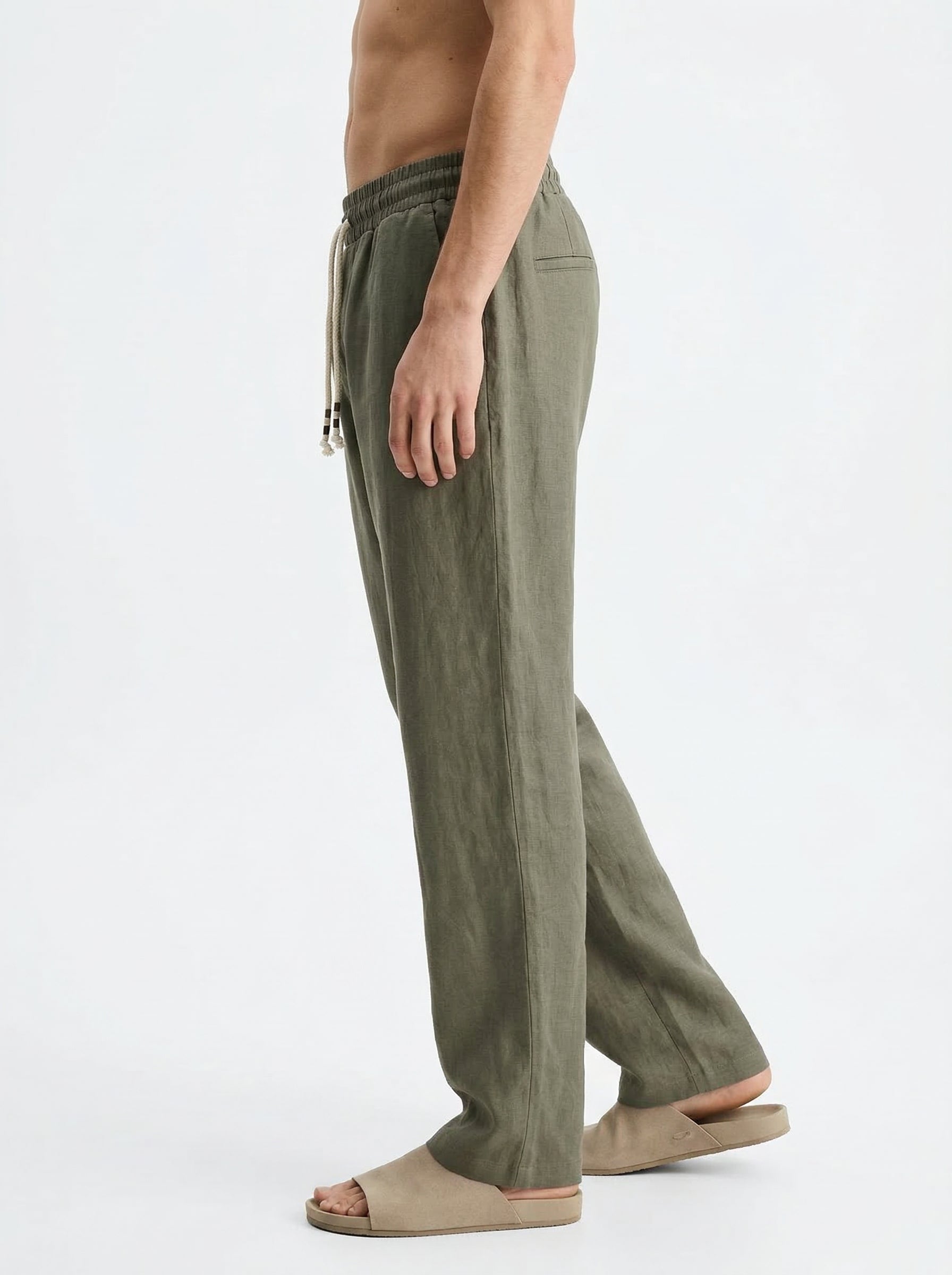 The earthy olive tone pairs effortlessly with linen shirts, lightweight knits, or relaxed t-shirts, making these trousers a versatile staple for travel, resort wear, and everyday warm-weather dressing.