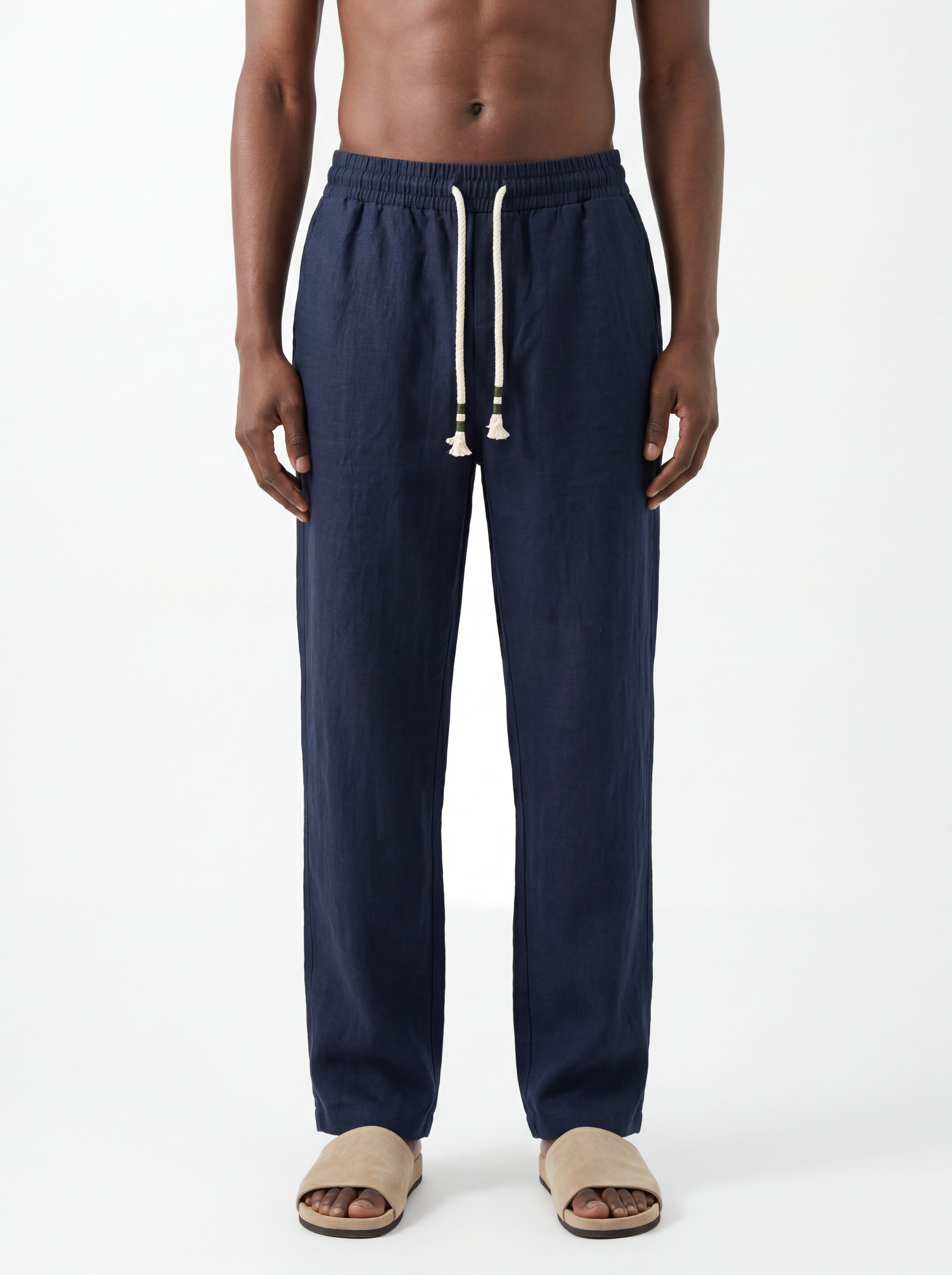 The Deep Navy Straight-Leg Pure Linen Drawstring Pants S26N are crafted from premium breathable linen designed for lightweight comfort and natural airflow in warm climates. The fabric reveals the authentic character of pure linen with subtle organic wrinkles and a softly textured surface that enhances the relaxed aesthetic of the garment.