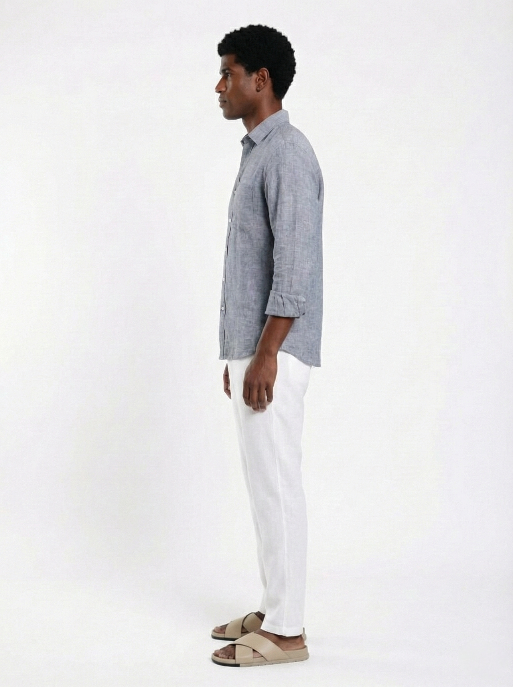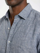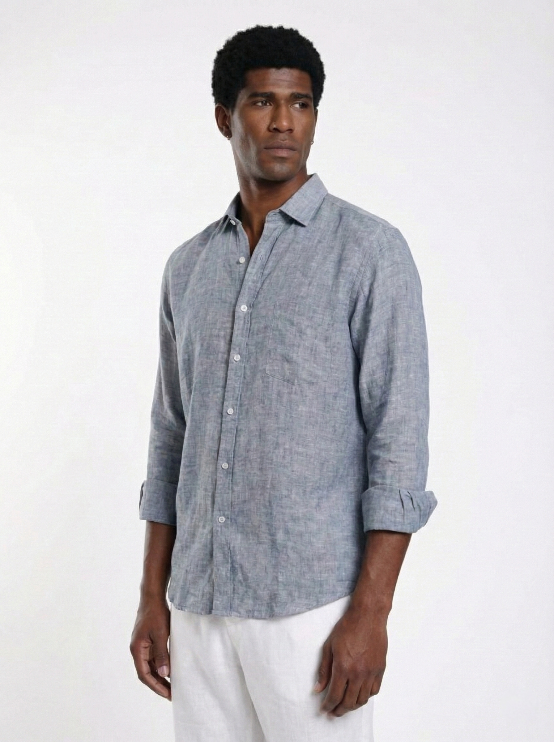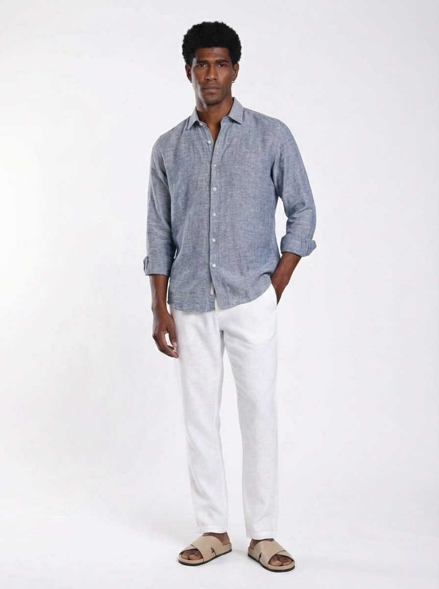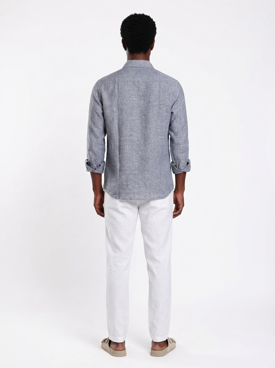 • 100% pure breathable linen fabric • Relaxed fit for enhanced comfort and airflow • Muted smoked blue seasonal tone • Natural textured weave with authentic linen character • Structured collar with clean front placket • Lightweight summer-ready construction