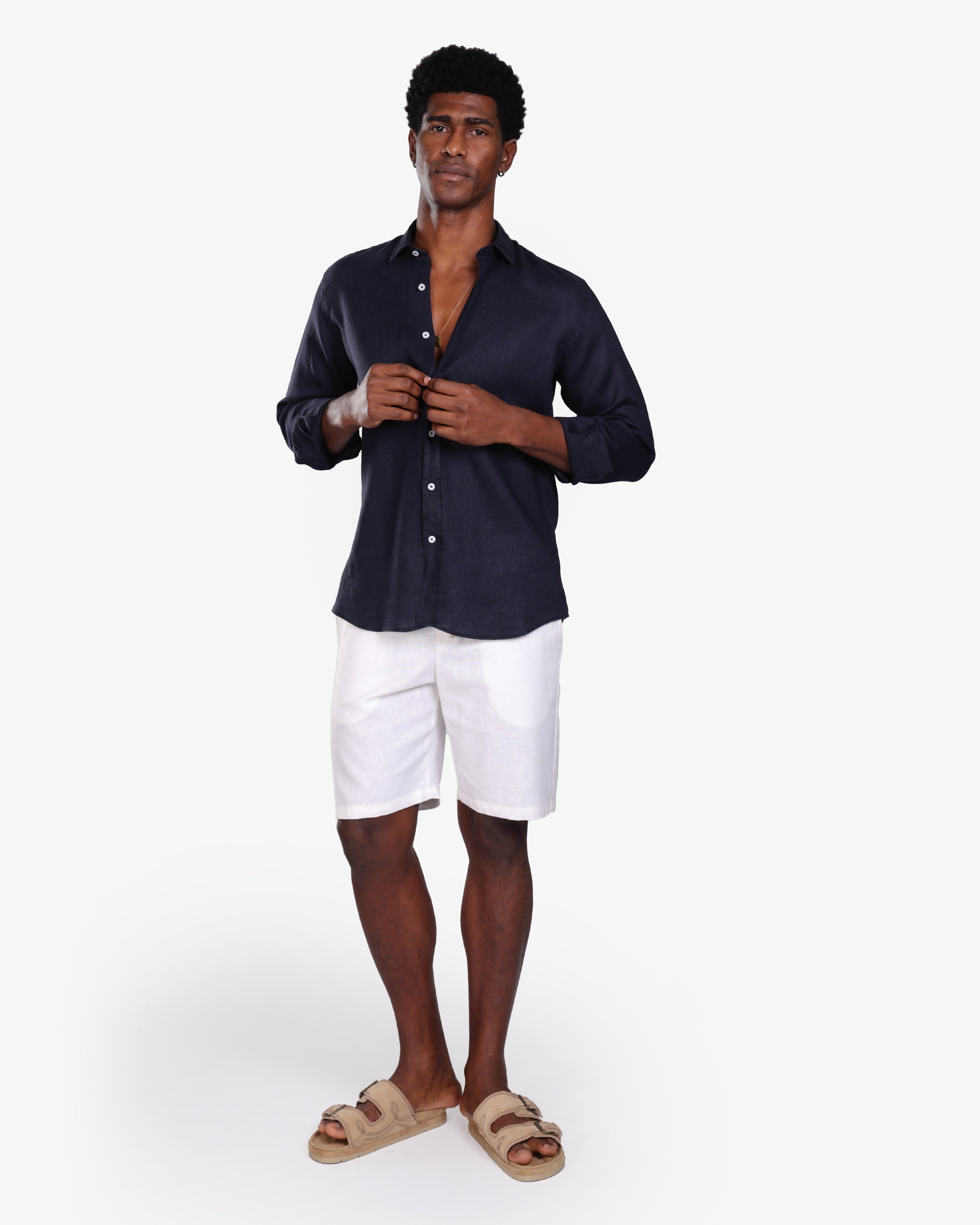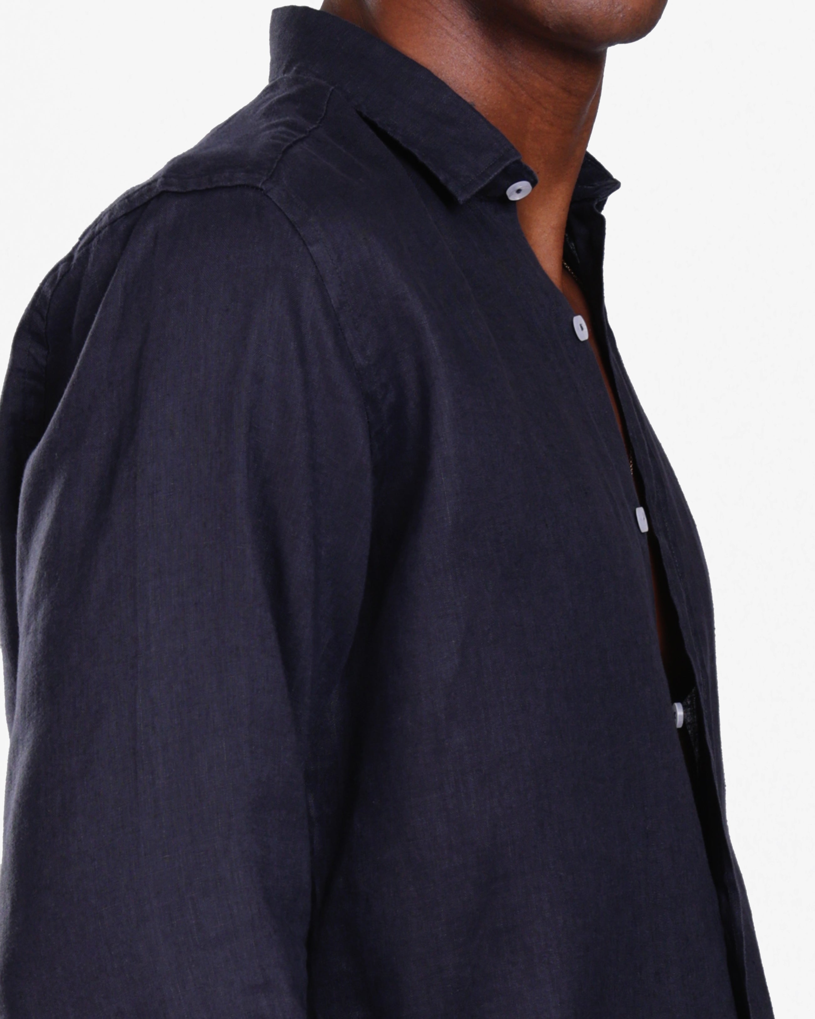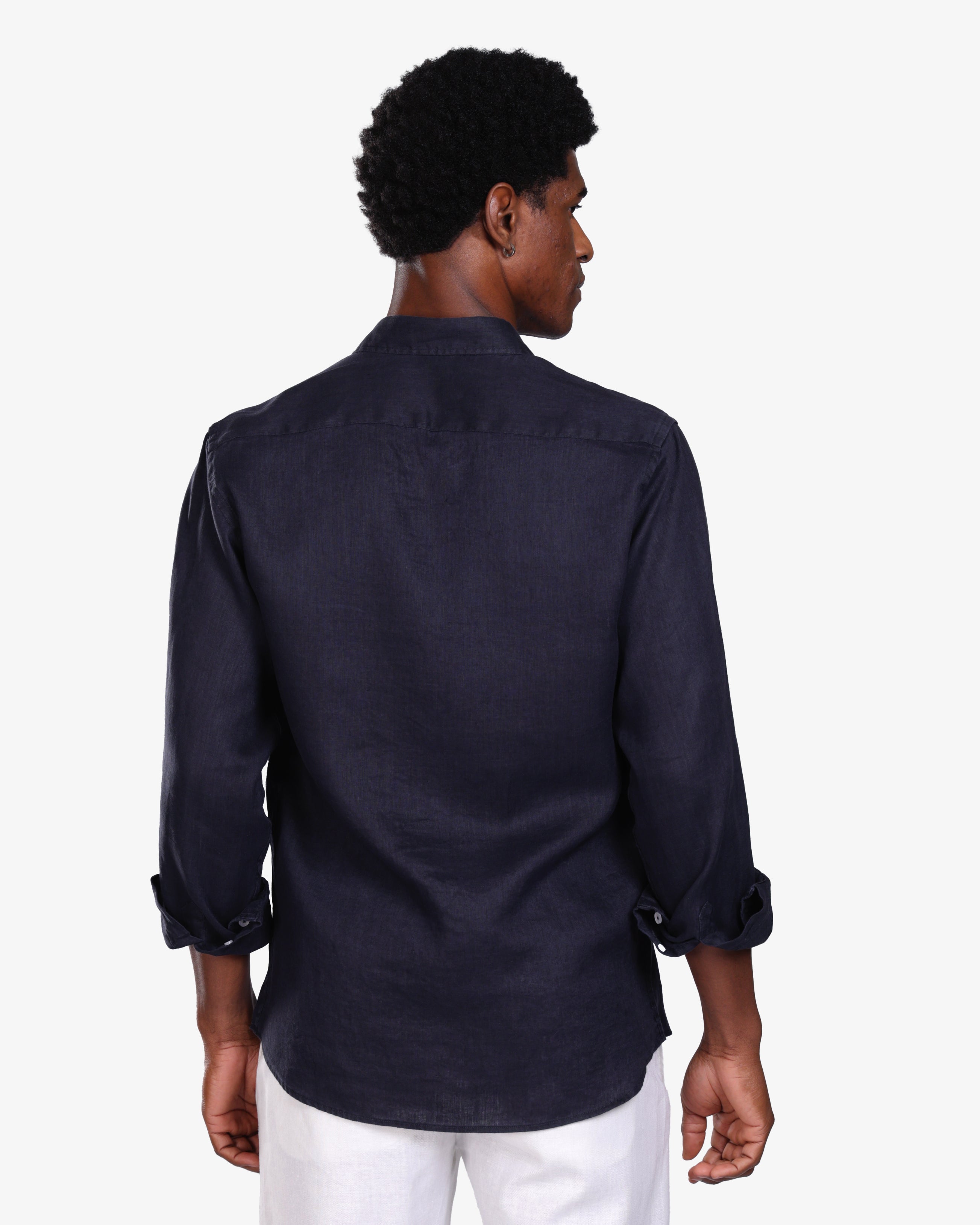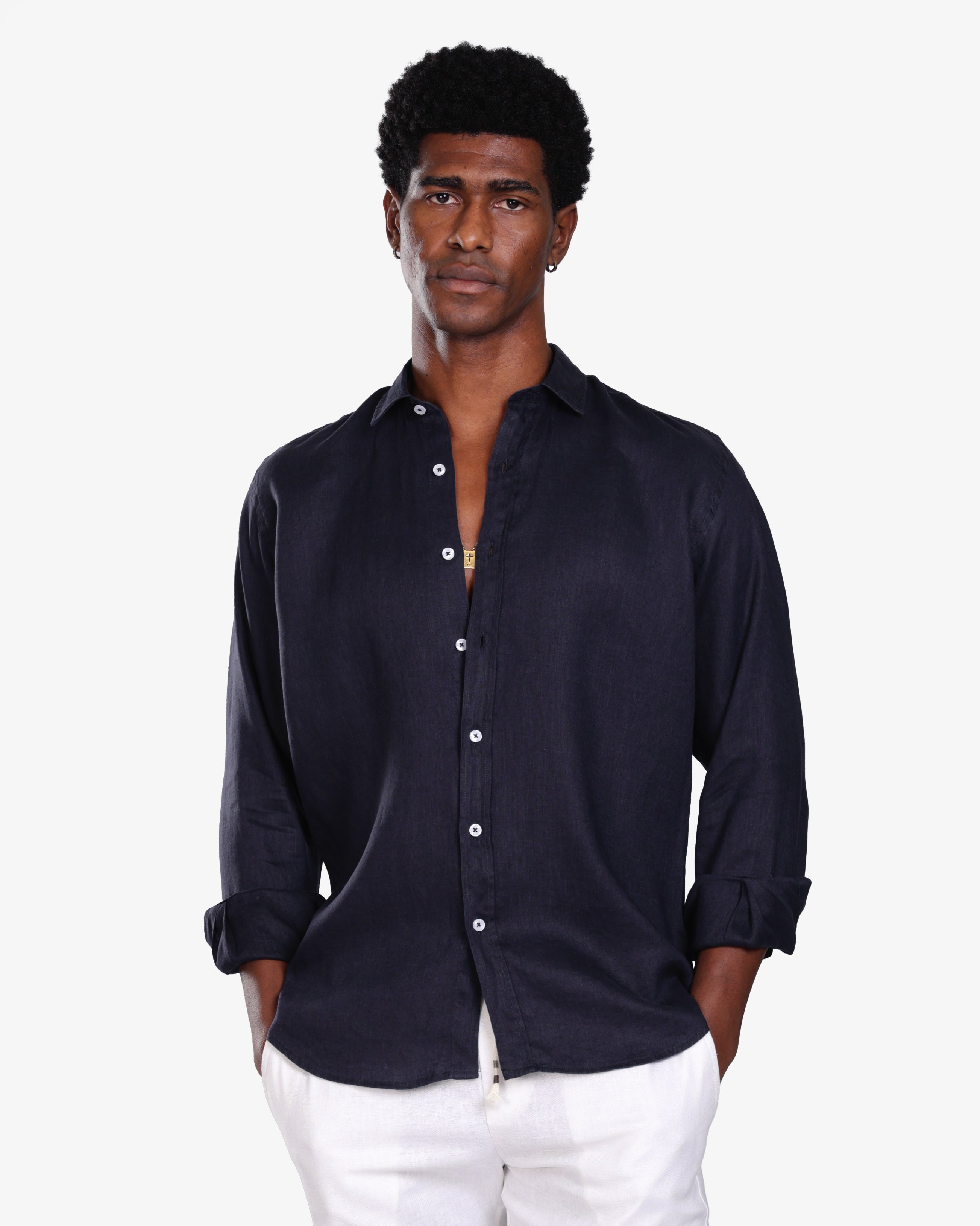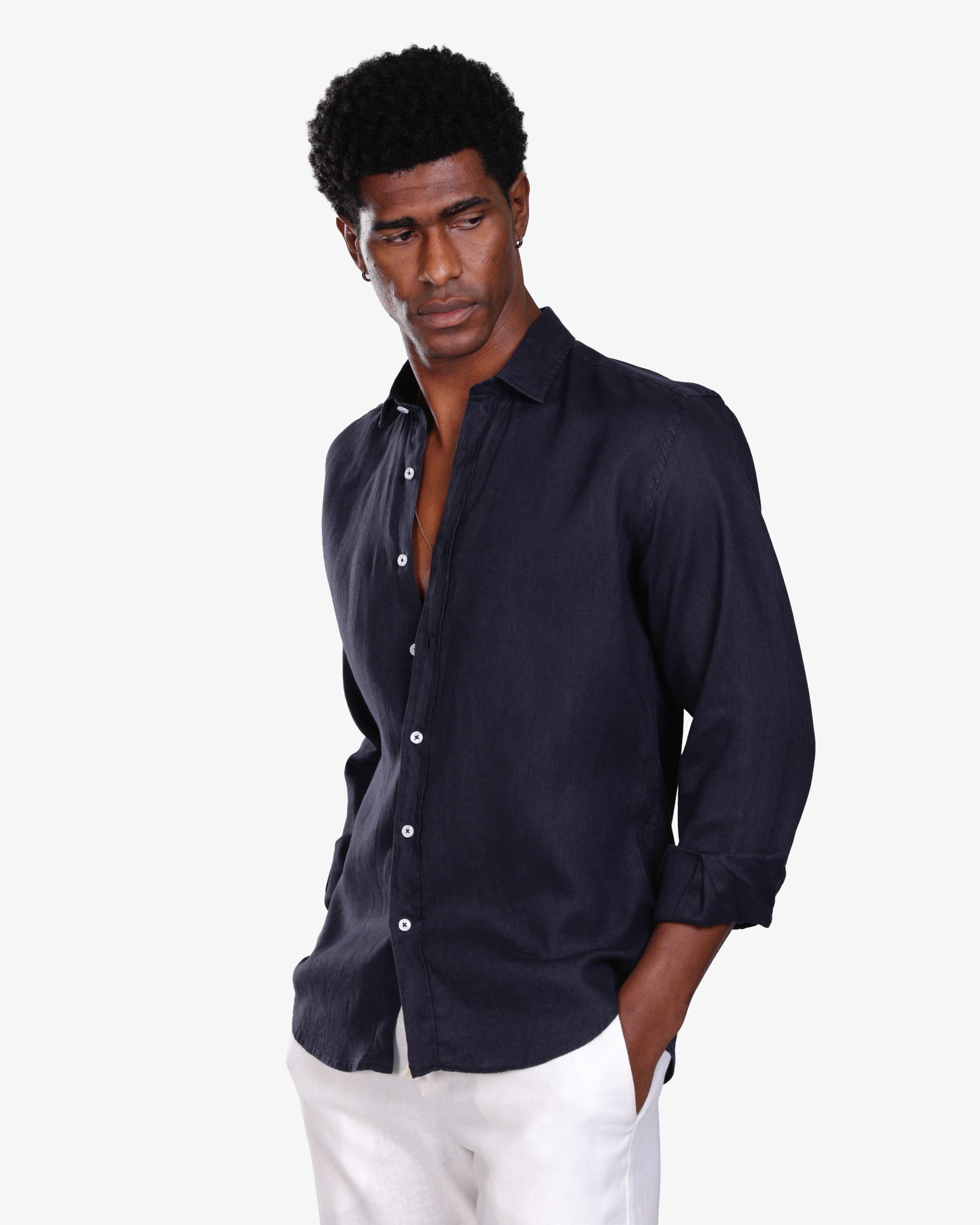 Elevate your casual wardrobe with this effortlessly stylish men’s long sleeve shirt. Crafted from a breathable linen blend, it features a refined navy color with a soft, slightly textured finish. The shirt is tailored with a relaxed yet modern fit, making it perfect for both smart-casual and laid-back settings.