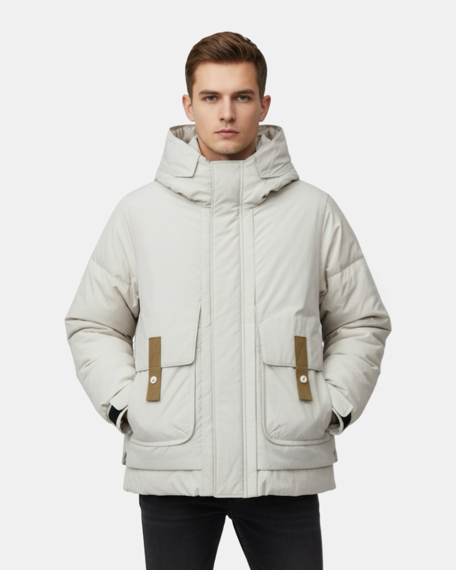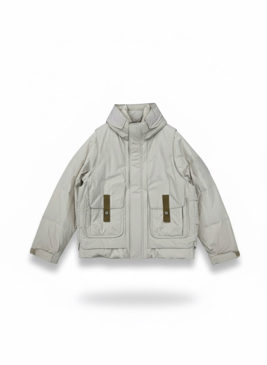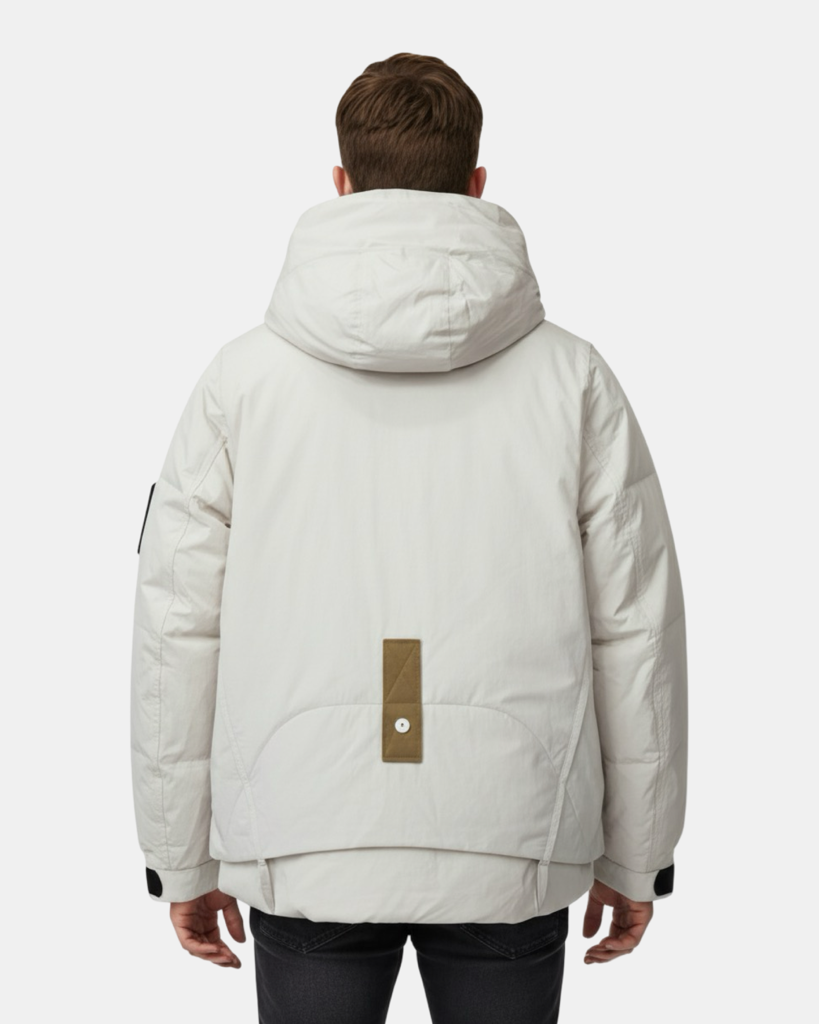 The Ivory Tech Pocket Down Hooded Jacket W25N merges modern utility with refined minimalism. Designed for cold urban environments, it features a soft ivory tone and structured silhouette enhanced by functional details. Crafted from a durable, water-repellent shell and filled with premium down insulation, it ensures superior warmth without bulk. Contrast olive accents and a sleek arm patch add a signature technical edge — a perfect balance between performance and style.