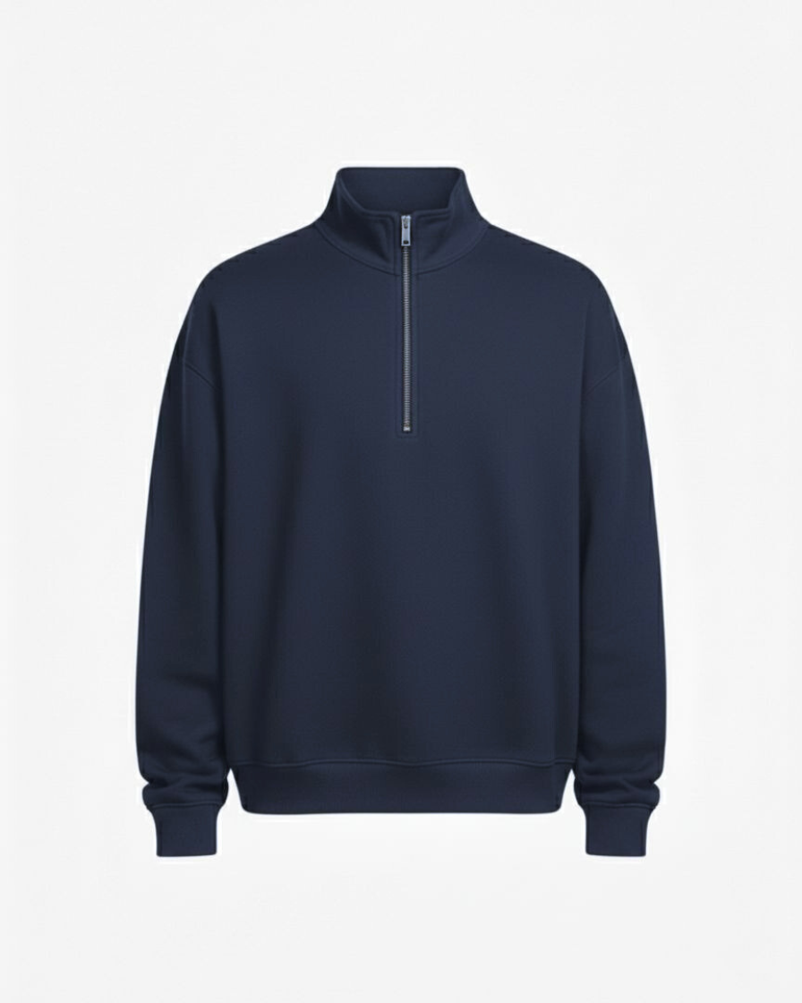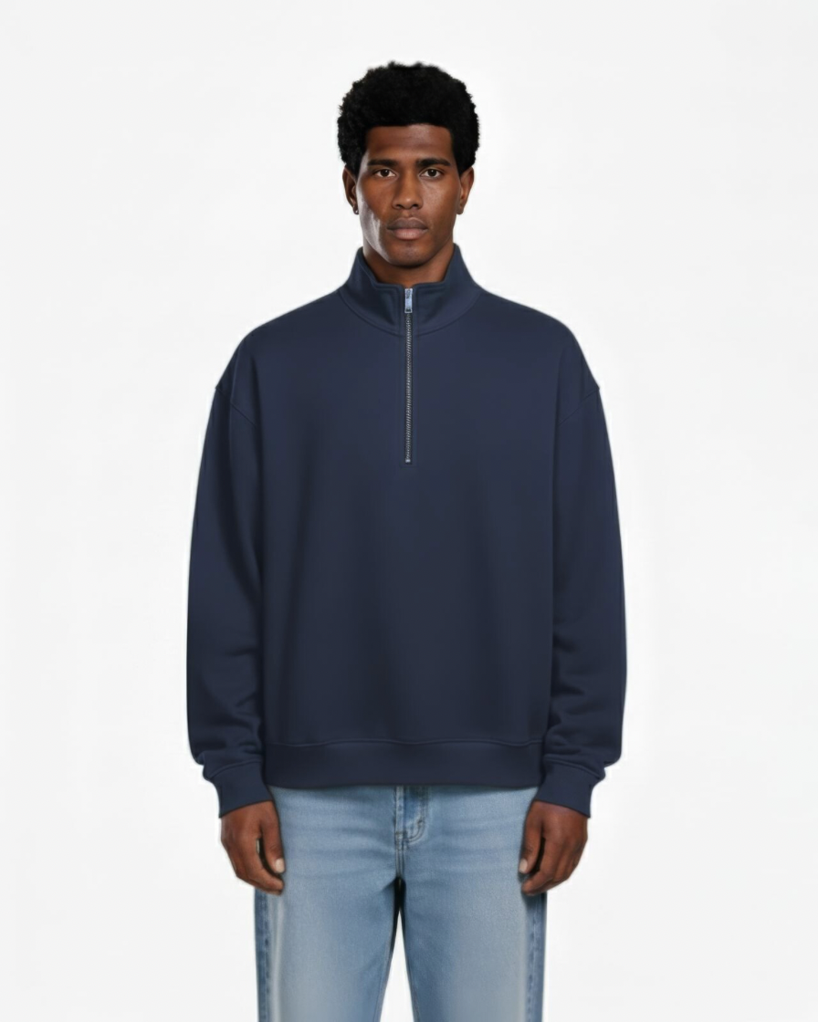 This men’s quarter-zip sweatshirt delivers a modern minimalist look with everyday comfort. Designed in navy, it features a sleek stand-up collar with a full metal zip for versatile styling. The relaxed fit and ribbed trims ensure a comfortable wear, while the premium fabric offers a clean, structured drape. Perfect for layering or as a statement piece, this sweatshirt balances casual ease with contemporary edge.
