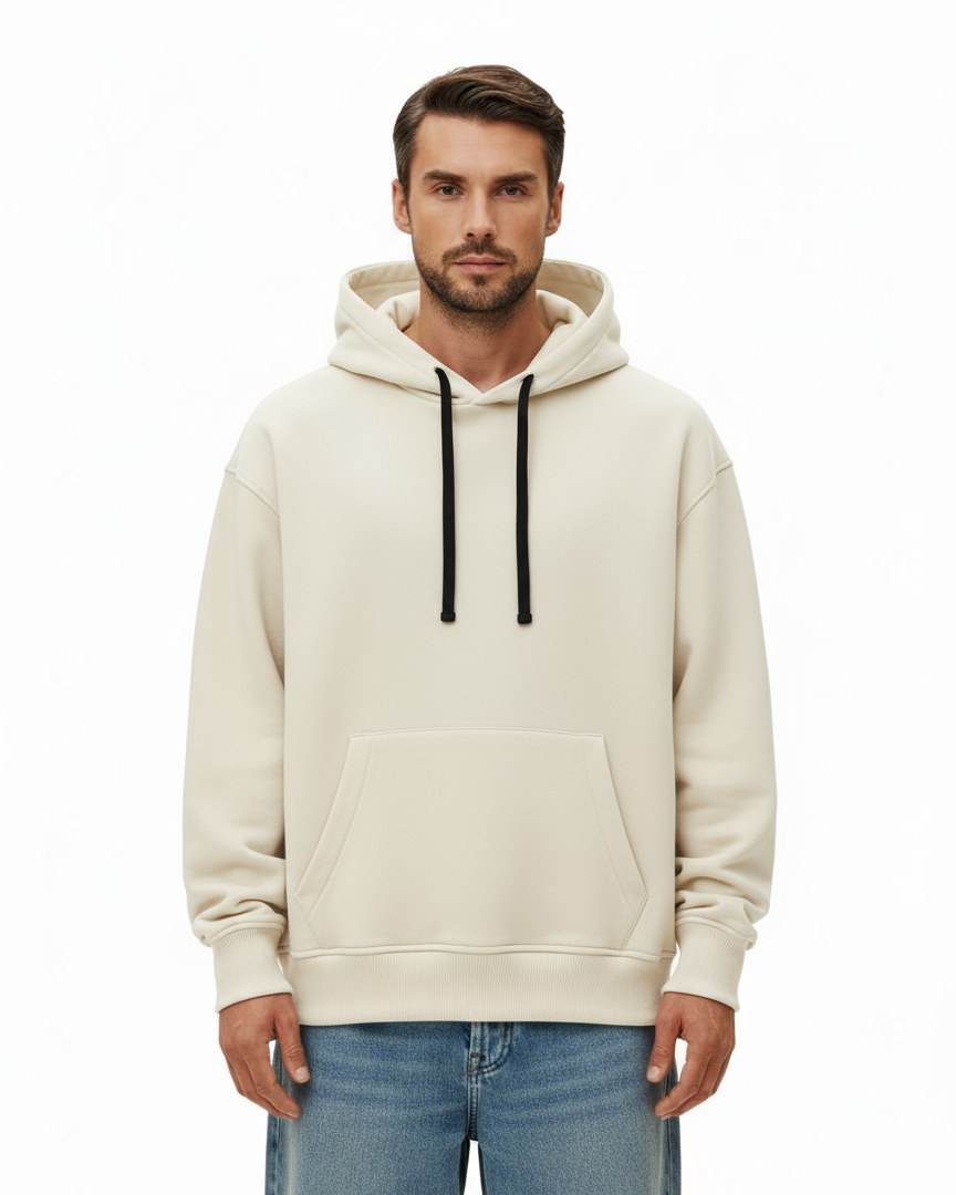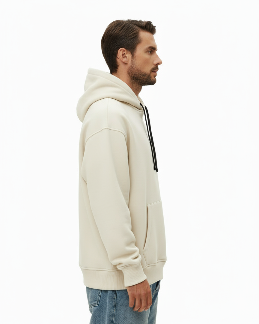 This men’s hoodie in a rich petrol off white hue combines minimal design with ultimate comfort. Crafted from a premium mid-weight cotton-blend fabric, it offers a smooth, structured drape while remaining breathable and soft against the skin. The classic kangaroo pocket and ribbed hems provide a secure fit and functionality, while the tonal stitching enhances the clean silhouette.