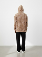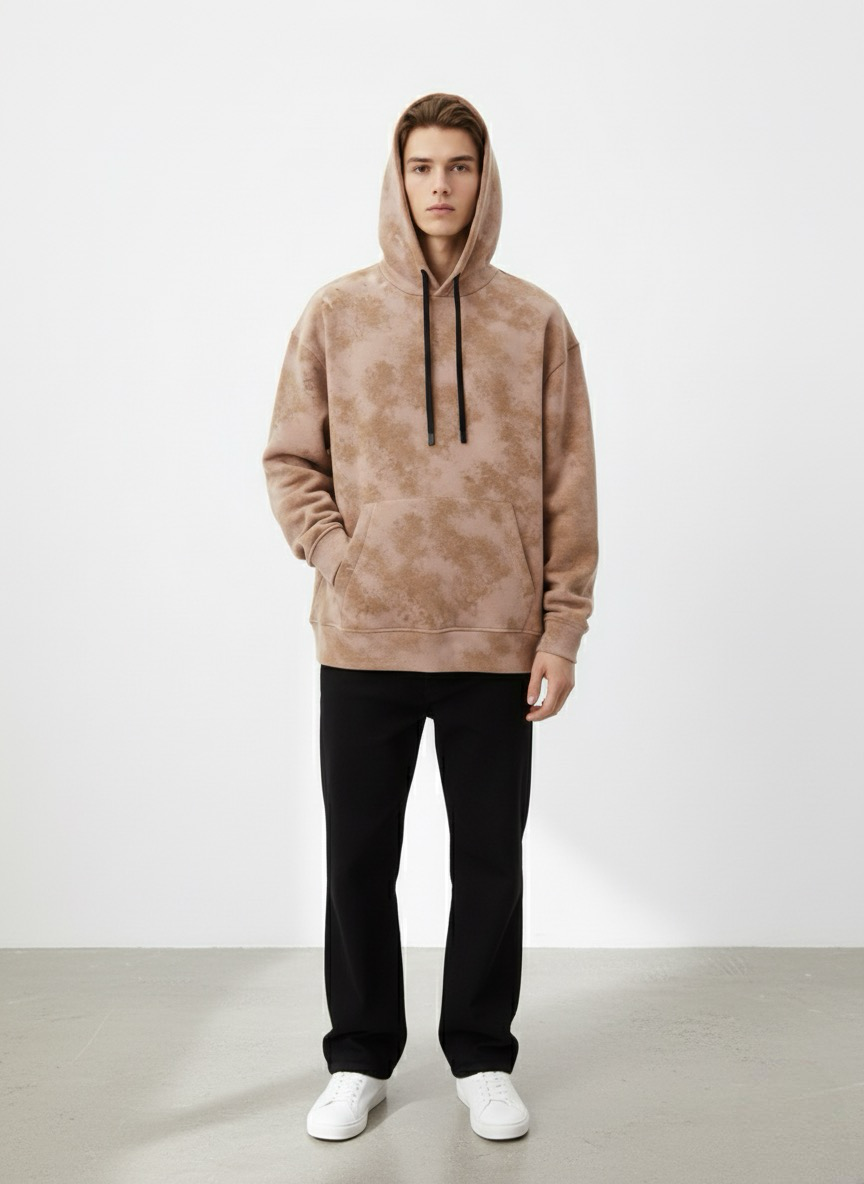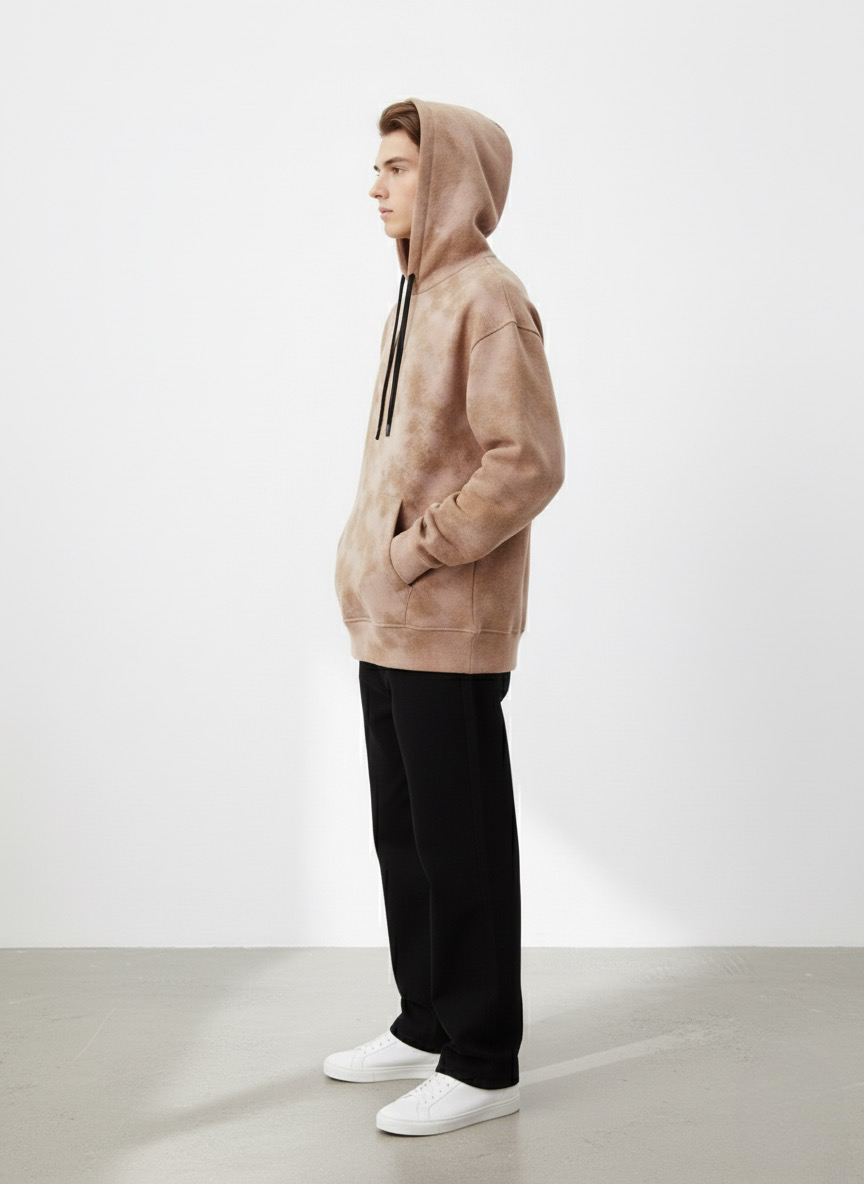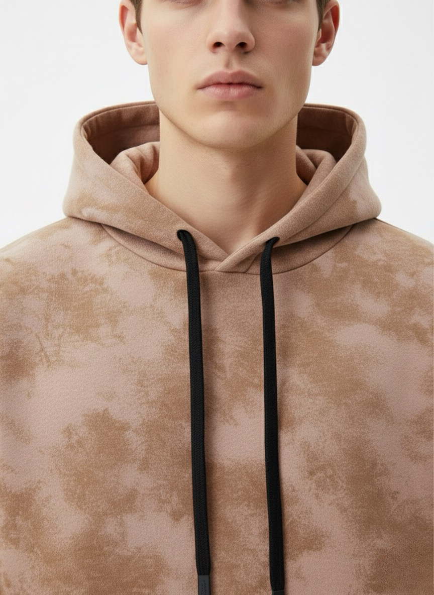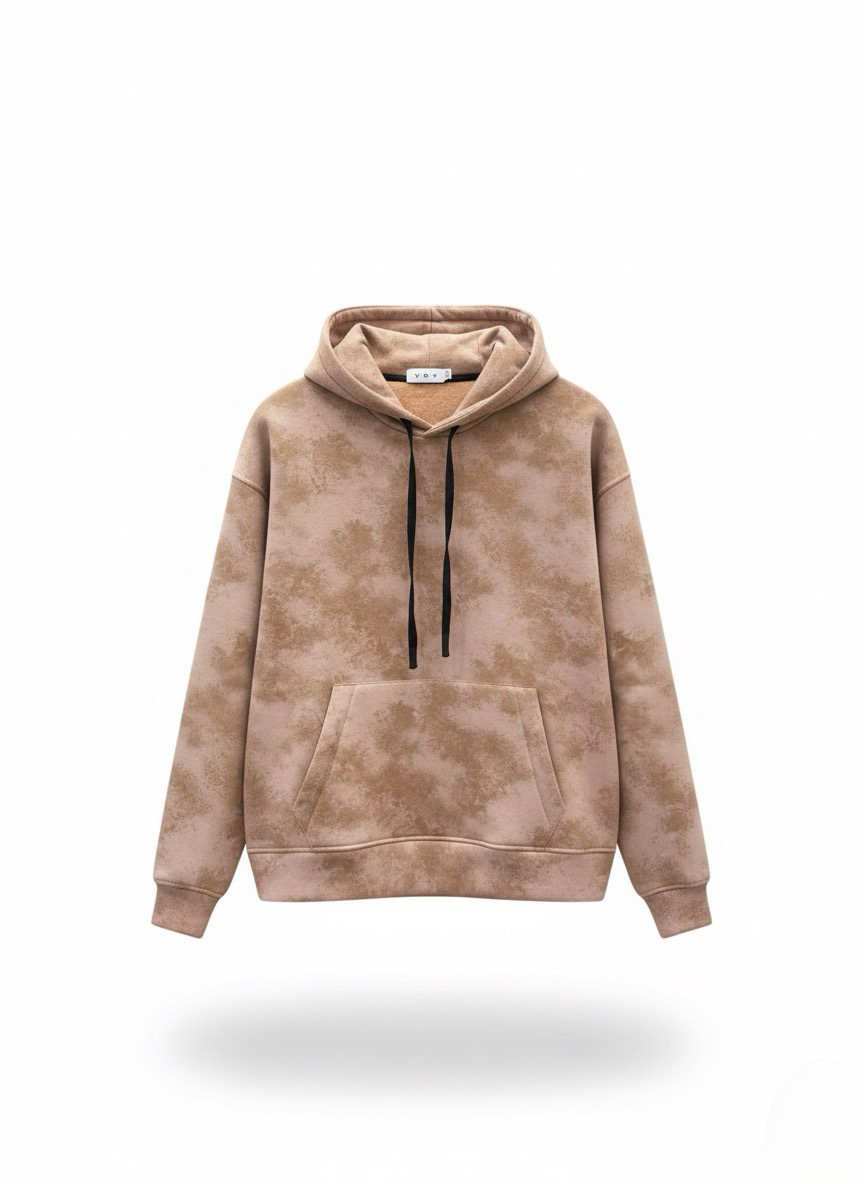 The Dusty Taupe Cloud-Dye Hooded Sweatshirt features a unique cloud-wash pattern in muted earthy taupe tones, creating a naturally faded, tonal marbled effect across the fabric — making every piece subtly unique.