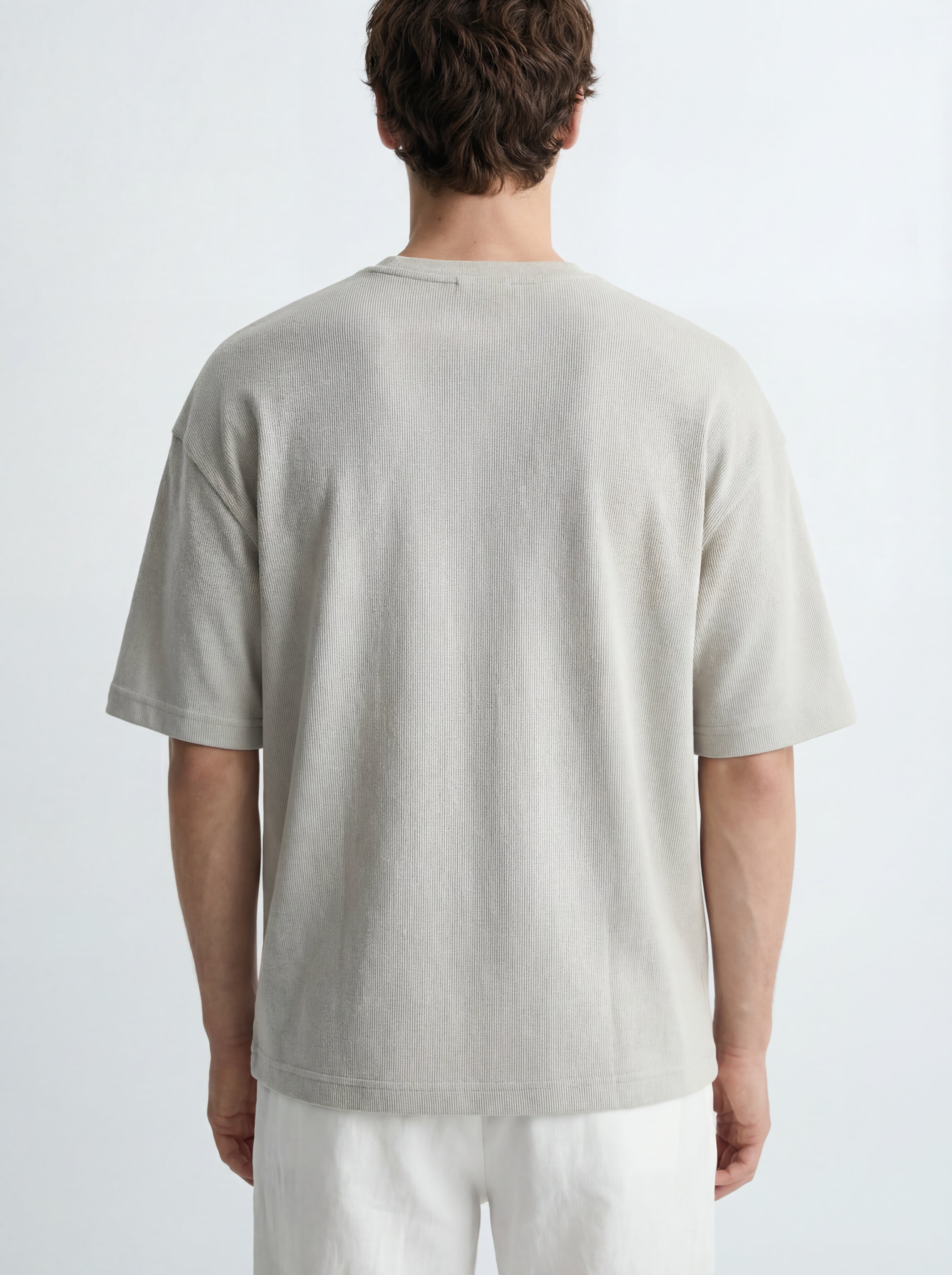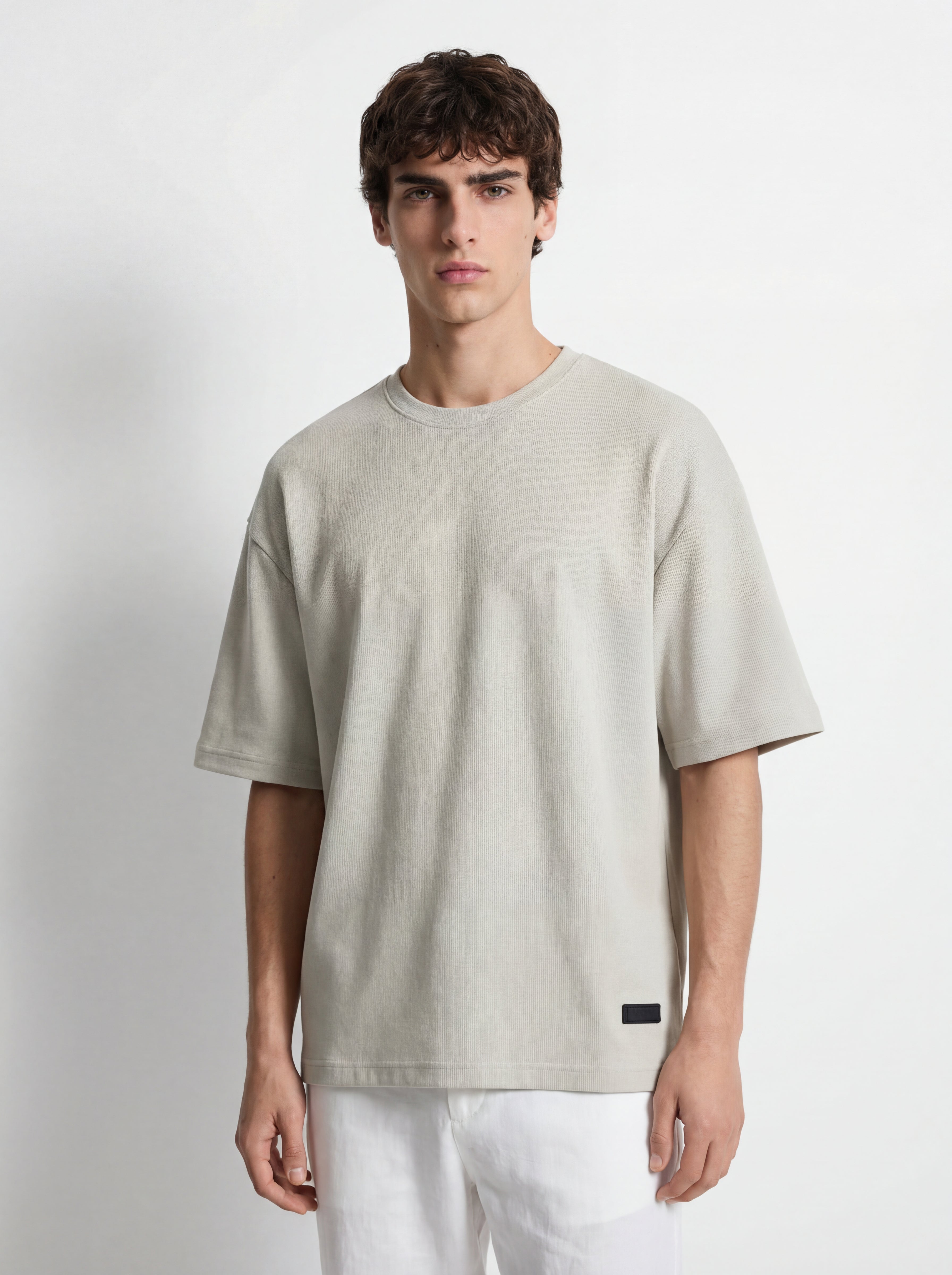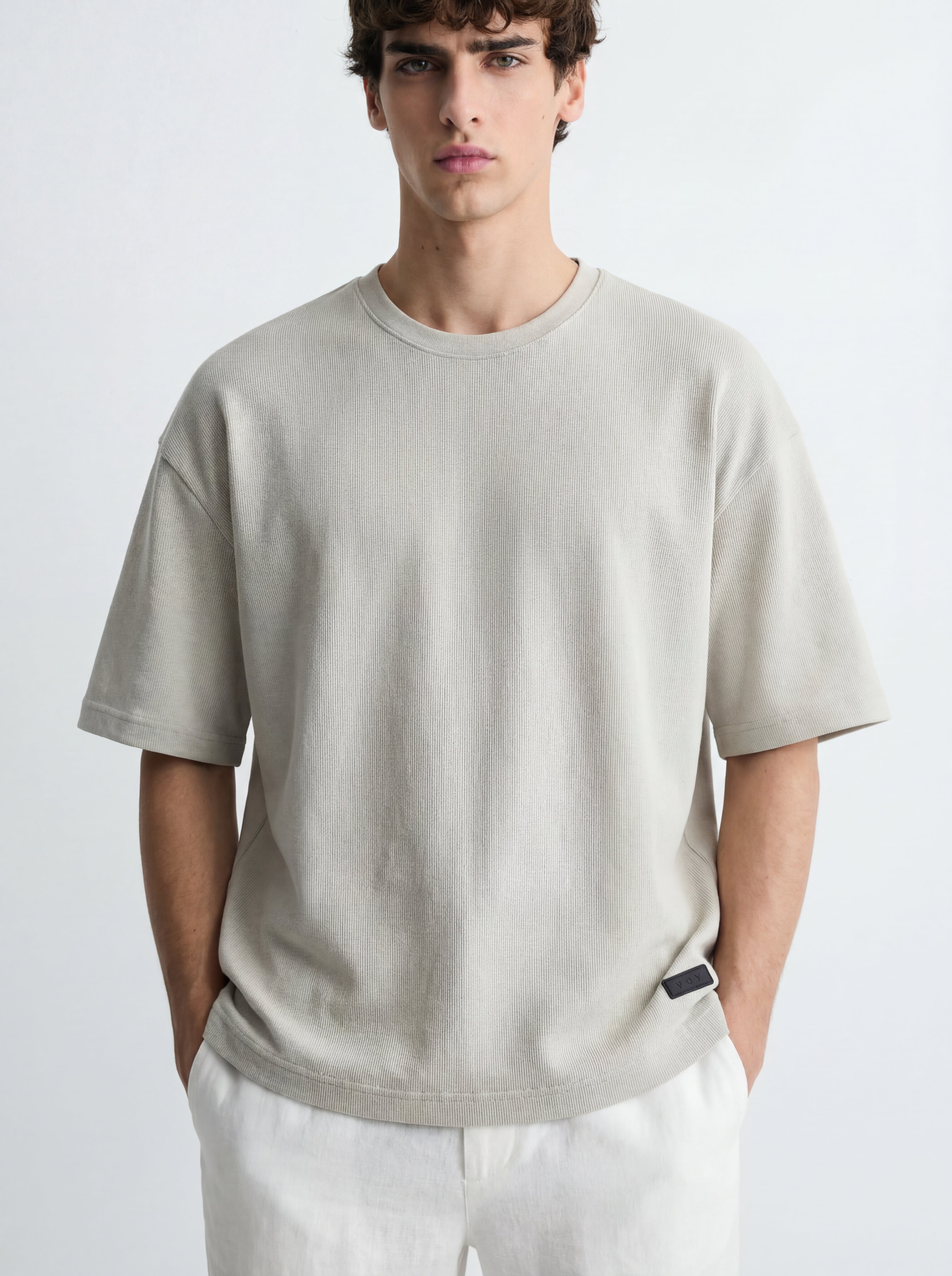 The VOY Greige Micro Rib Oversized T-Shirt combines premium cotton construction with a subtle micro rib texture that adds depth while maintaining a clean minimal aesthetic. The structured rib surface enhances durability and visual character while remaining soft, breathable, and comfortable for everyday wear.