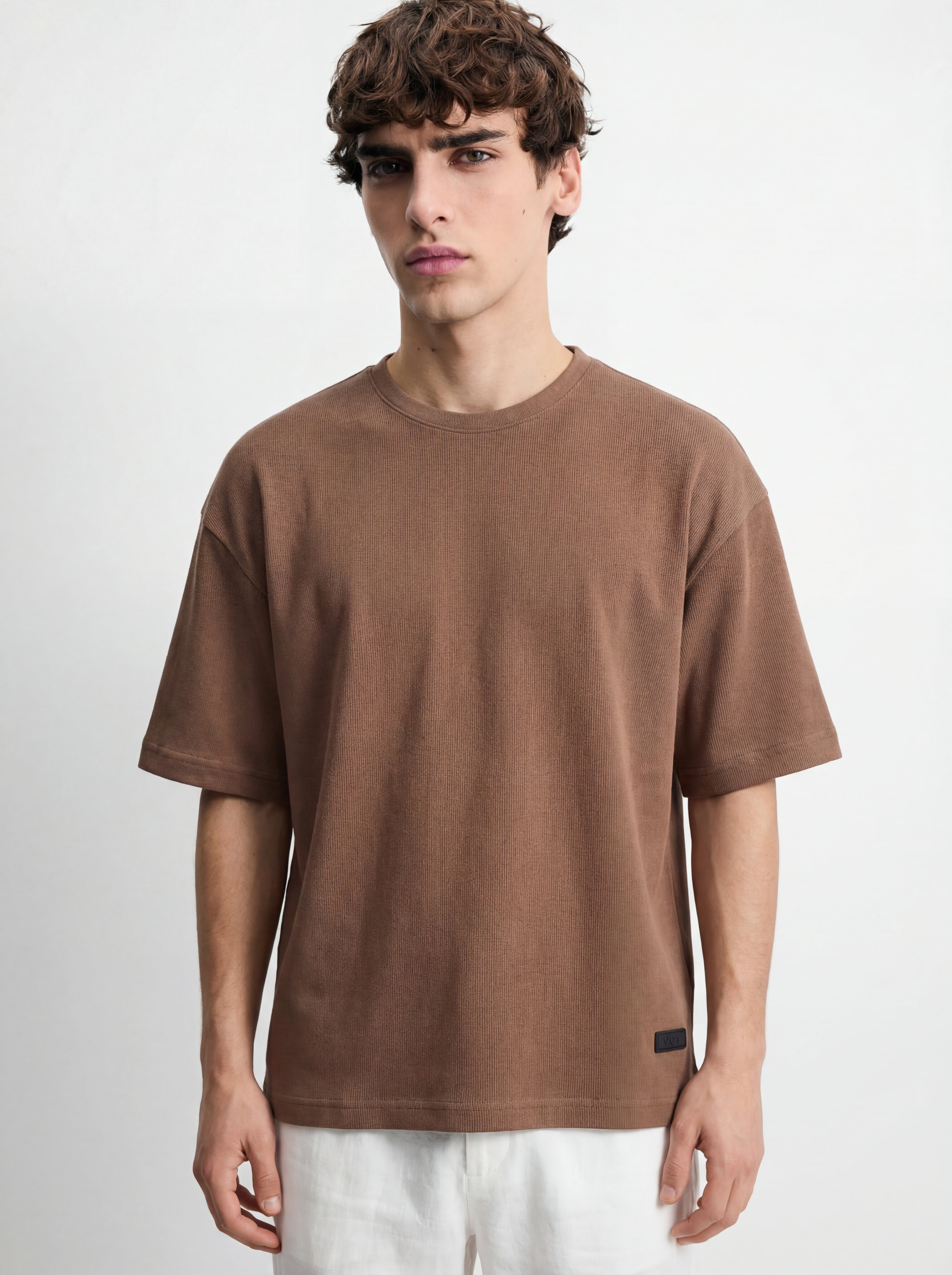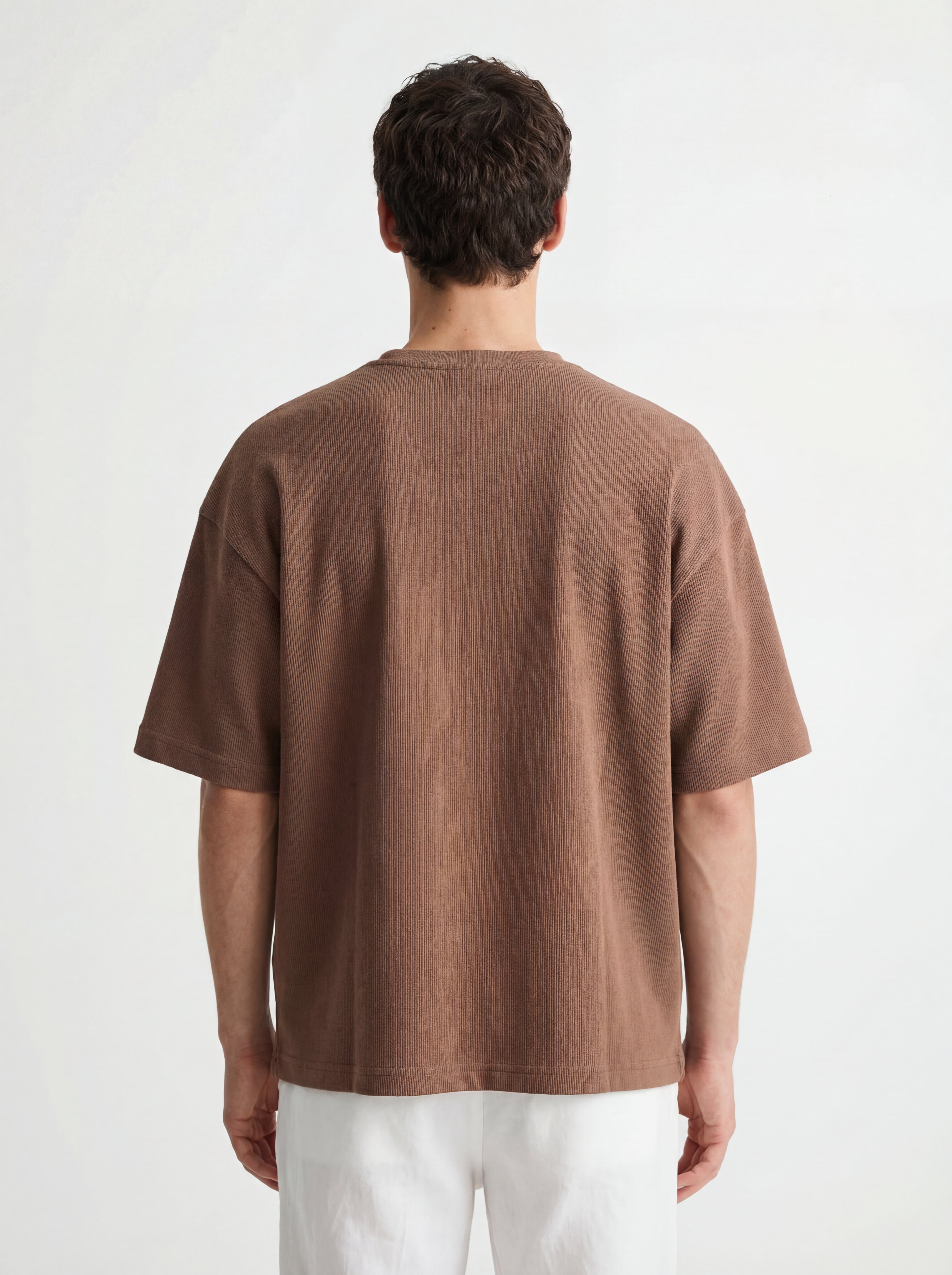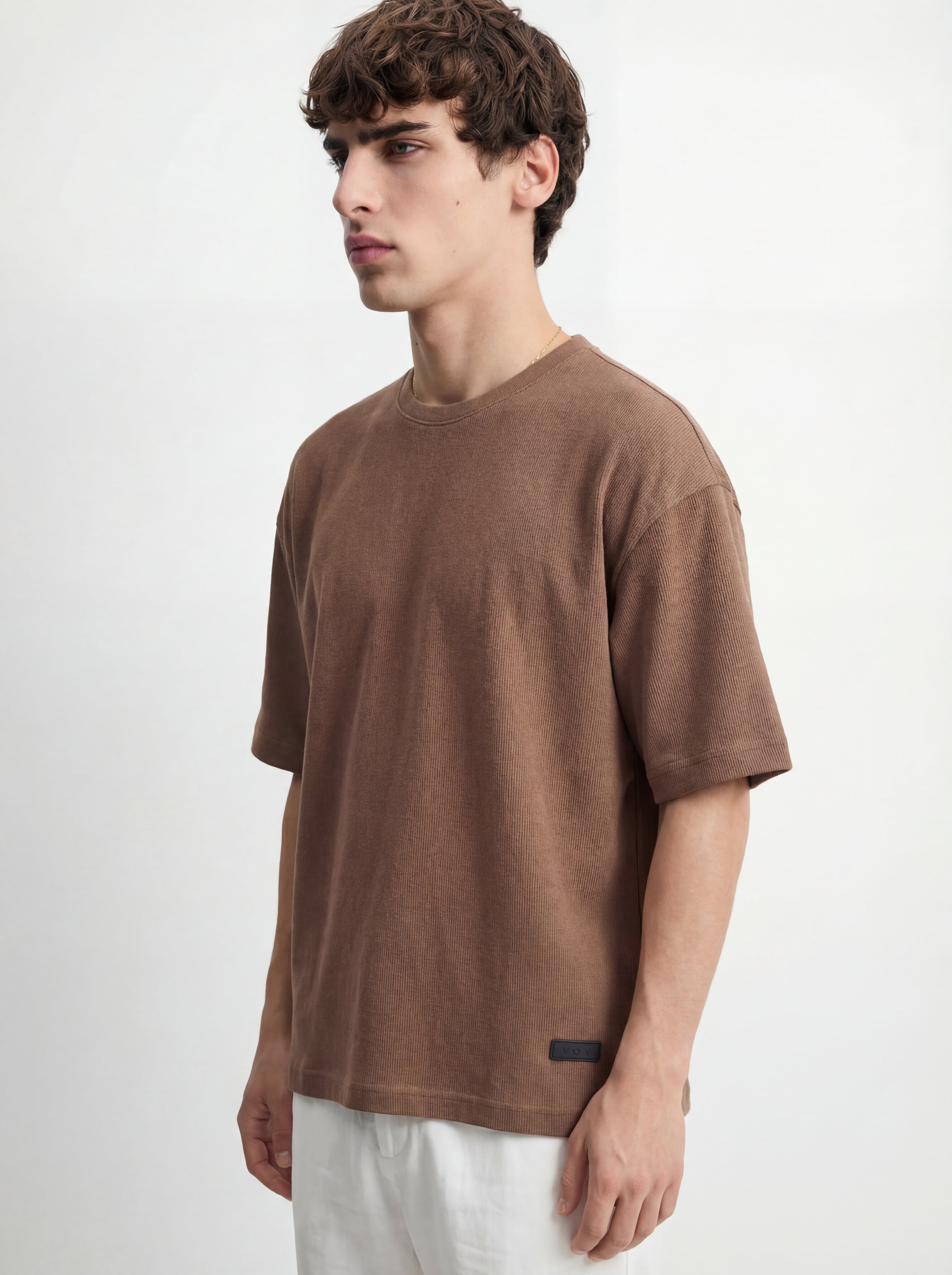 The VOY Cocoa Micro Rib Oversized T-Shirt is crafted from premium cotton featuring a subtle micro-rib knit texture that adds depth while maintaining a clean minimal aesthetic. The rib knit structure creates fine vertical lines in the fabric, giving the garment a soft textured surface while remaining breathable and comfortable for everyday wear.