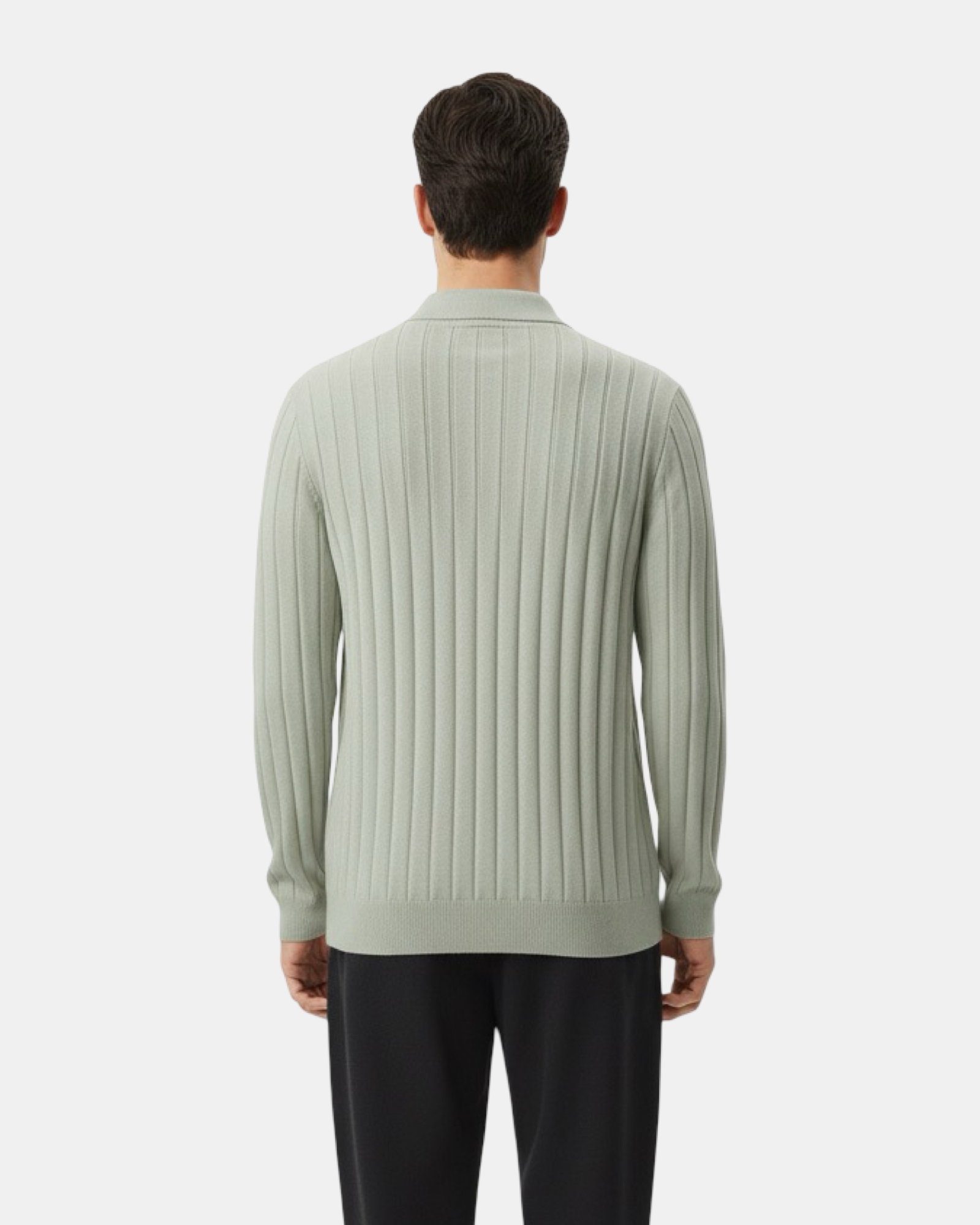The Pale Sage Vertical-Knit Polo Sweater embodies refined simplicity and timeless design. Crafted from a soft, lightweight knit, it features a vertical rib texture that elongates the silhouette and adds structure to the relaxed drape. The pale sage hue offers a calm, modern tone — effortless to style across seasons. Finished with a classic open polo collar and ribbed trims, this sweater merges comfort and sophistication, perfectly balancing casual ease with elevated detailing.