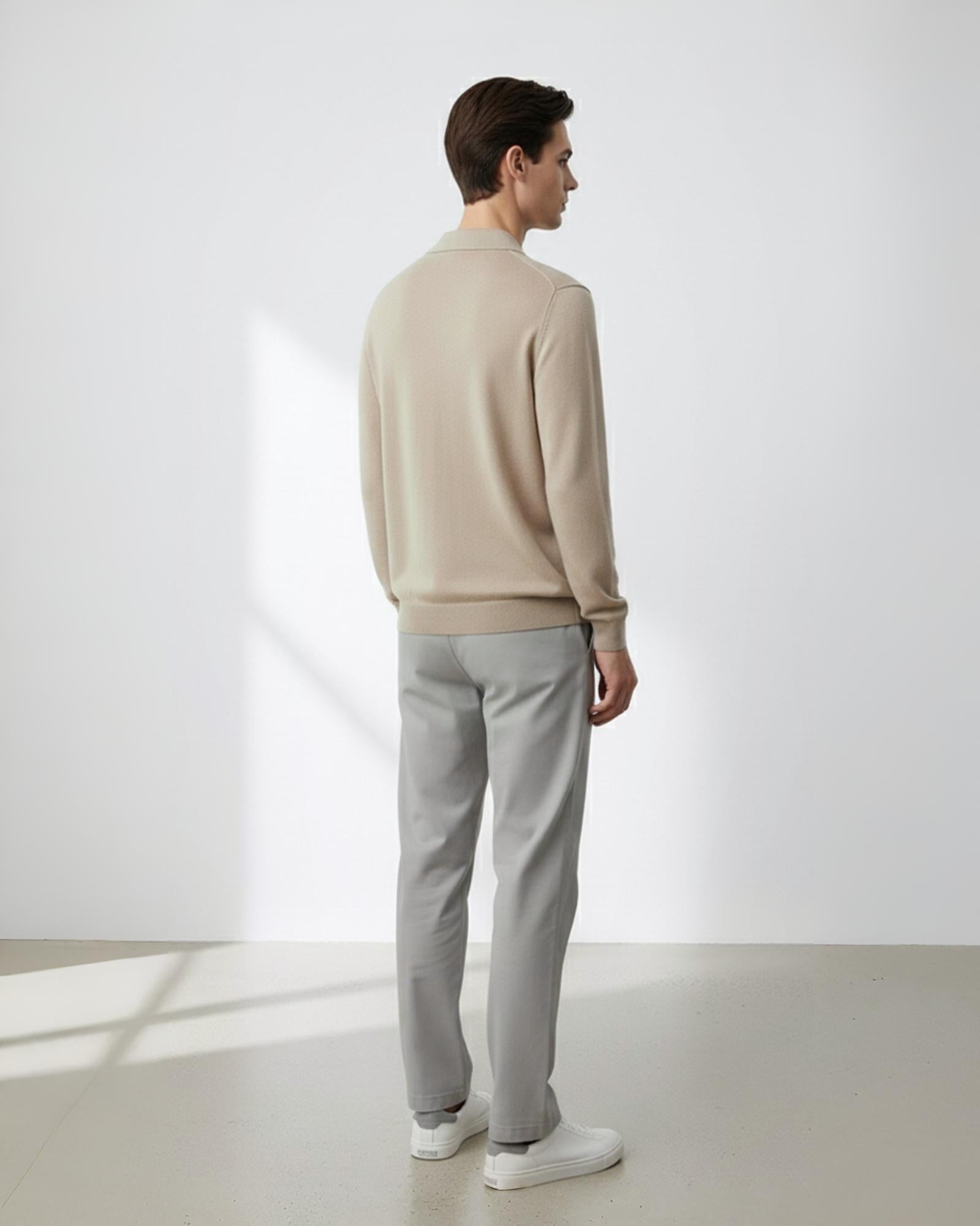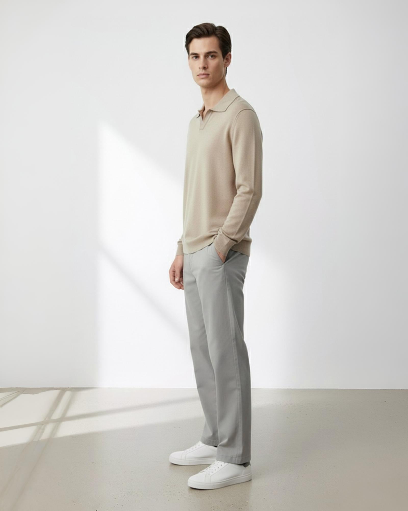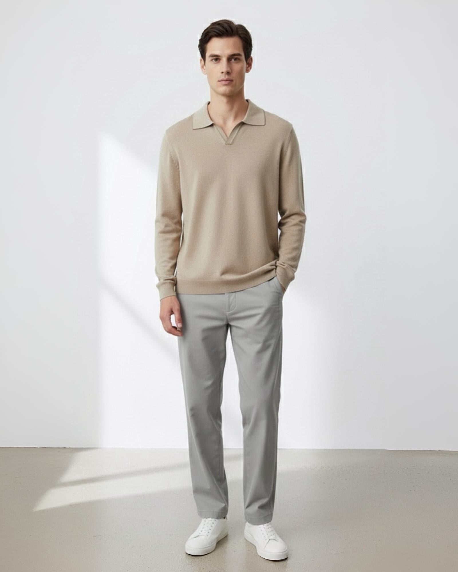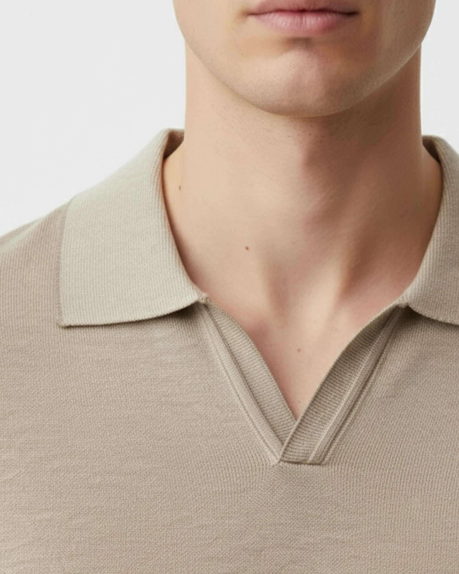The Sand Soft-Knit Open Collar Sweater features a smooth texture with a relaxed drape and a minimal open-collar neckline — blending modern ease with timeless sophistication.
