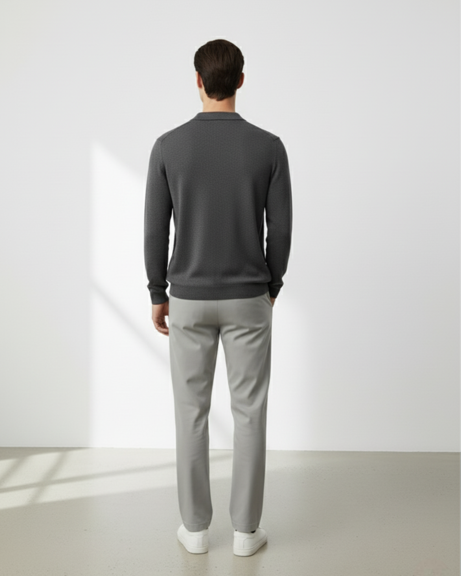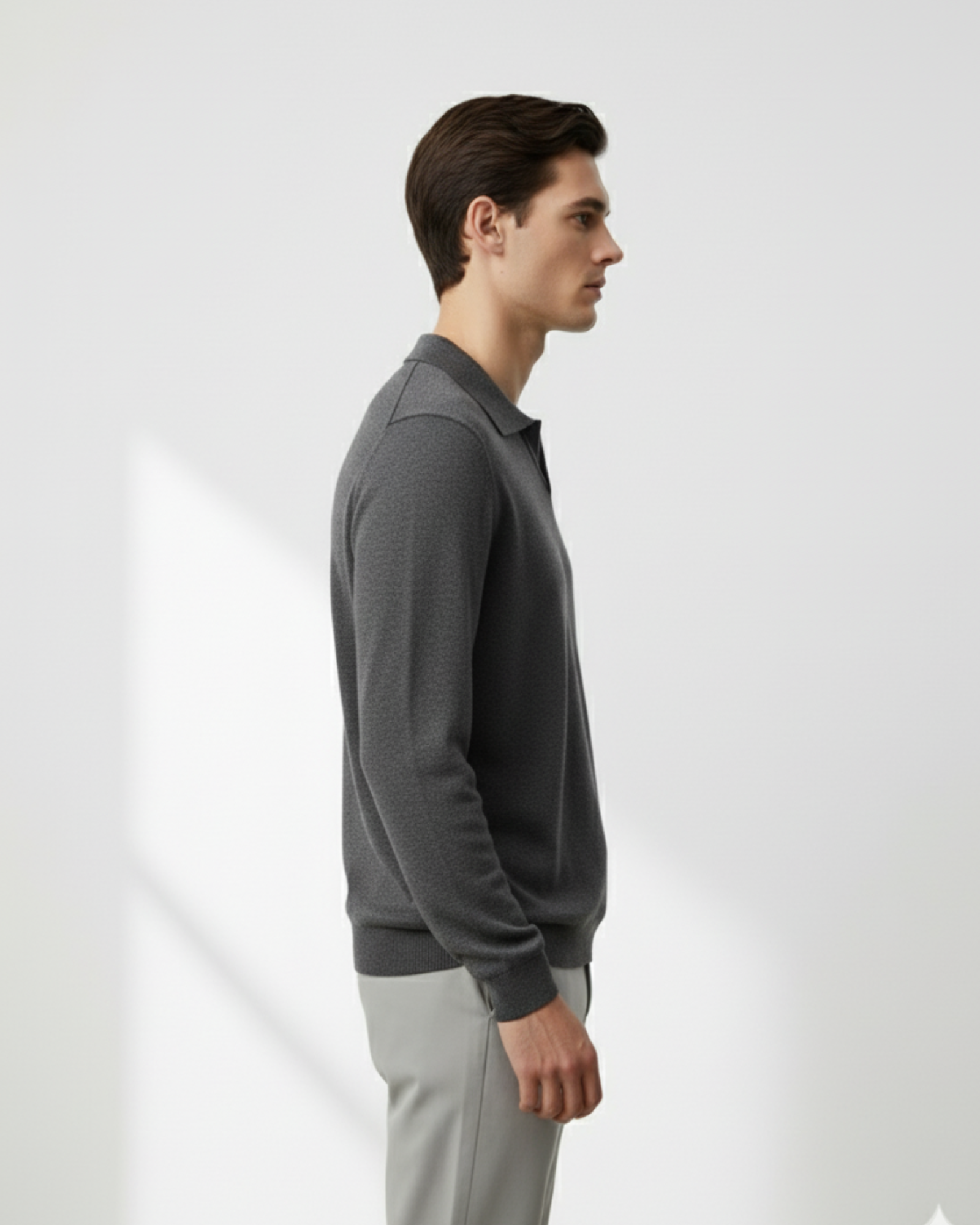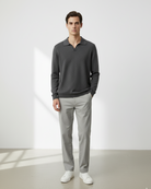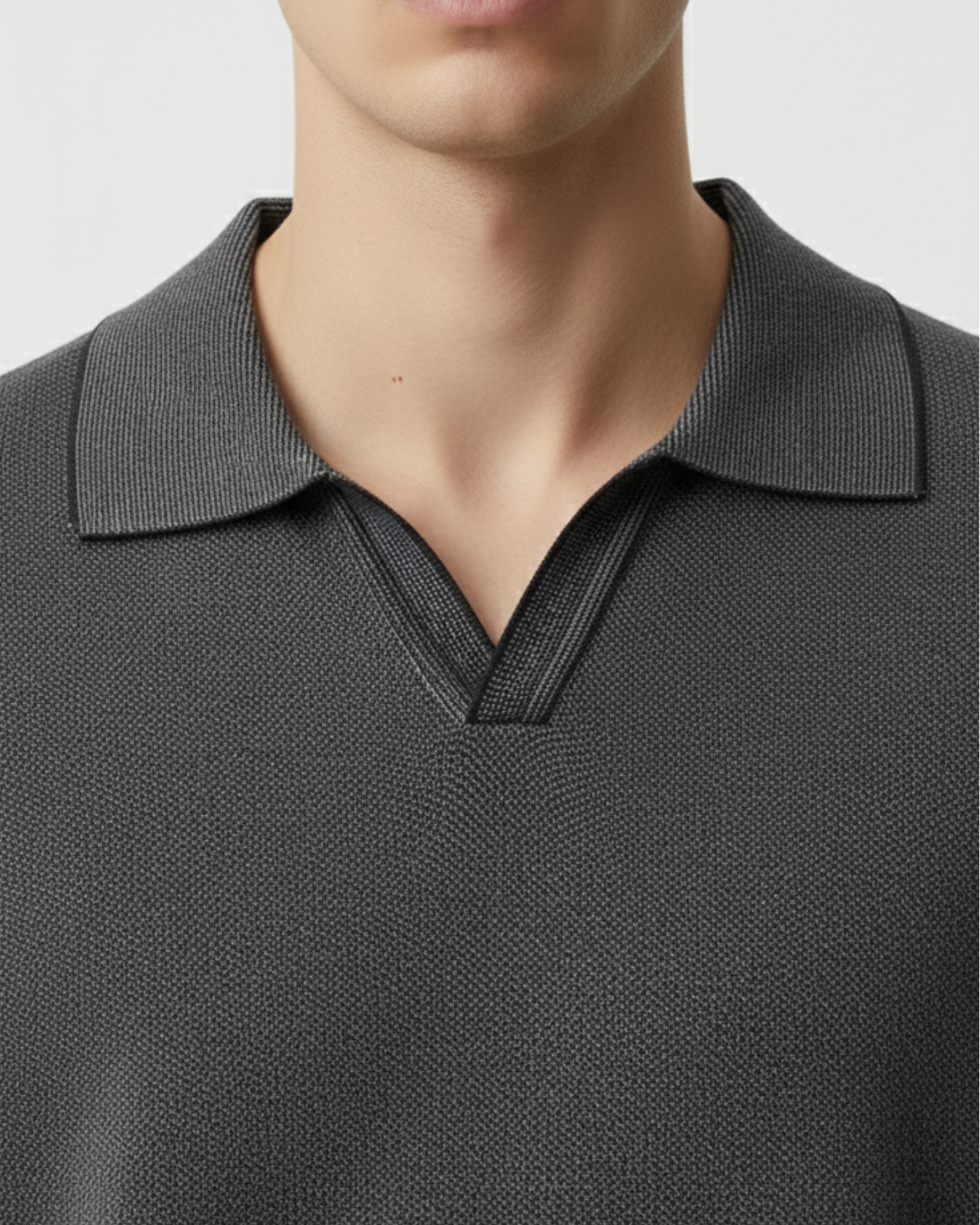 The Charcoal Soft-Knit Open Collar Sweater showcases a smooth, clean texture and a naturally relaxed drape, finished with a minimal open-collar neckline — blending effortless modernity with timeless elegance.