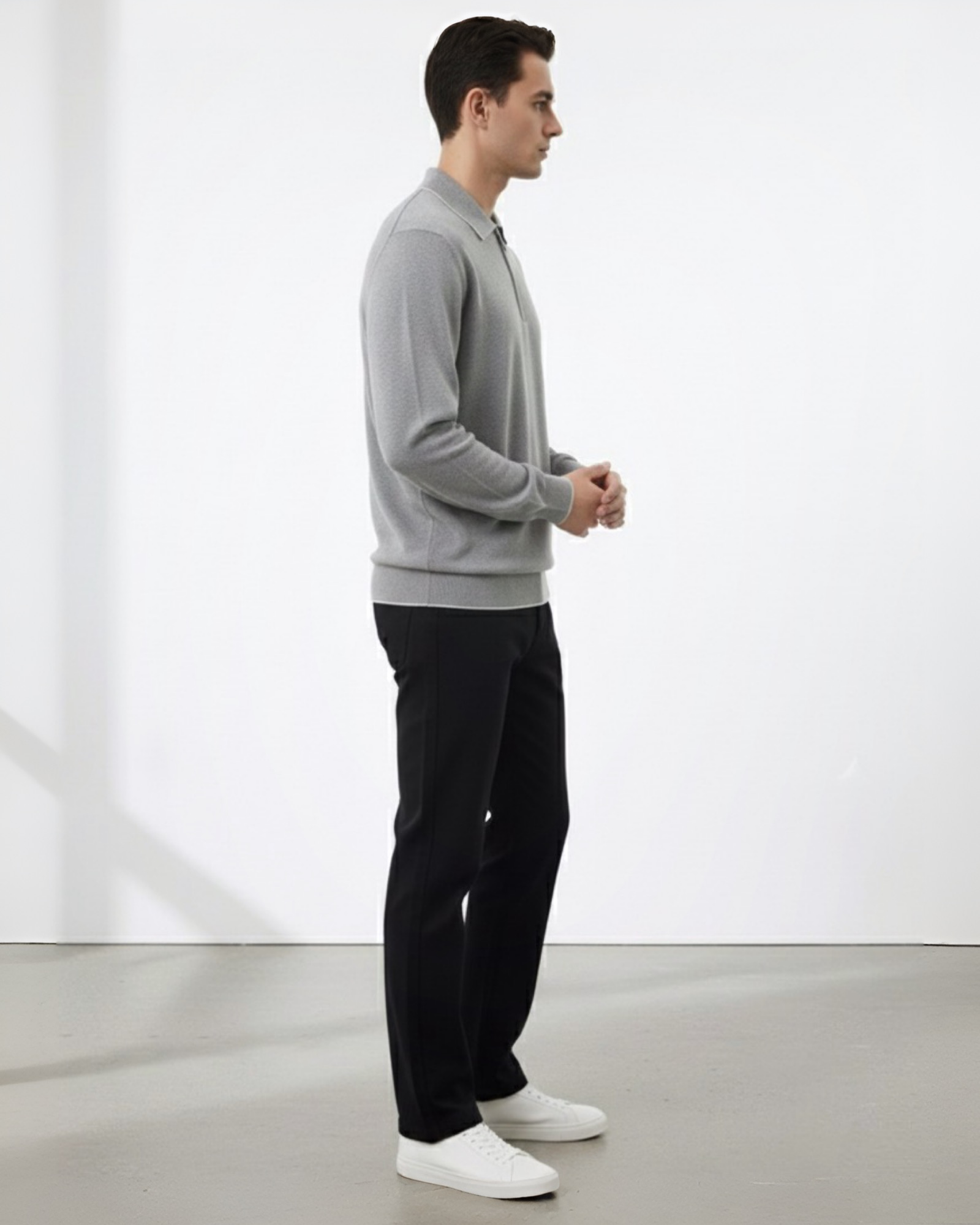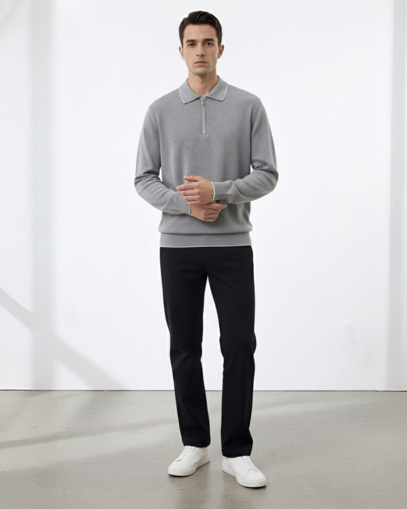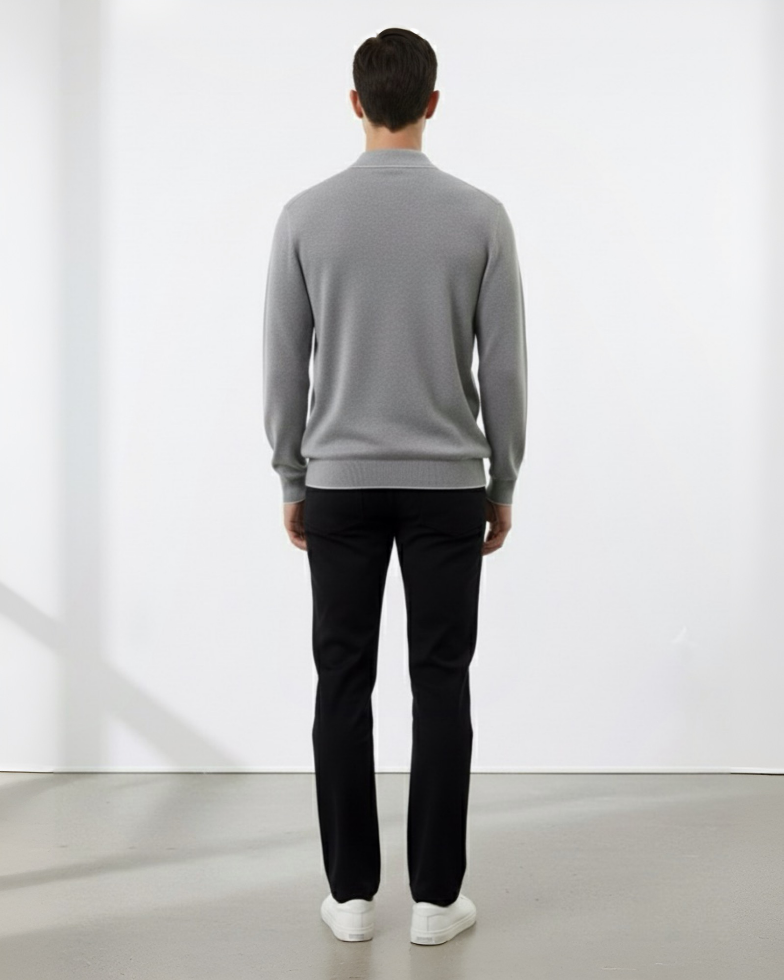 This zip-neck sweater delivers a modern, understated silhouette with a minimal collar, subtle texture, and a relaxed drape that elevates any smart-casual look.