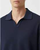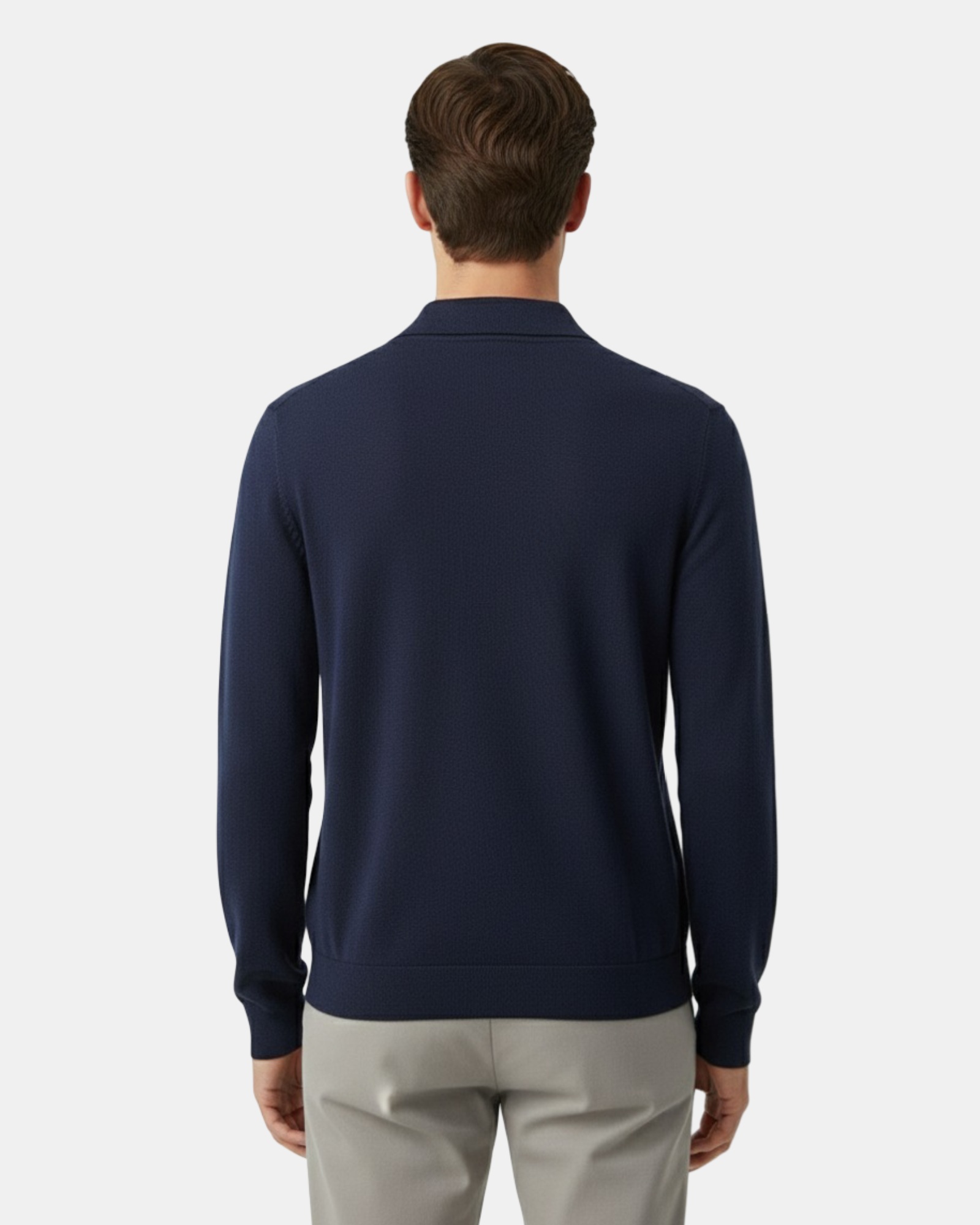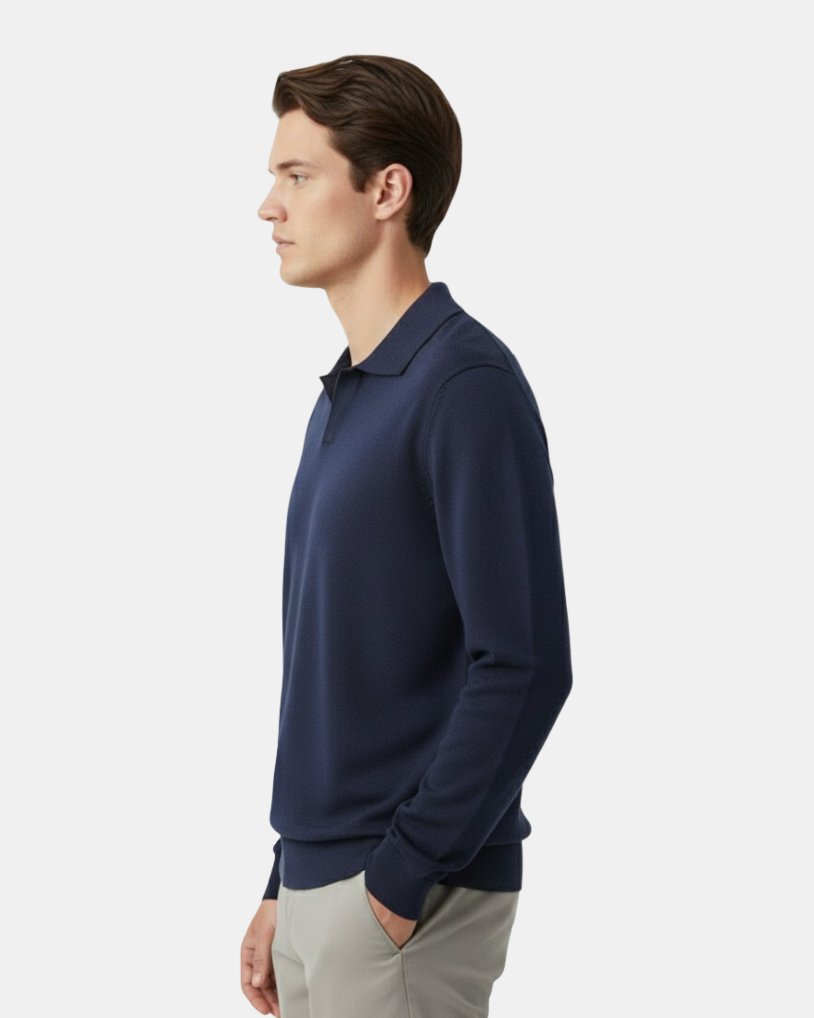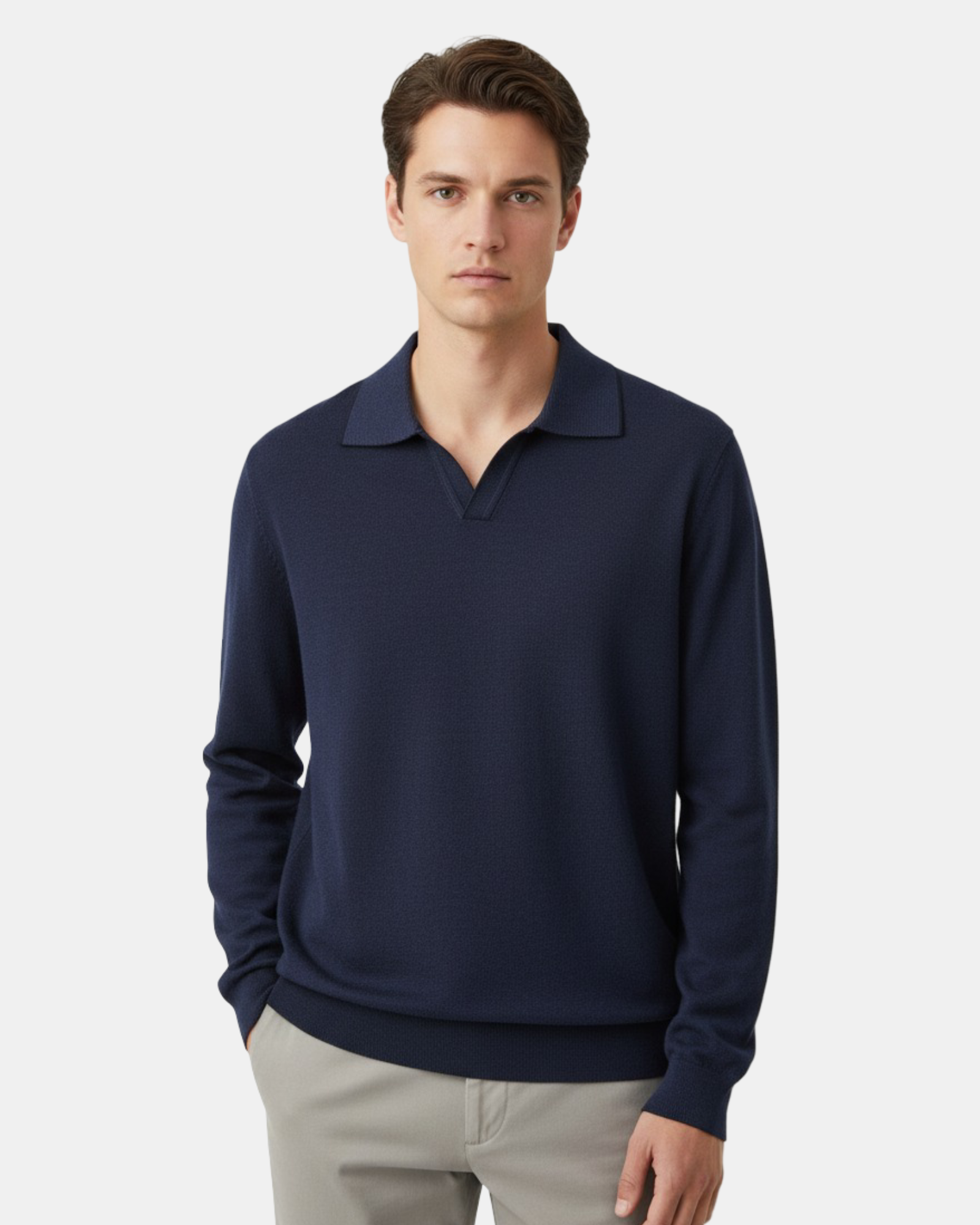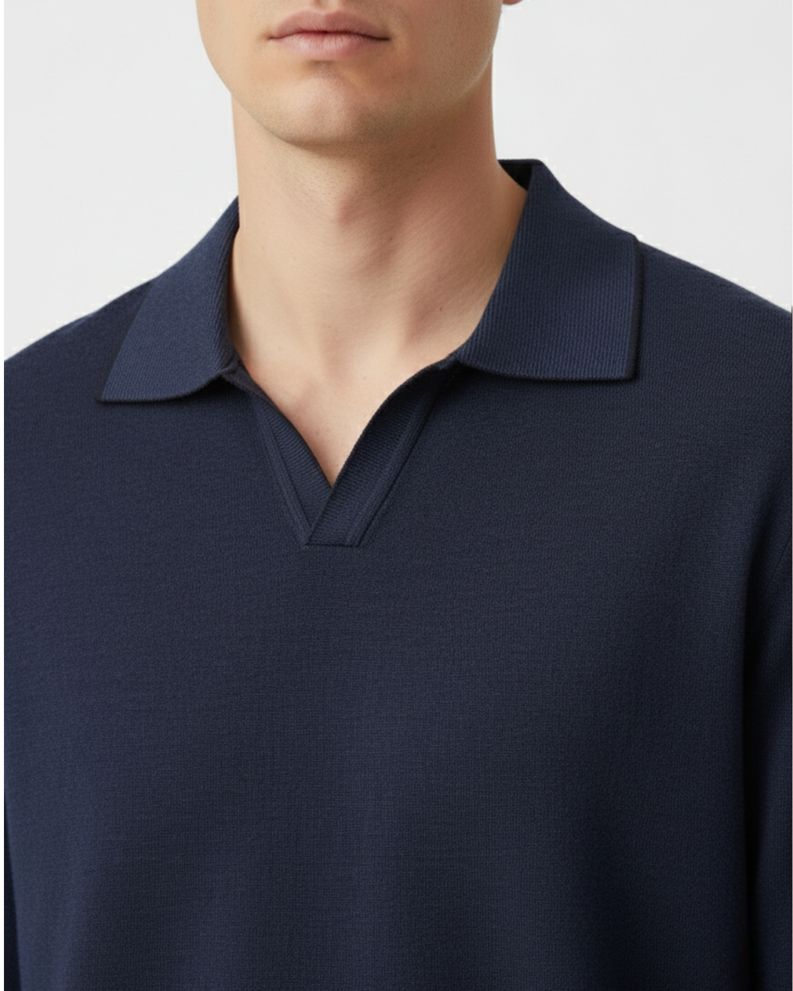 The Navy Soft-Knit Open Collar Sweater features a smooth texture with a relaxed drape and a minimal open-collar neckline — blending modern ease with timeless sophistication.
