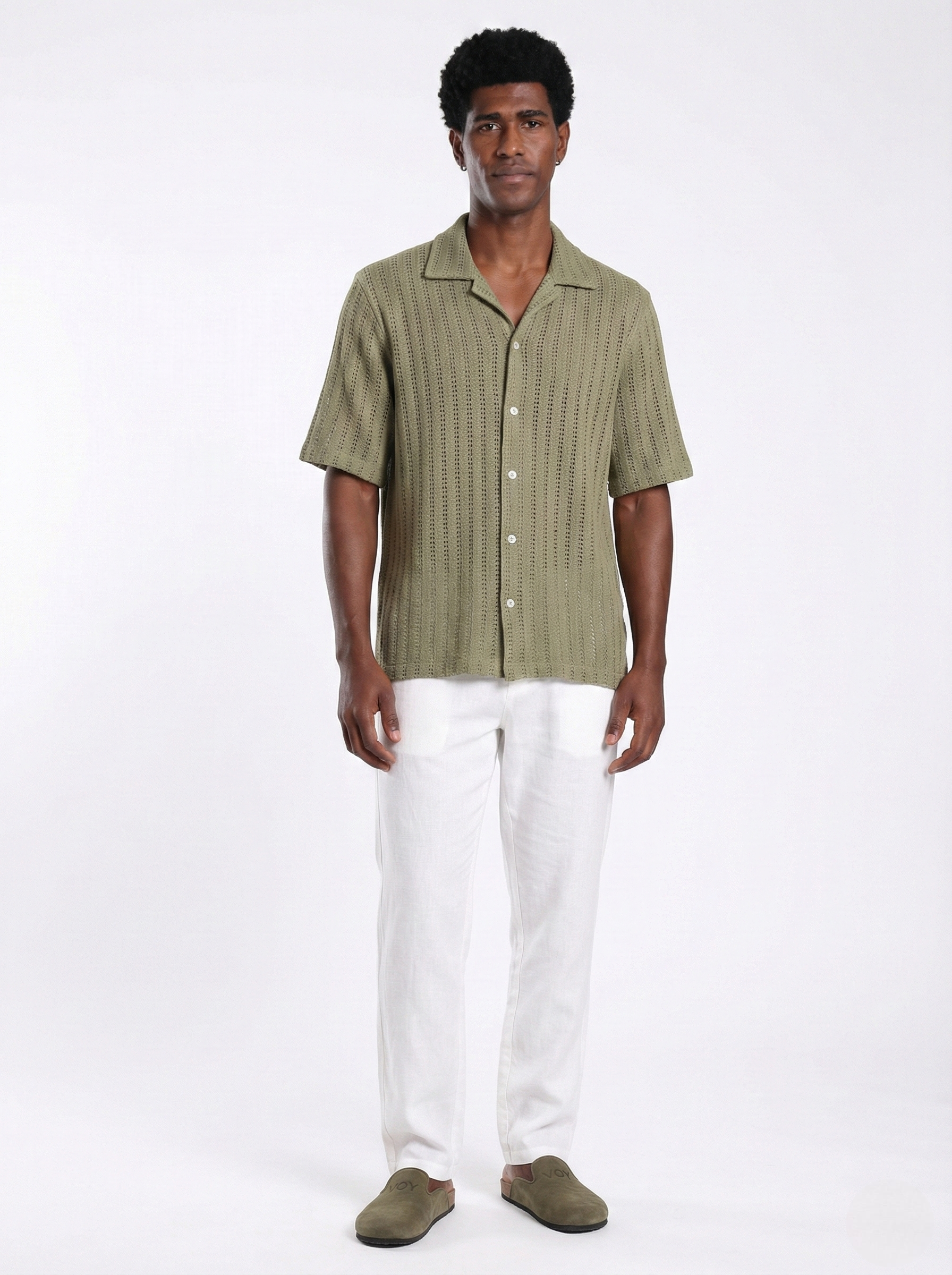 The OLIVE Textured Relaxed Cuban Shirt S26N is crafted from a lightweight breathable knit featuring a refined vertical pointelle pattern that creates subtle texture and natural airflow across the garment. The delicate open-knit structure adds depth and dimension while maintaining a clean, elegant silhouette.
