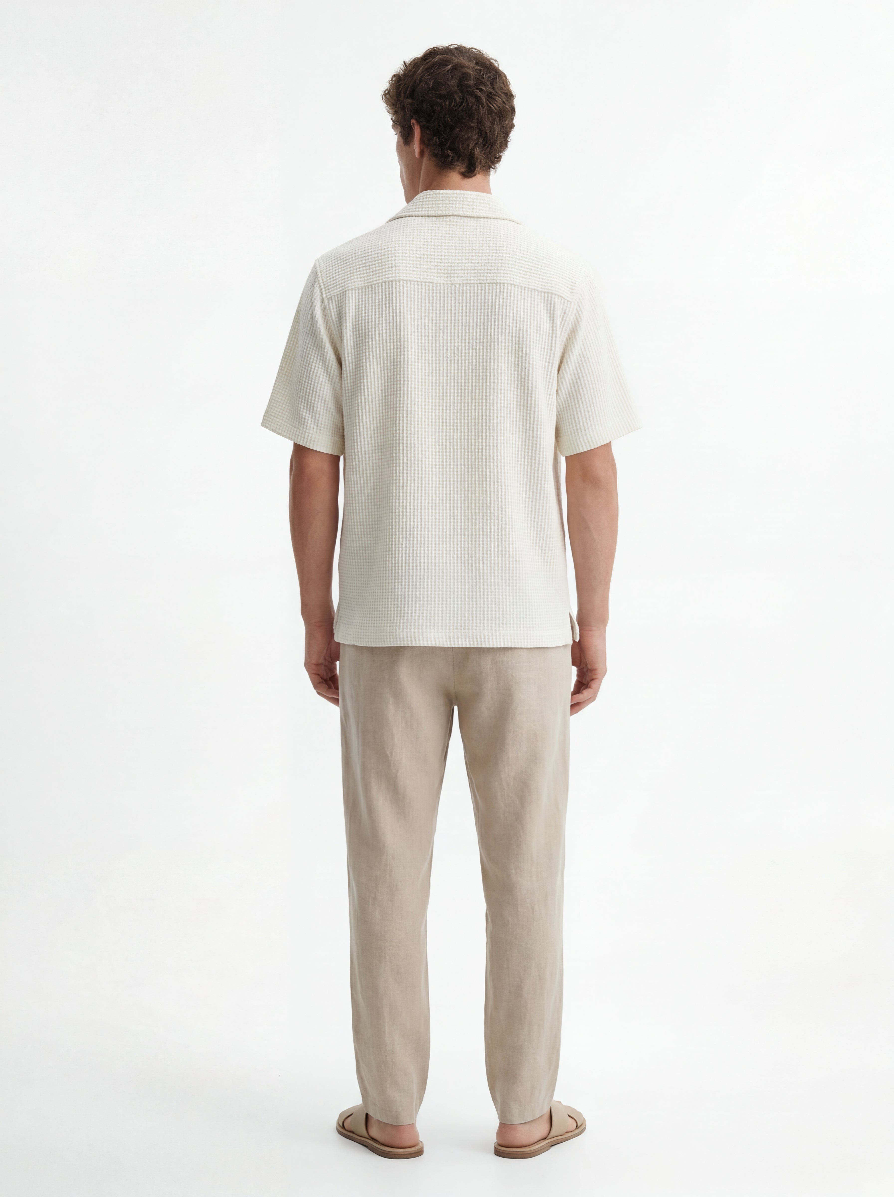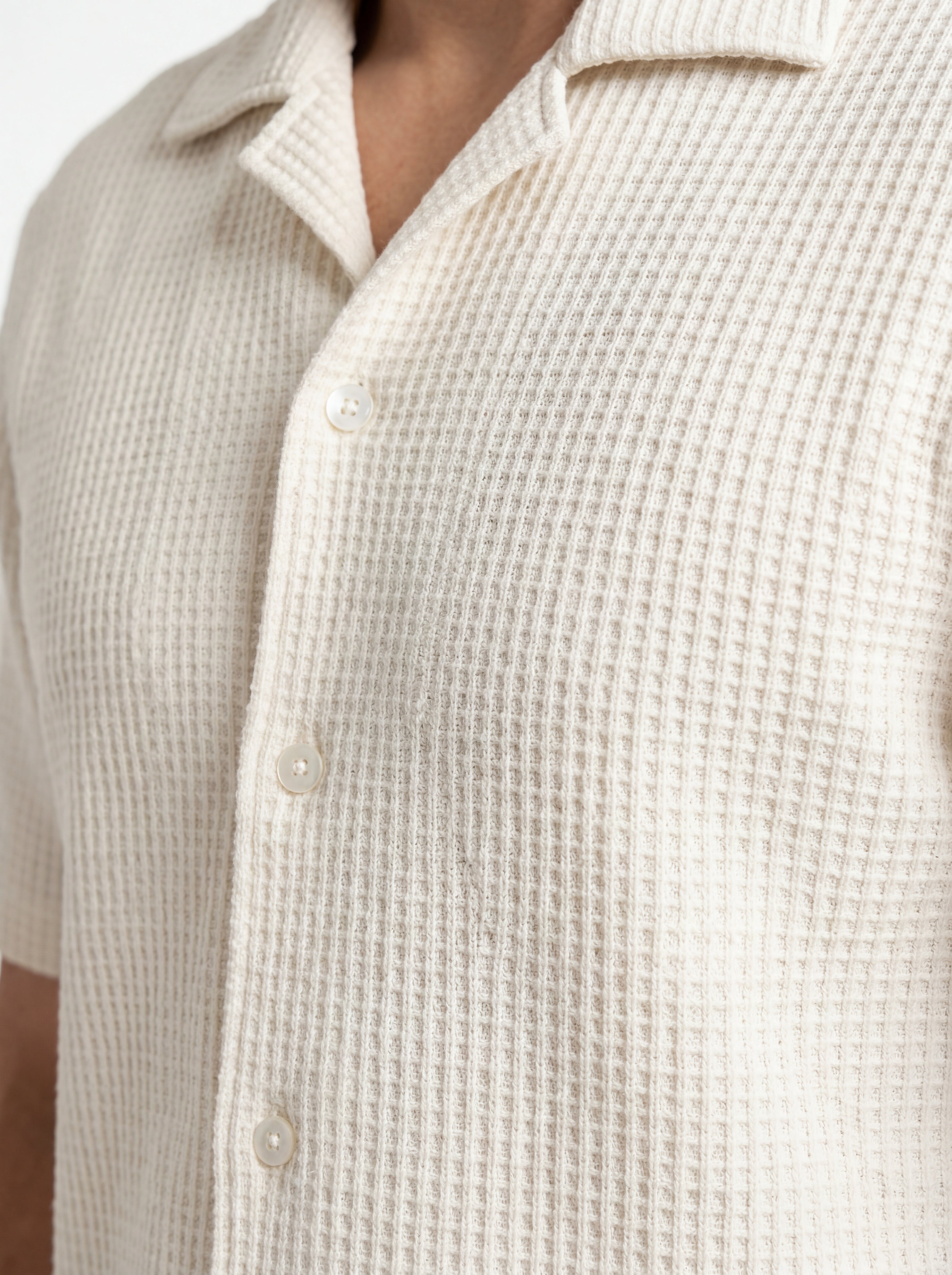 The soft cream tone brings a light, minimal aesthetic that feels fresh and versatile for warm-weather dressing. The waffle texture adds visual depth while maintaining a smooth, breathable feel against the skin. A clean button placket and relaxed collar shape complete the look with effortless sophistication.