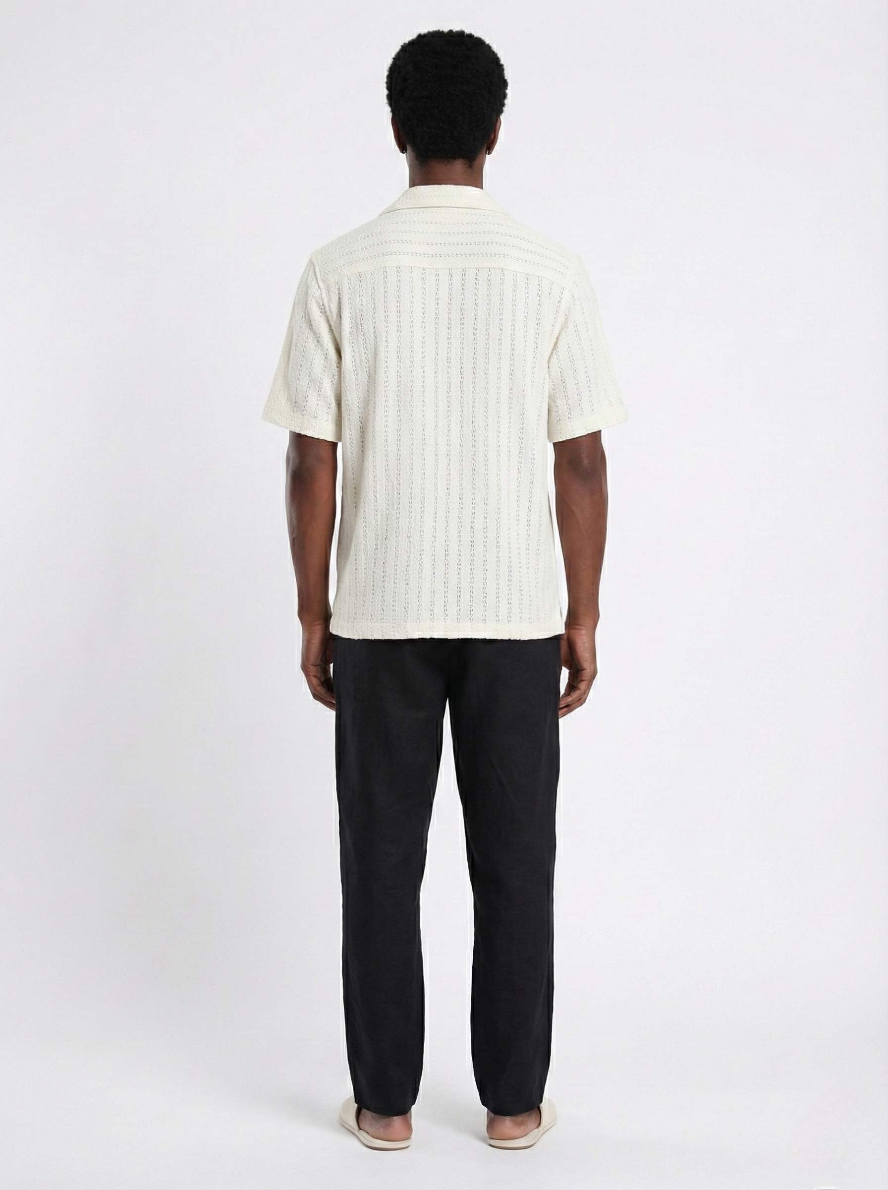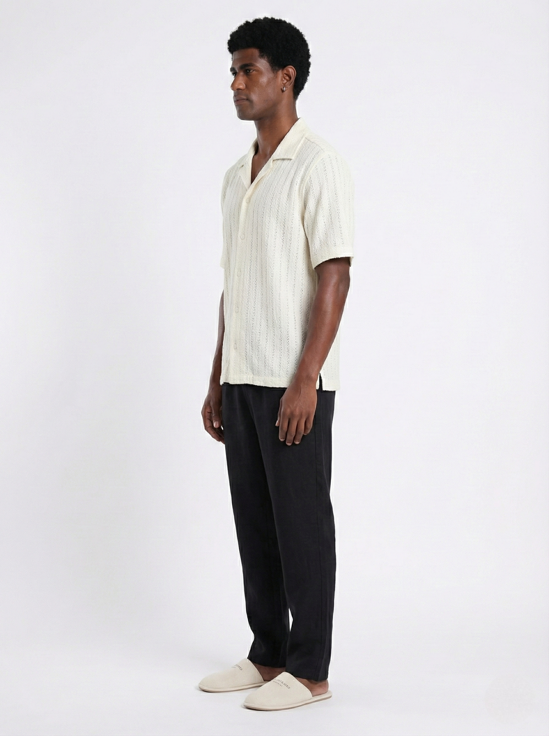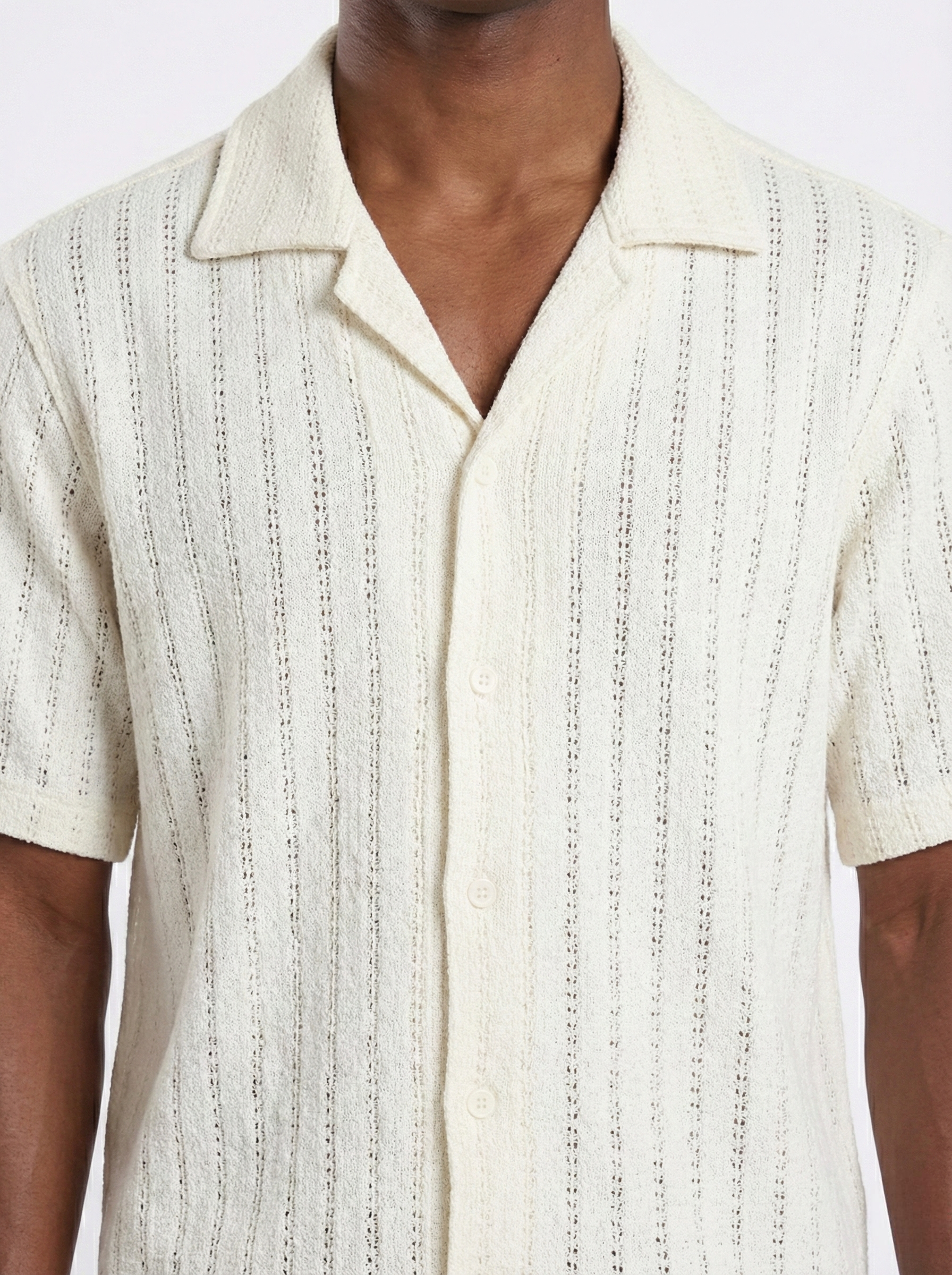 The Ecru Textured Knit Relaxed Cuban Shirt S26N is crafted from a breathable textured knit fabric that blends softness with subtle structure. The vertical open-knit pattern introduces depth and airflow, creating a lightweight feel ideal for warm-weather dressing.