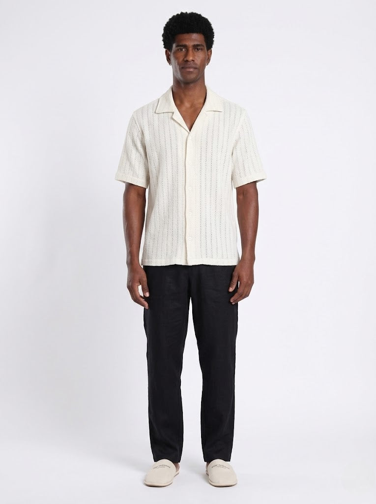 Designed with a relaxed silhouette and finished with a Cuban collar, the shirt balances laid-back comfort with clean, refined lines. The soft ecru tone enhances the natural texture of the knit, delivering a calm, sophisticated aesthetic that pairs effortlessly with both light and dark summer pieces.