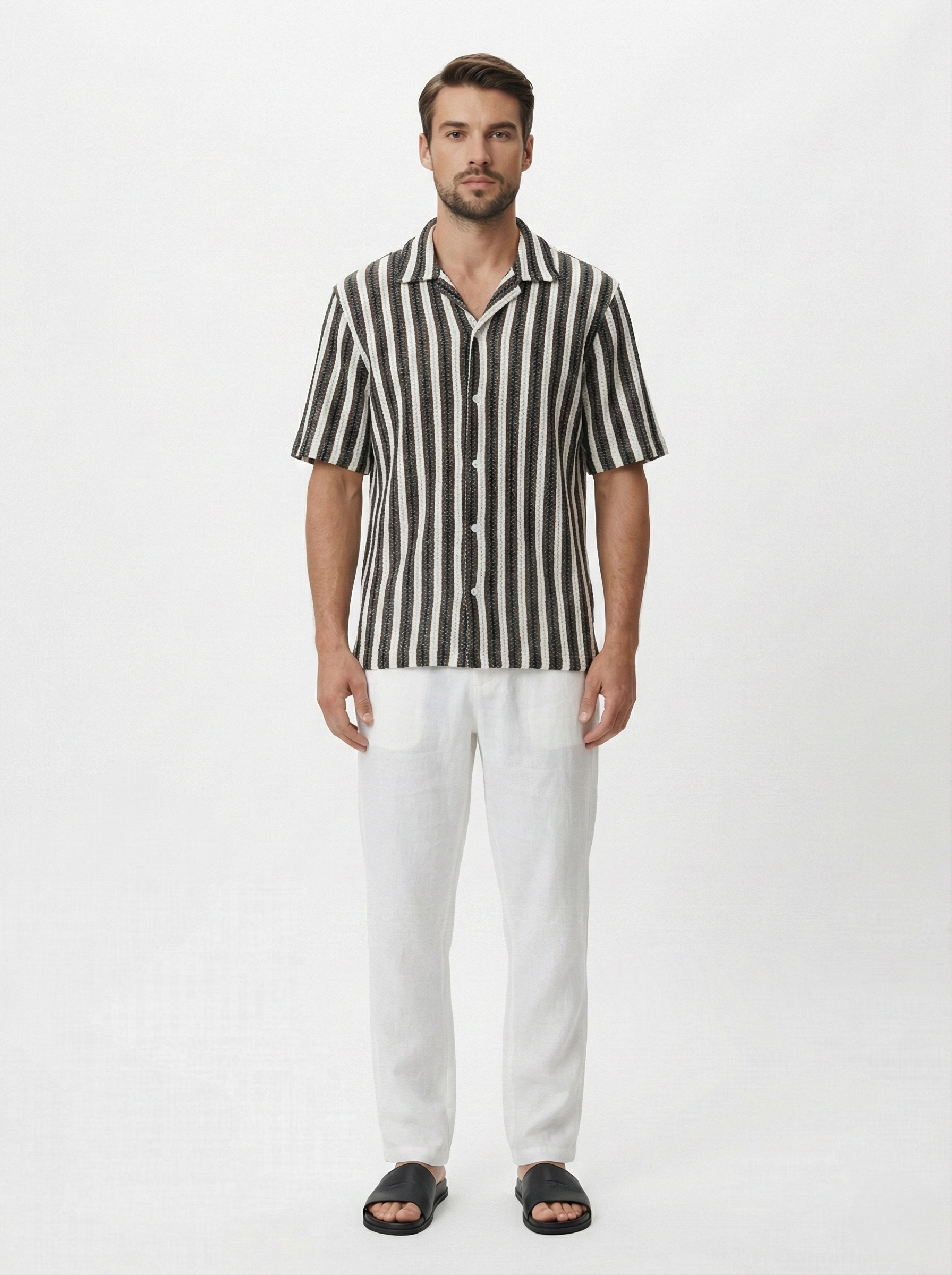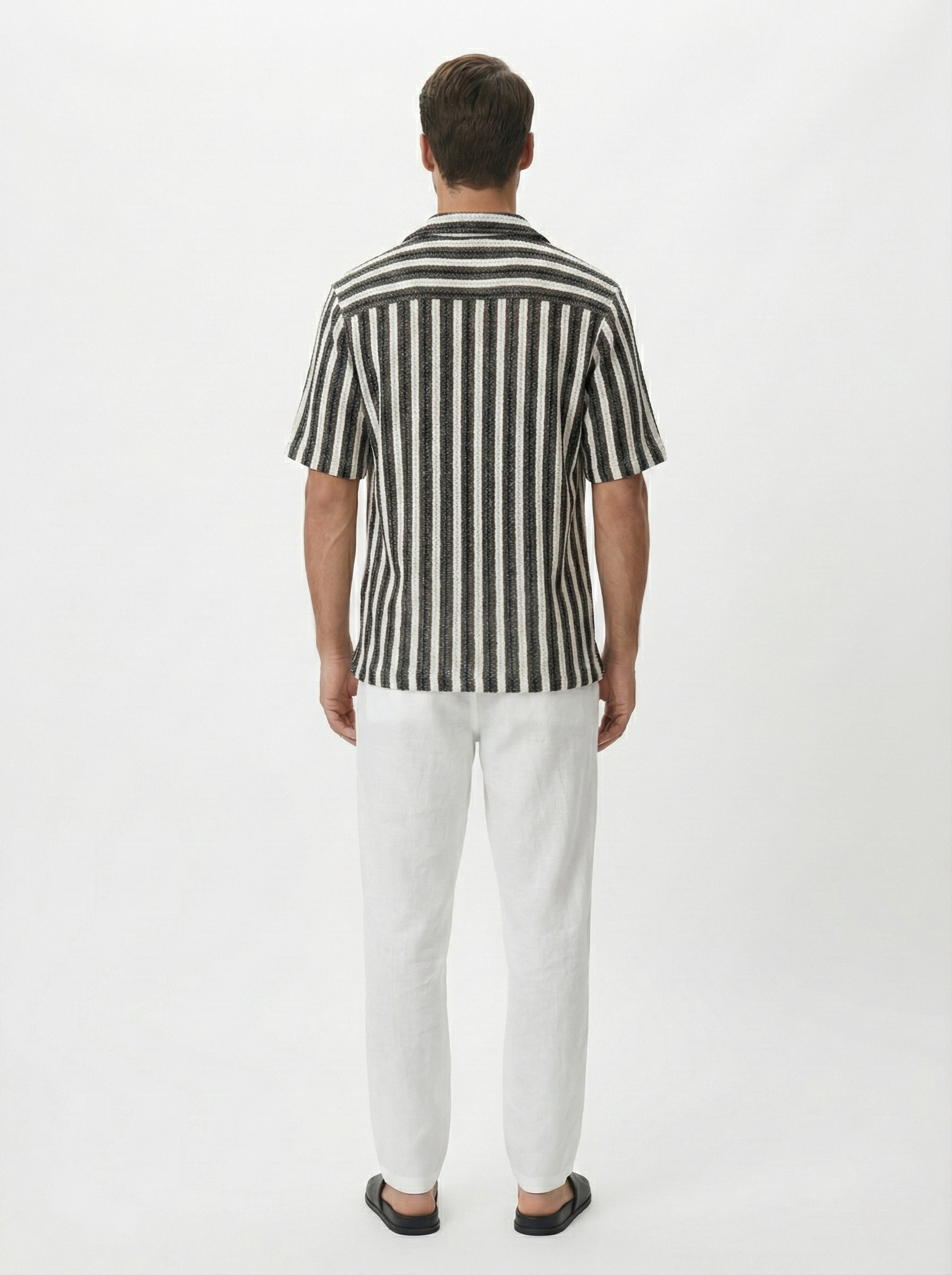 Designed with a relaxed silhouette and finished with a classic Cuban collar, the shirt balances casual comfort with a sharp, modern aesthetic. The monochrome stripe palette enhances the texture of the knit while delivering a clean contrast that pairs effortlessly with neutral summer trousers and minimal footwear.