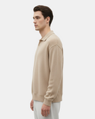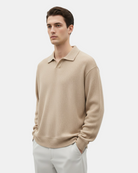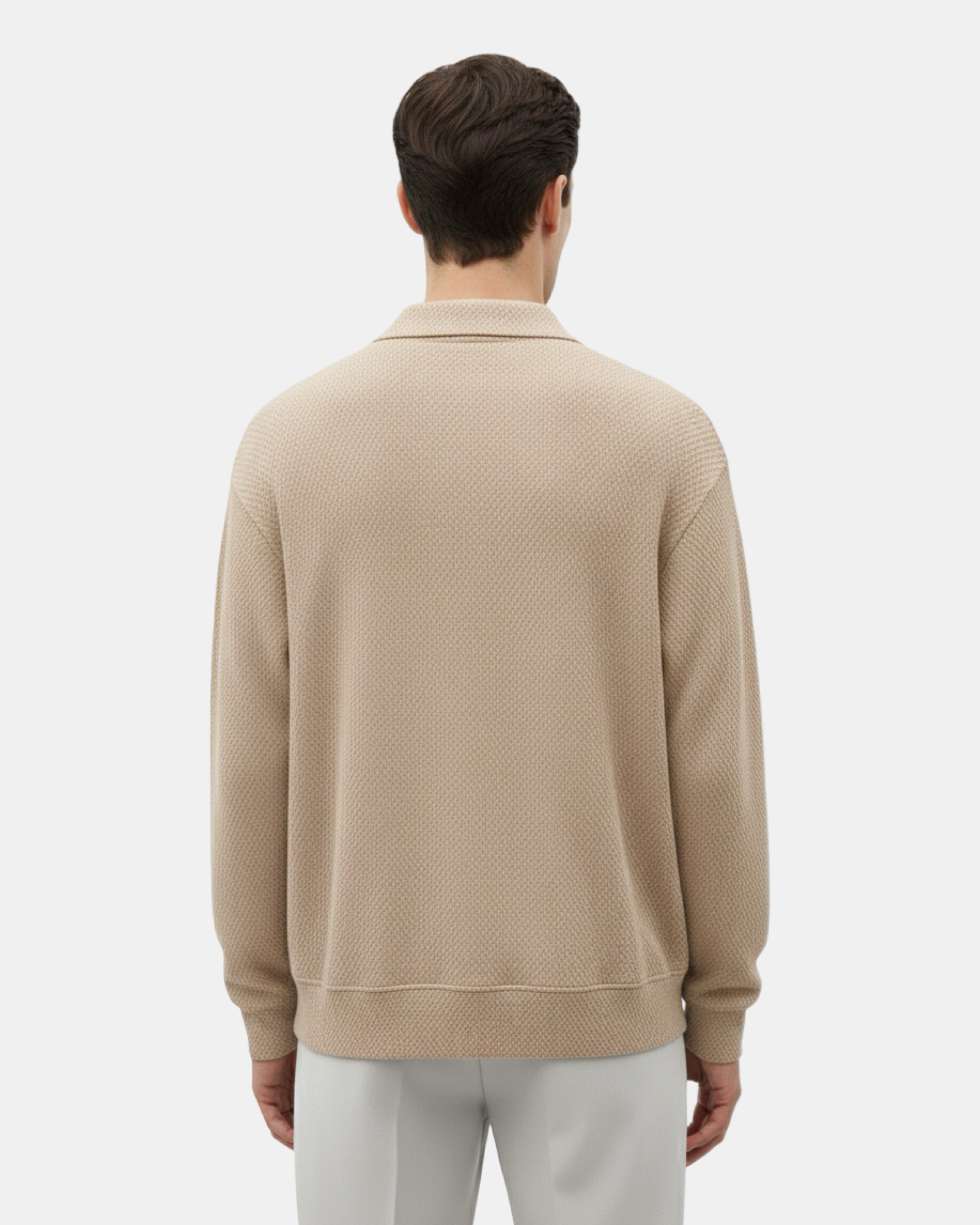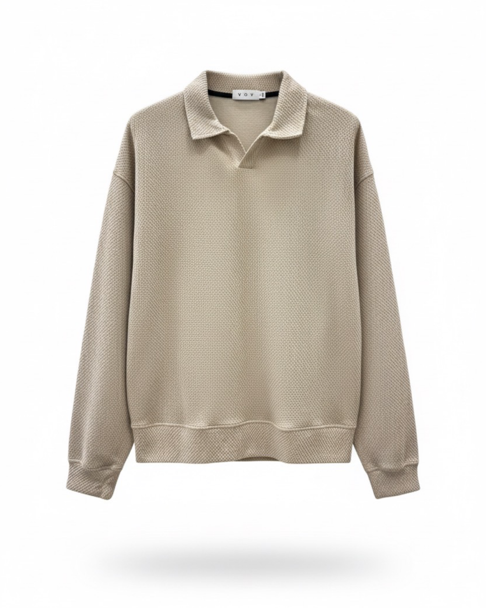 The beige Grid-Stitch Knit Polo combines modern texture with timeless sophistication. Crafted from a premium soft-knit fabric, it features a subtle grid-stitch pattern that adds refined depth and visual interest to the minimalist silhouette. The taupe shade delivers a neutral yet elevated tone, effortlessly pairing with both casual and tailored looks. Designed for versatility and comfort, this piece reflects VOY’s understated approach to contemporary knitwear.