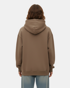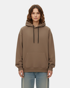 This hoodie in a rich brown hue combines minimal design with ultimate comfort. Crafted from a premium mid-weight cotton-blend fabric, it offers a smooth, structured drape while remaining breathable and soft against the skin. The classic kangaroo pocket and ribbed hems provide a secure fit and functionality, while the tonal stitching enhances the clean silhouette.