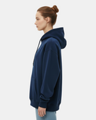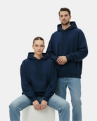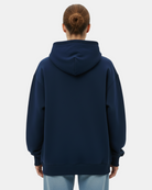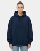 This hoodie in a rich navy hue combines minimal design with ultimate comfort. Crafted from a premium mid-weight cotton-blend fabric, it offers a smooth, structured drape while remaining breathable and soft against the skin. The classic kangaroo pocket and ribbed hems provide a secure fit and functionality, while the tonal stitching enhances the clean silhouette.