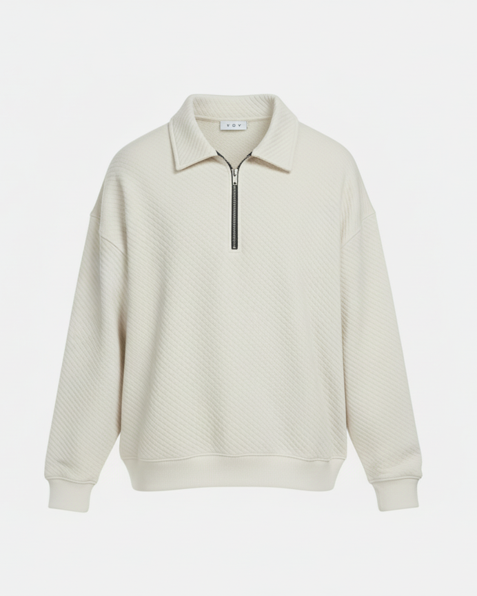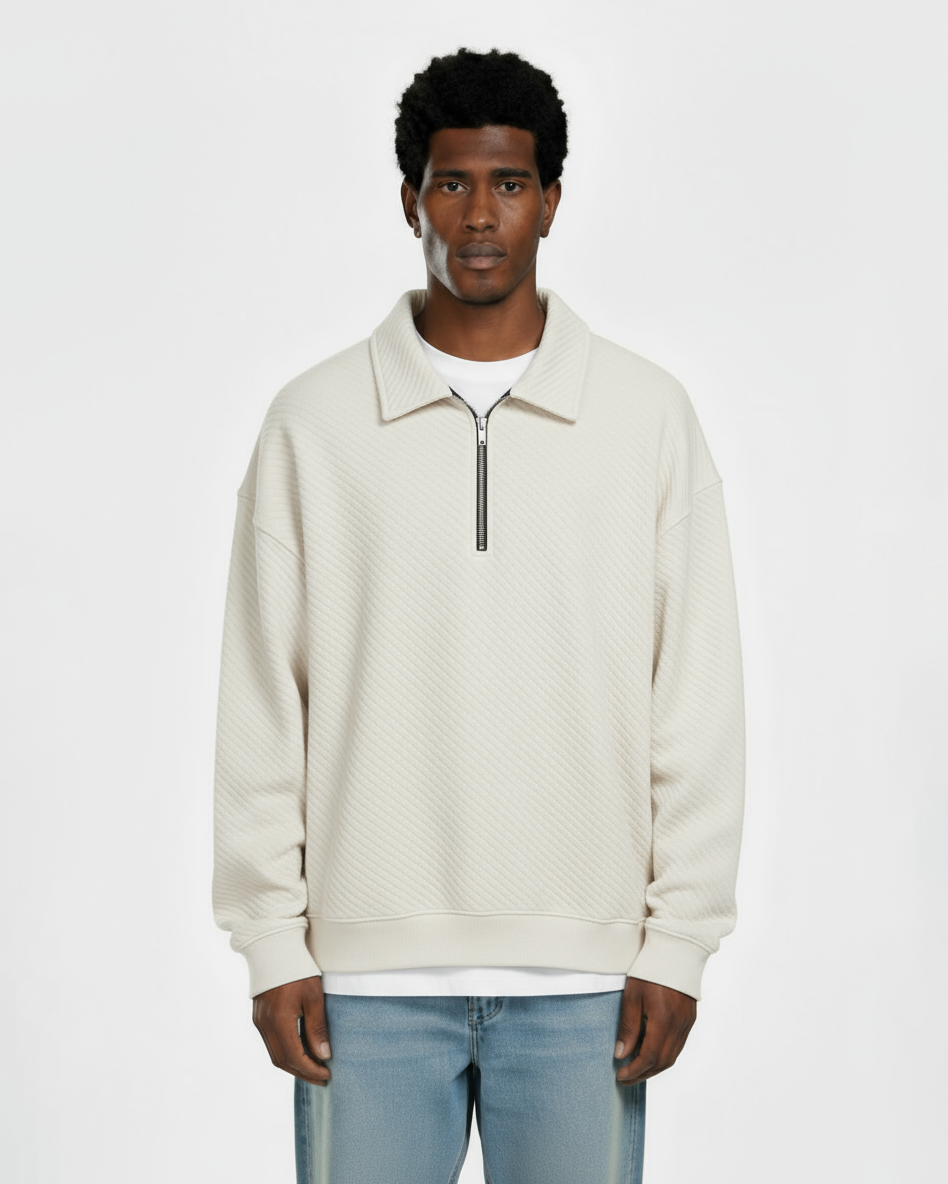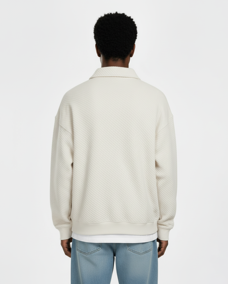 This men’s quarter-zip polo sweatshirt combines laid-back comfort with a refined edge. Crafted in a warm white tone, it features a subtle diamond-textured knit pattern that adds depth and character. The polo-style collar with a functional quarter-zip closure offers versatile styling, while the relaxed fit ensures all-day comfort. A modern essential that blends casual ease with smart-casual appeal.