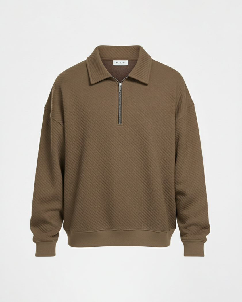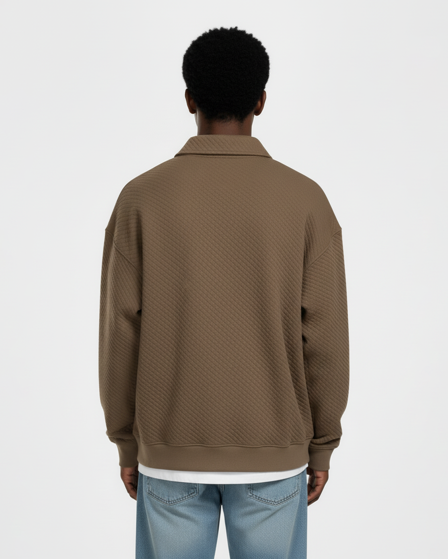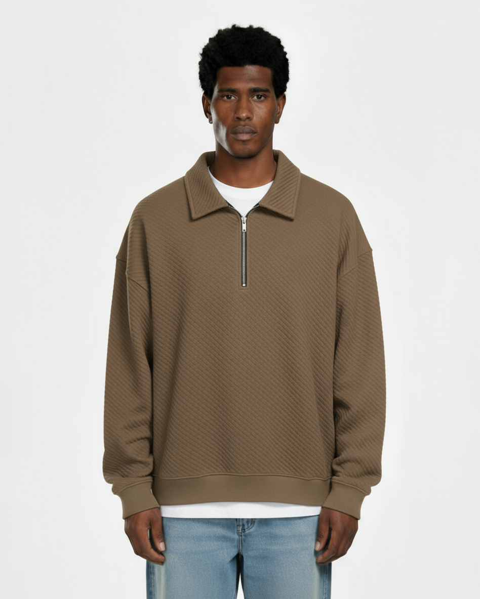 This men’s quarter-zip polo sweatshirt combines laid-back comfort with a refined edge. Crafted in a warm camel-brown tone, it features a subtle diamond-textured knit pattern that adds depth and character. The polo-style collar with a functional quarter-zip closure offers versatile styling, while the relaxed fit ensures all-day comfort. A modern essential that blends casual ease with smart-casual appeal.