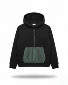 Elevate your casual wardrobe with this black zip-up hoodie, designed with a sleek modern silhouette and a standout contrast pocket. Crafted from a premium fabric blend, it combines everyday comfort with a refined streetwear edge. The technical nylon front pocket adds a stylish yet functional detail, making this hoodie a versatile piece for layering or wearing solo.