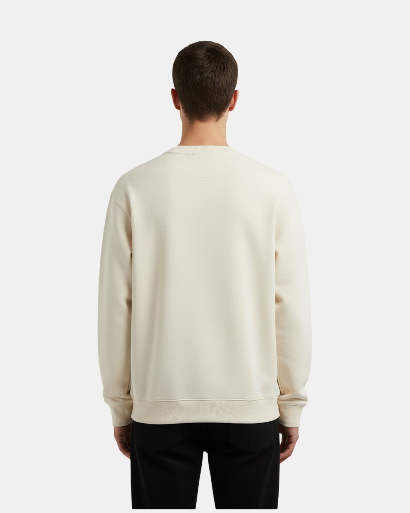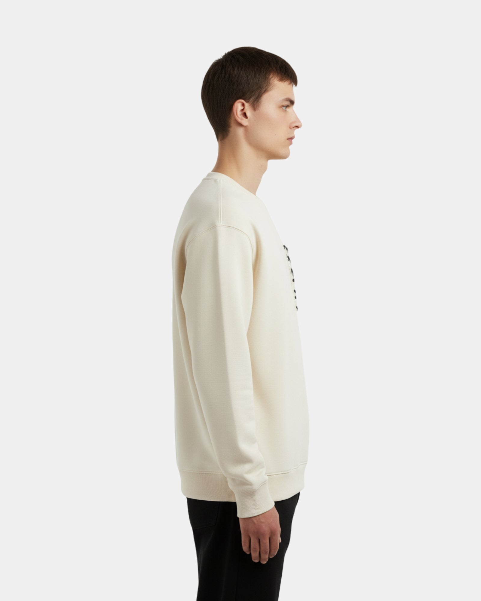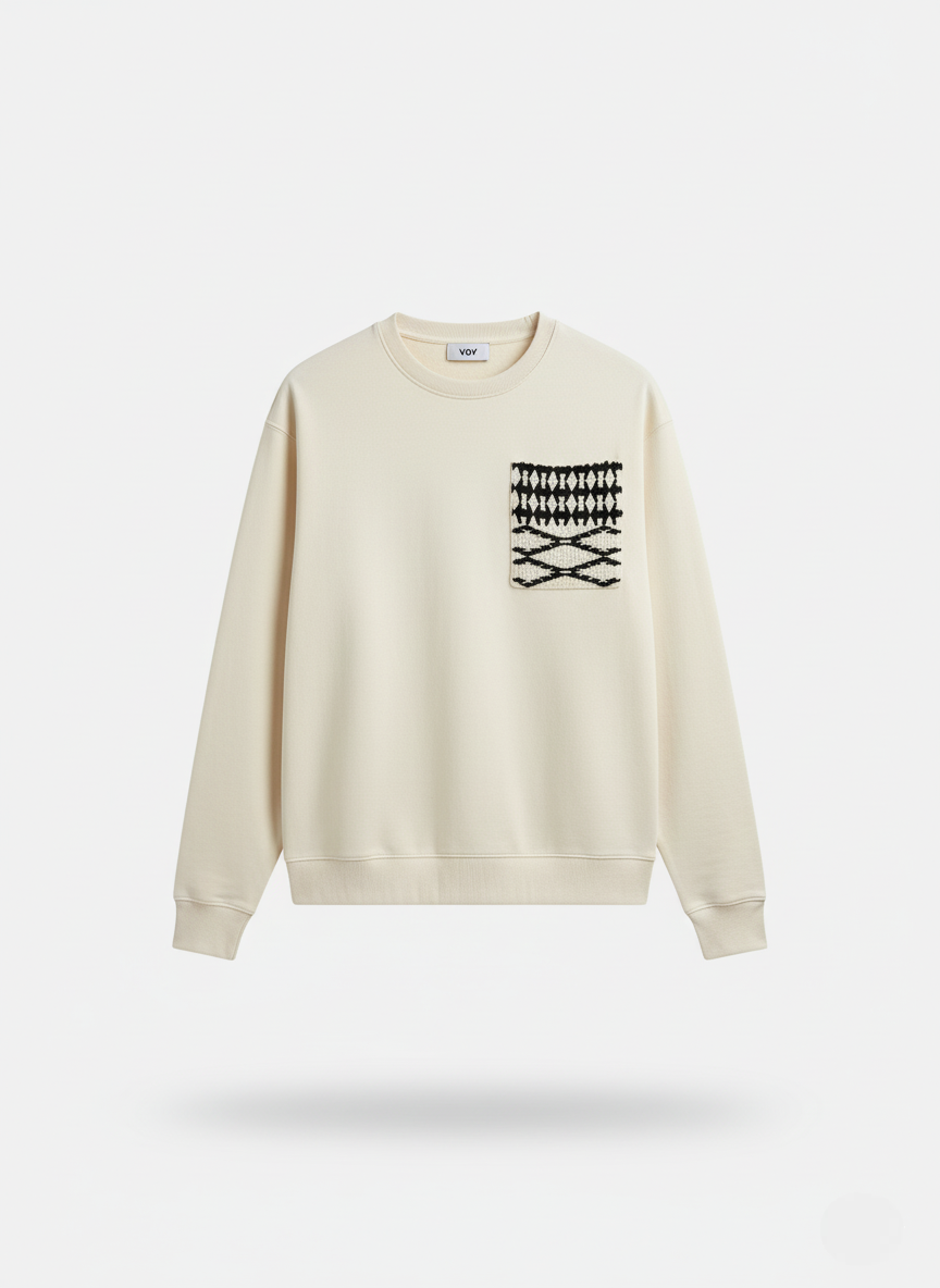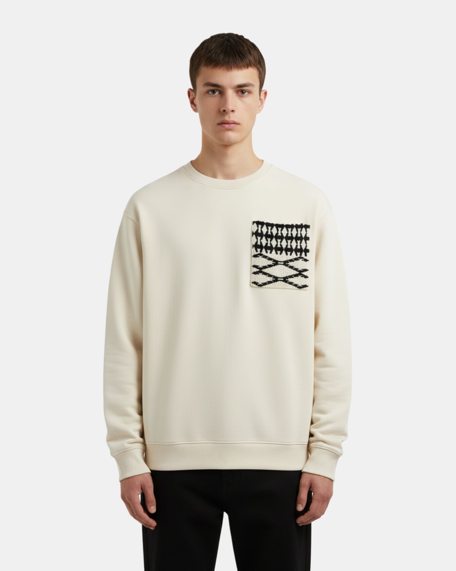 Elevate your everyday look with this off-white crewneck sweatshirt, crafted from premium mid-weight cotton for a soft and structured feel. The standout feature — a black-and-white woven pocket — adds a bold artisanal touch that contrasts effortlessly with the clean minimal base. Designed for comfort and style, it blends modern simplicity with refined detailing, making it ideal for layering or standalone wear across seasons.