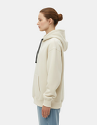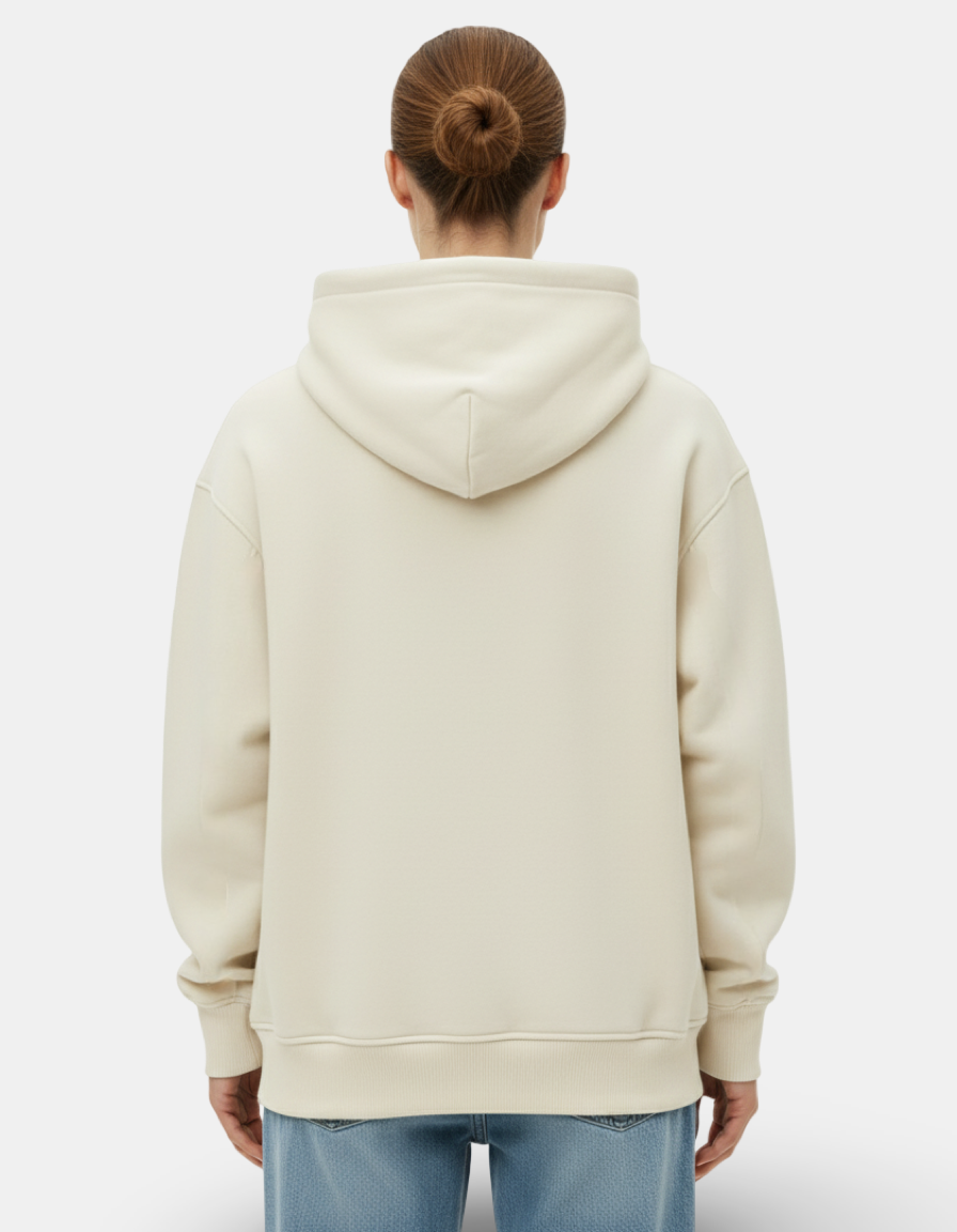 This hoodie in a rich petrol off white hue combines minimal design with ultimate comfort. Crafted from a premium mid-weight cotton-blend fabric, it offers a smooth, structured drape while remaining breathable and soft against the skin. The classic kangaroo pocket and ribbed hems provide a secure fit and functionality, while the tonal stitching enhances the clean silhouette.