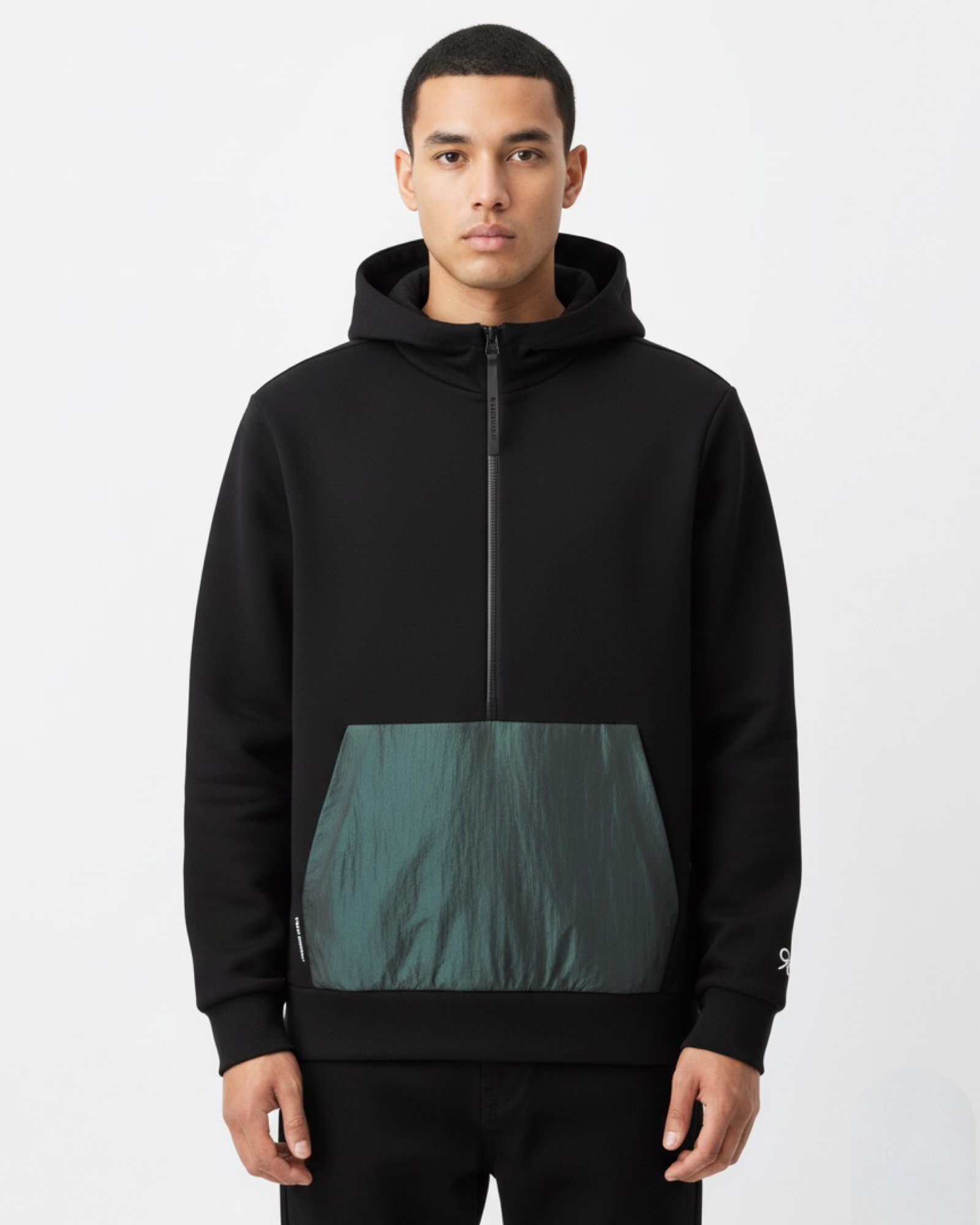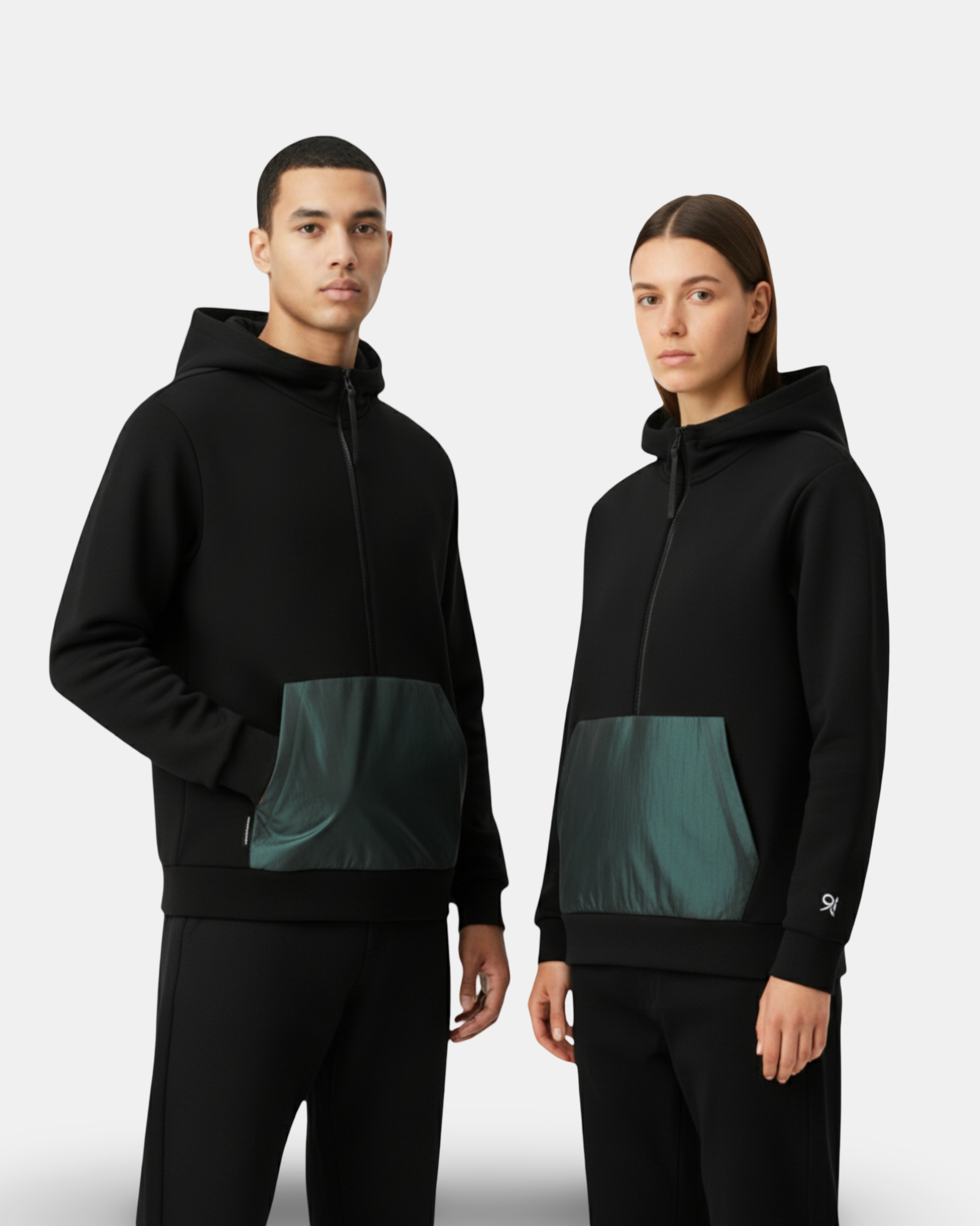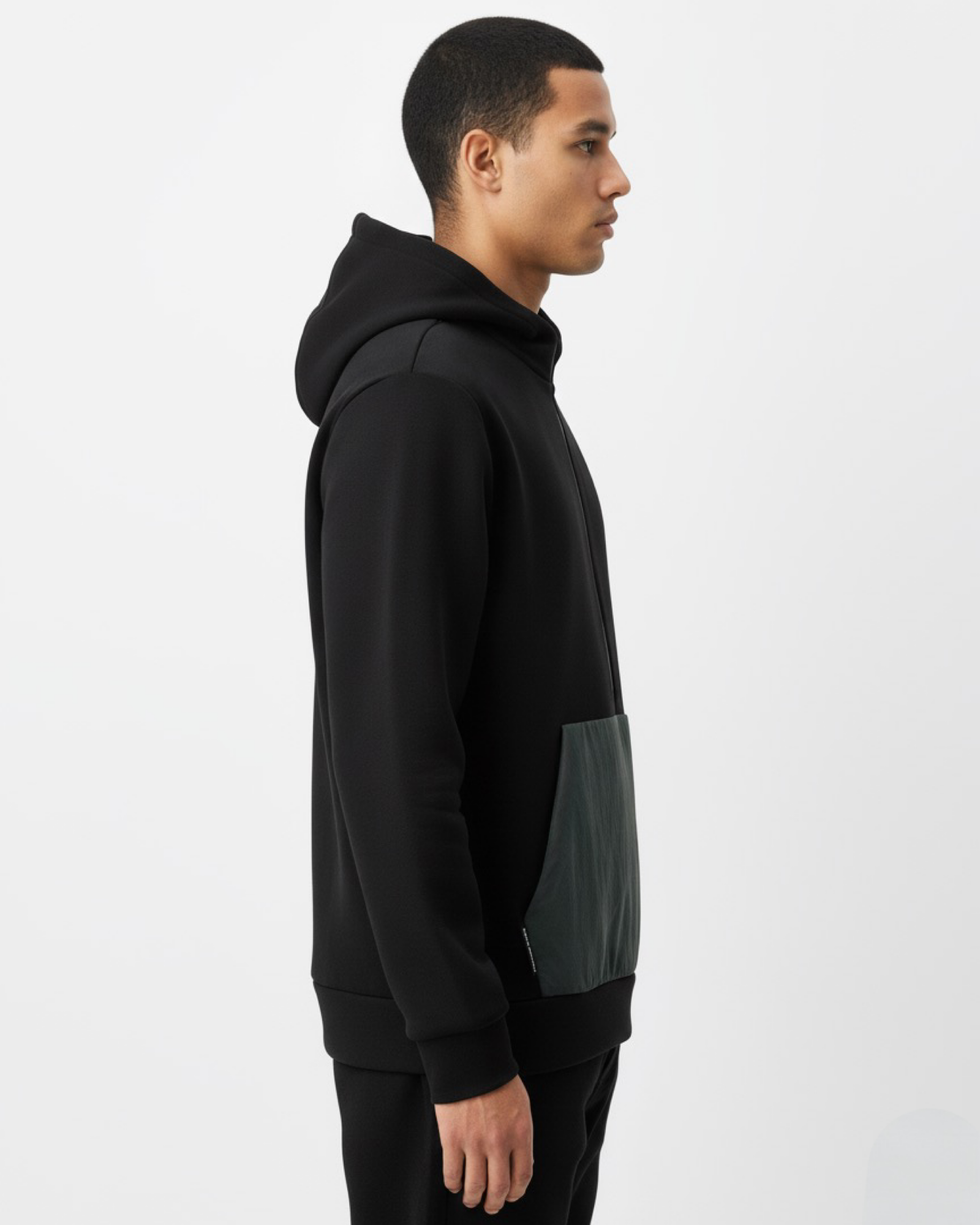 Elevate your casual wardrobe with this black zip-up hoodie, designed with a sleek modern silhouette and a standout contrast pocket. Crafted from a premium fabric blend, it combines everyday comfort with a refined streetwear edge. The technical nylon front pocket adds a stylish yet functional detail, making this hoodie a versatile piece for layering or wearing solo.