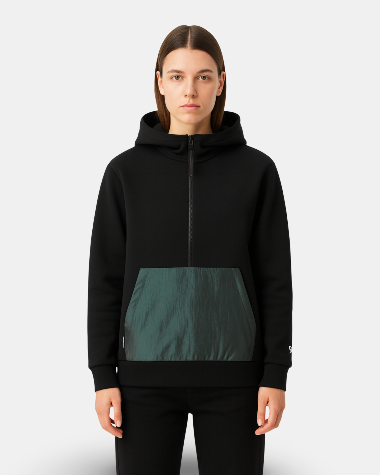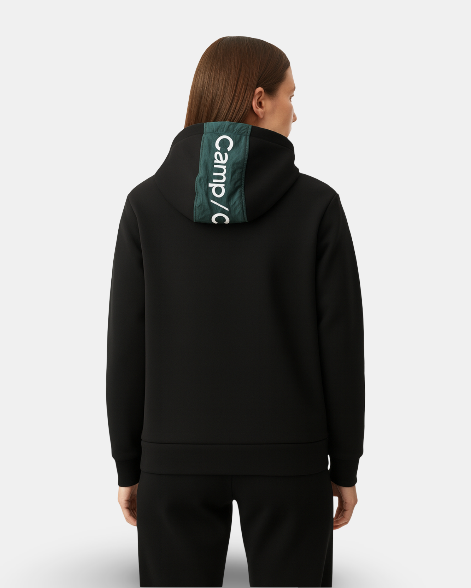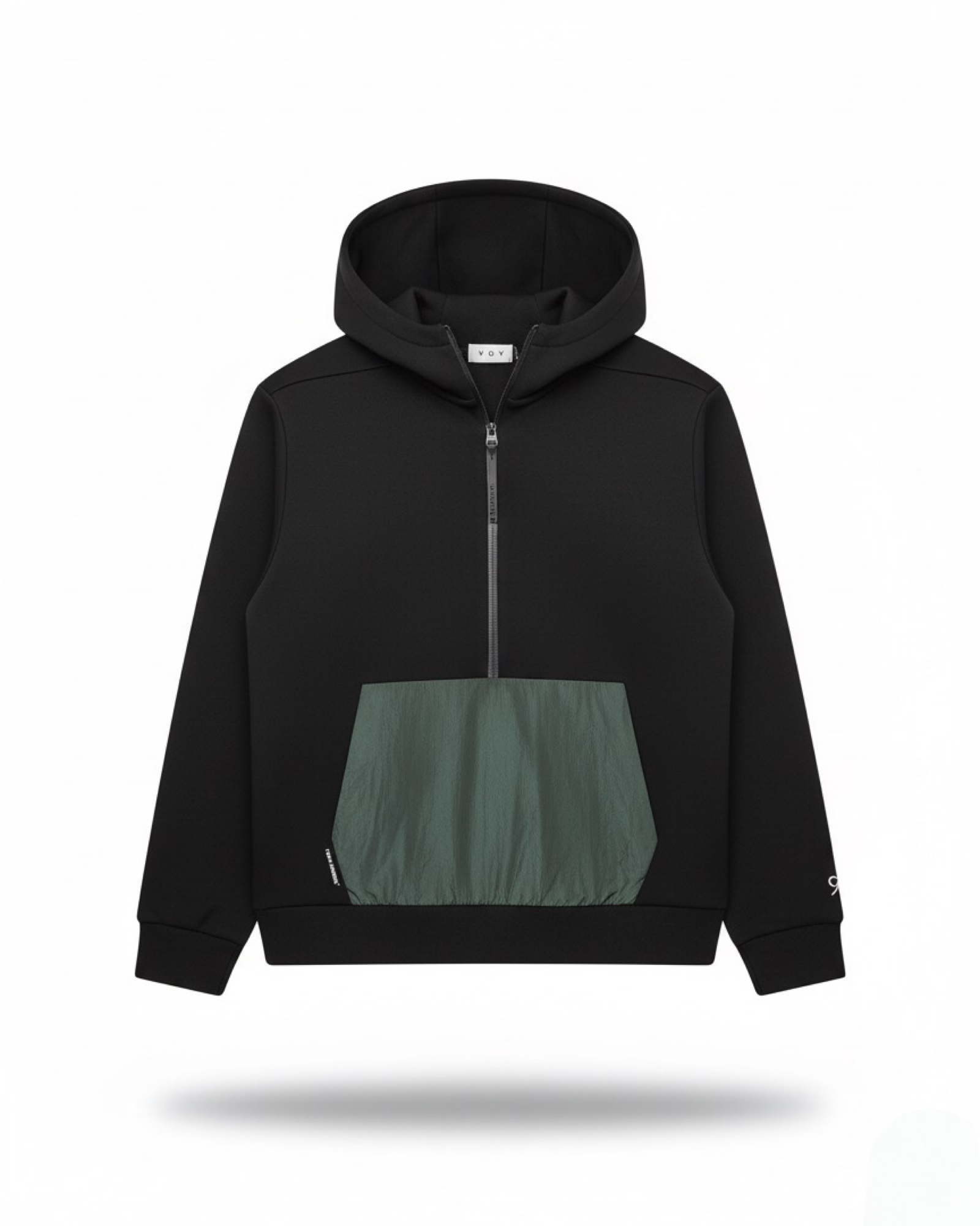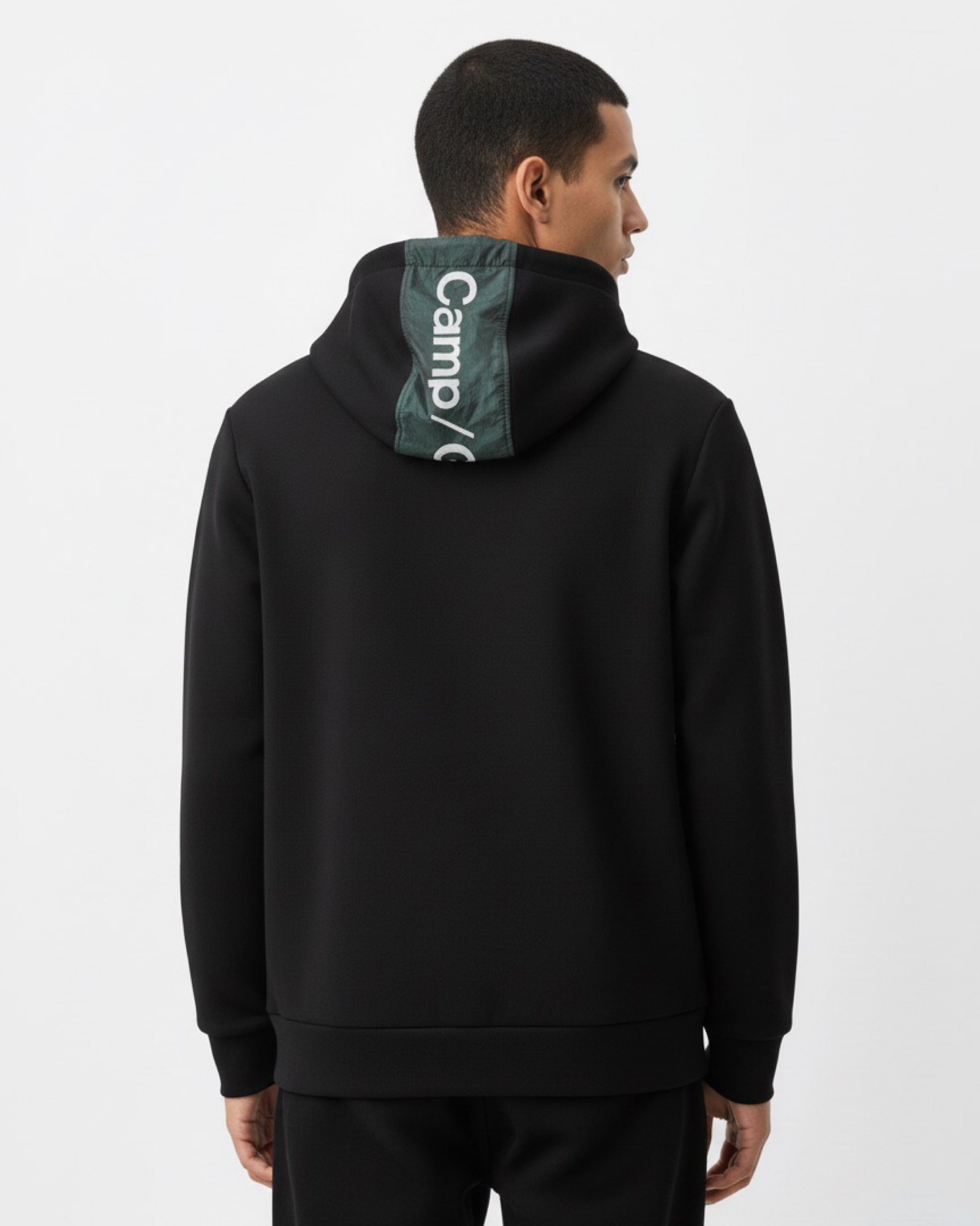 Elevate your casual wardrobe with this black zip-up hoodie, designed with a sleek modern silhouette and a standout contrast pocket. Crafted from a premium fabric blend, it combines everyday comfort with a refined streetwear edge. The technical nylon front pocket adds a stylish yet functional detail, making this hoodie a versatile piece for layering or wearing solo.