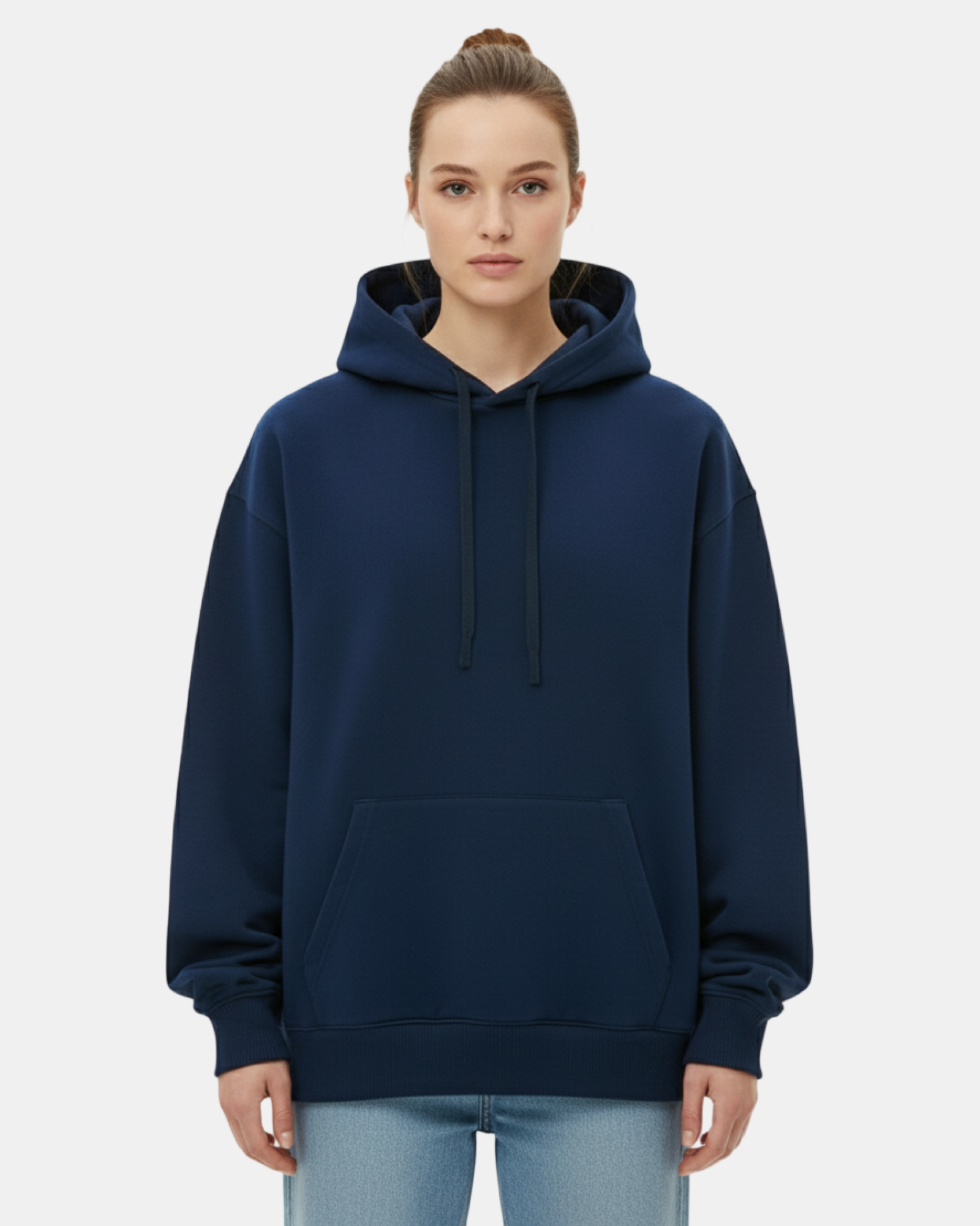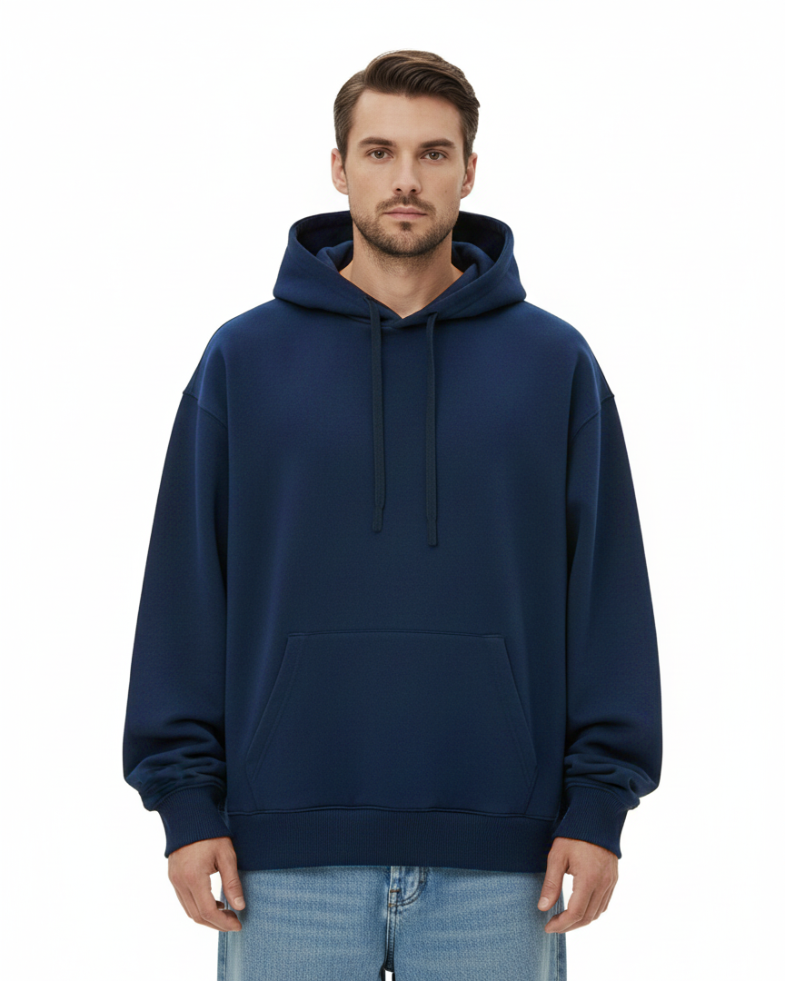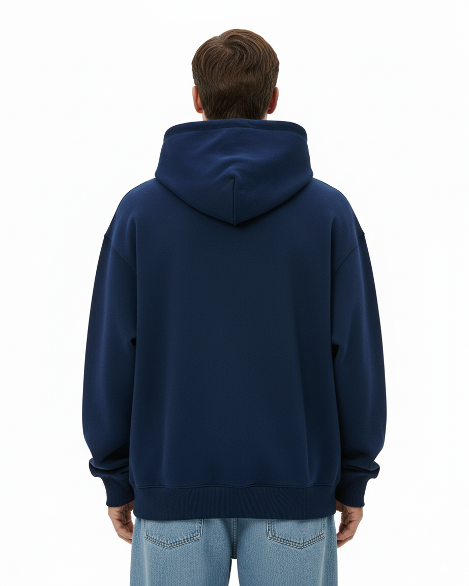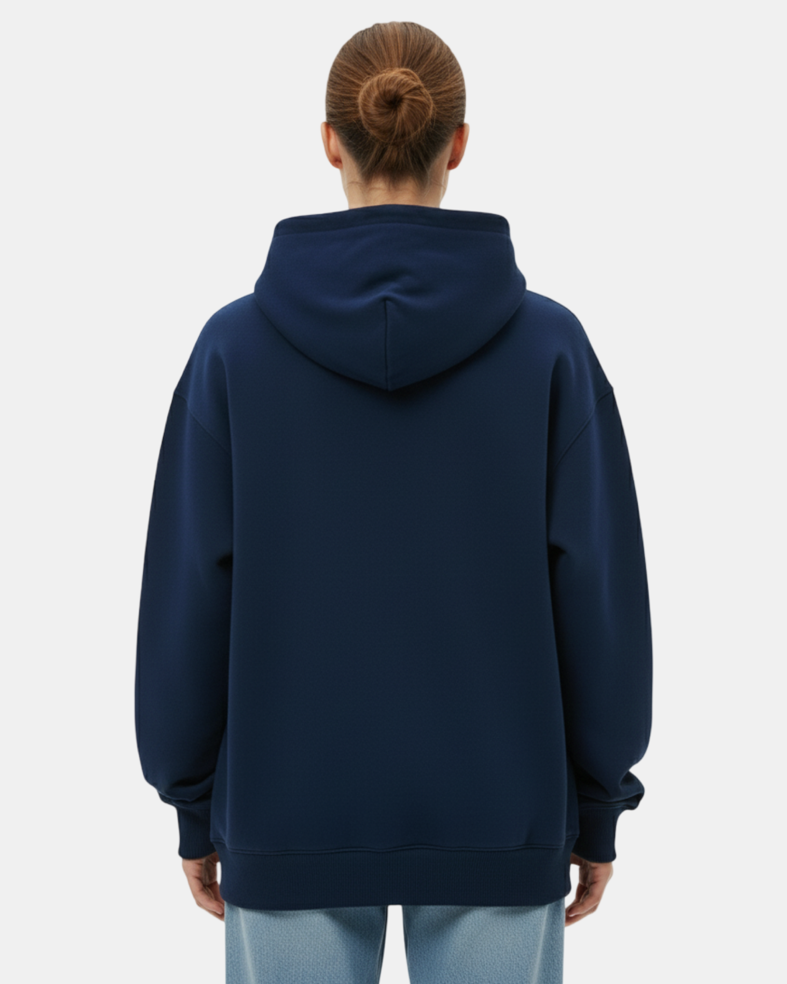 This hoodie in a rich navy hue combines minimal design with ultimate comfort. Crafted from a premium mid-weight cotton-blend fabric, it offers a smooth, structured drape while remaining breathable and soft against the skin. The classic kangaroo pocket and ribbed hems provide a secure fit and functionality, while the tonal stitching enhances the clean silhouette.