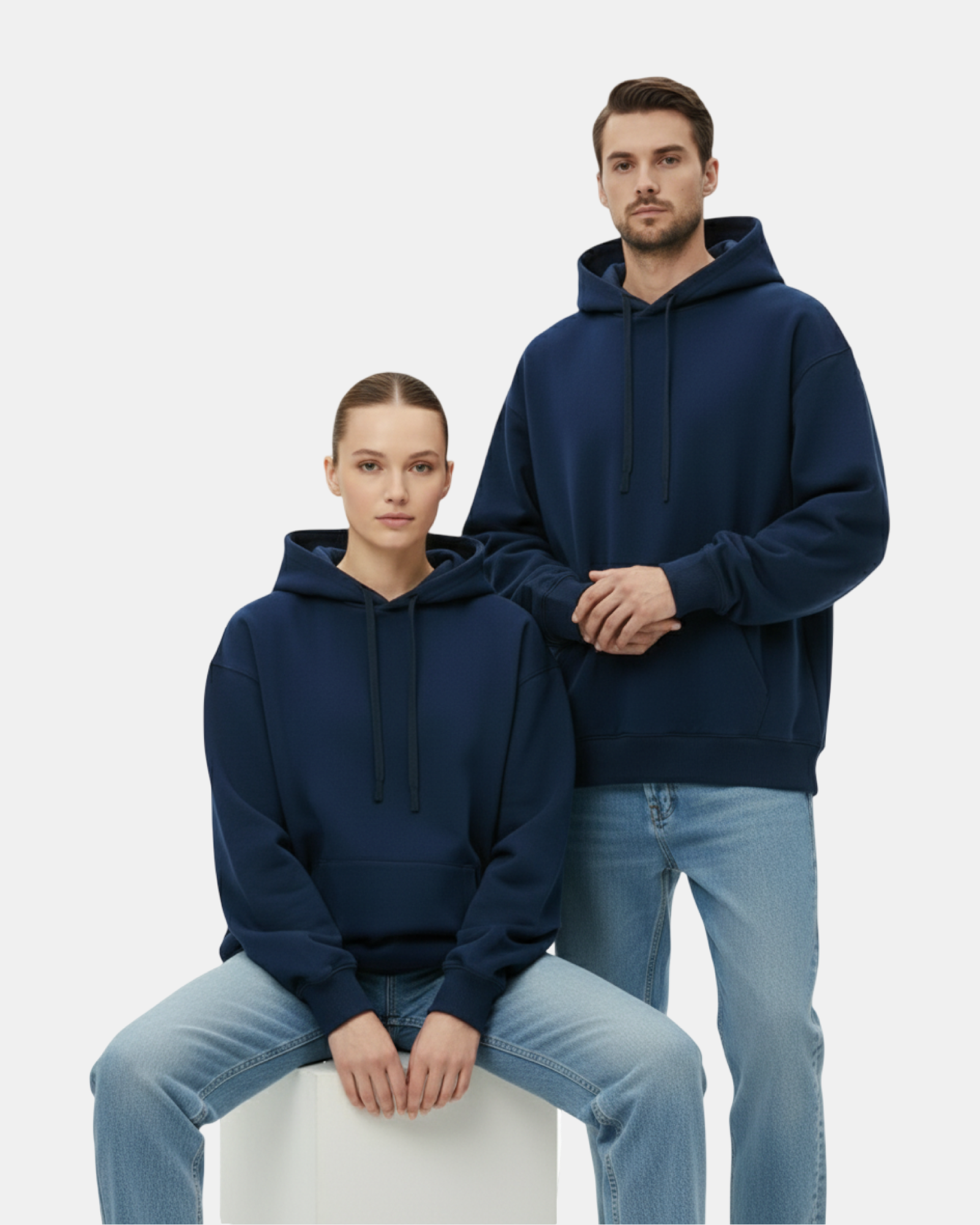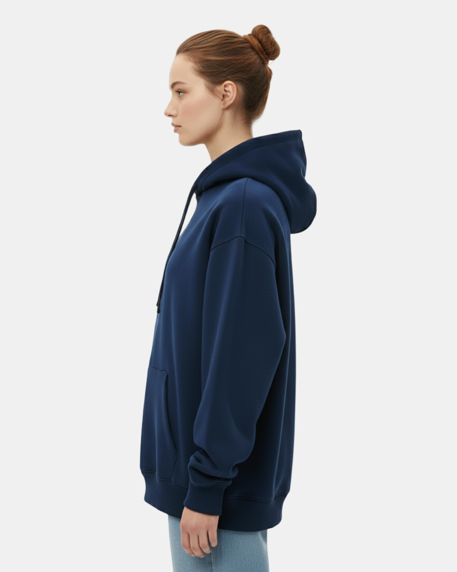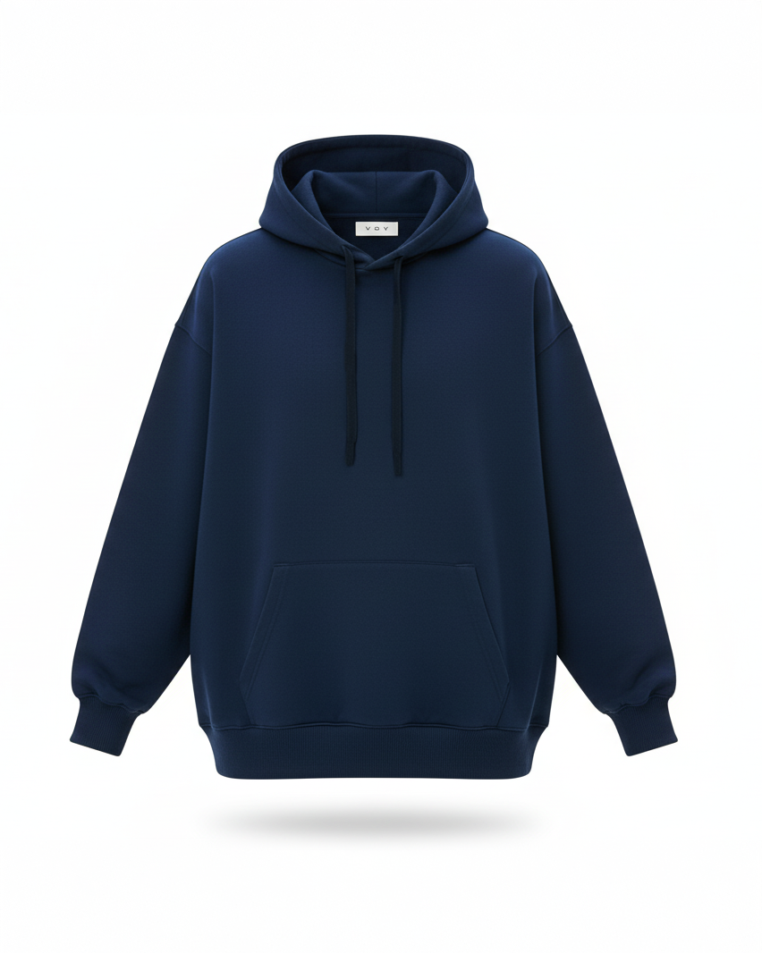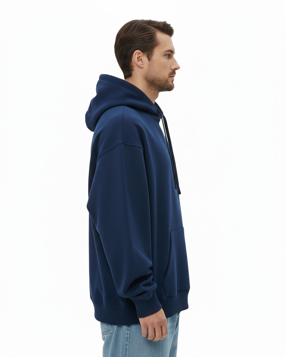 This hoodie in a rich navy hue combines minimal design with ultimate comfort. Crafted from a premium mid-weight cotton-blend fabric, it offers a smooth, structured drape while remaining breathable and soft against the skin. The classic kangaroo pocket and ribbed hems provide a secure fit and functionality, while the tonal stitching enhances the clean silhouette.